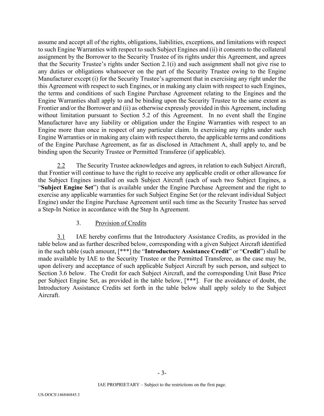- 3- IAE PROPRIETARY – Subject to the restrictions on the first page. US-DOCS\146846845.3 assume and accept all of the rights, obligations, liabilities, exceptions, and limitations with respect to such Engine Warranties with respect to such Subject Engines and (ii) it consents to the collateral assignment by the Borrower to the Security Trustee of its rights under this Agreement, and agrees that the Security Trustee’s rights under Section 2.1(i) and such assignment shall not give rise to any duties or obligations whatsoever on the part of the Security Trustee owing to the Engine Manufacturer except (i) for the Security Trustee’s agreement that in exercising any right under the this Agreement with respect to such Engines, or in making any claim with respect to such Engines, the terms and conditions of such Engine Purchase Agreement relating to the Engines and the Engine Warranties shall apply to and be binding upon the Security Trustee to the same extent as Frontier and/or the Borrower and (ii) as otherwise expressly provided in this Agreement, including without limitation pursuant to Section 5.2 of this Agreement. In no event shall the Engine Manufacturer have any liability or obligation under the Engine Warranties with respect to an Engine more than once in respect of any particular claim. In exercising any rights under such Engine Warranties or in making any claim with respect thereto, the applicable terms and conditions of the Engine Purchase Agreement, as far as disclosed in Attachment A, shall apply to, and be binding upon the Security Trustee or Permitted Transferee (if applicable). 2.2 The Security Trustee acknowledges and agrees, in relation to each Subject Aircraft, that Frontier will continue to have the right to receive any applicable credit or other allowance for the Subject Engines installed on such Subject Aircraft (each of such two Subject Engines, a “Subject Engine Set”) that is available under the Engine Purchase Agreement and the right to exercise any applicable warranties for such Subject Engine Set (or the relevant individual Subject Engine) under the Engine Purchase Agreement until such time as the Security Trustee has served a Step-In Notice in accordance with the Step In Agreement. 3. Provision of Credits 3.1 IAE hereby confirms that the Introductory Assistance Credits, as provided in the table below and as further described below, corresponding with a given Subject Aircraft identified in the such table (such amount, [***] the “Introductory Assistance Credit” or “Credit”) shall be made available by IAE to the Security Trustee or the Permitted Transferee, as the case may be, upon delivery and acceptance of such applicable Subject Aircraft by such person, and subject to Section 3.6 below. The Credit for each Subject Aircraft, and the corresponding Unit Base Price per Subject Engine Set, as provided in the table below, [***]. For the avoidance of doubt, the Introductory Assistance Credits set forth in the table below shall apply solely to the Subject Aircraft.