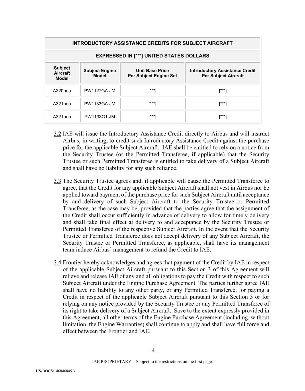 - 4- IAE PROPRIETARY – Subject to the restrictions on the first page. US-DOCS\146846845.3 INTRODUCTORY ASSISTANCE CREDITS FOR SUBJECT AIRCRAFT EXPRESSED IN [***] UNITED STATES DOLLARS Subject Aircraft Model Subject Engine Model Unit Base Price Per Subject Engine Set Introductory Assistance Credit Per Subject Aircraft A320neo PW1127GA-JM [***] [***] A321neo PW1133GA-JM [***] [***] A321neo PW1133G1-JM [***] [***] 3.2 IAE will issue the Introductory Assistance Credit directly to Airbus and will instruct Airbus, in writing, to credit such Introductory Assistance Credit against the purchase price for the applicable Subject Aircraft. IAE shall be entitled to rely on a notice from the Security Trustee (or the Permitted Transferee, if applicable) that the Security Trustee or such Permitted Transferee is entitled to take delivery of a Subject Aircraft and shall have no liability for any such reliance. 3.3 The Security Trustee agrees and, if applicable will cause the Permitted Transferee to agree, that the Credit for any applicable Subject Aircraft shall not vest in Airbus nor be applied toward payment of the purchase price for such Subject Aircraft until acceptance by and delivery of such Subject Aircraft to the Security Trustee or Permitted Transferee, as the case may be; provided that the parties agree that the assignment of the Credit shall occur sufficiently in advance of delivery to allow for timely delivery and shall take final effect at delivery to and acceptance by the Security Trustee or Permitted Transferee of the respective Subject Aircraft. In the event that the Security Trustee or Permitted Transferee does not accept delivery of any Subject Aircraft, the Security Trustee or Permitted Transferee, as applicable, shall have its management team induce Airbus’ management to refund the Credit to IAE. 3.4 Frontier hereby acknowledges and agrees that payment of the Credit by IAE in respect of the applicable Subject Aircraft pursuant to this Section 3 of this Agreement will relieve and release IAE of any and all obligations to pay the Credit with respect to such Subject Aircraft under the Engine Purchase Agreement. The parties further agree IAE shall have no liability to any other party, or any Permitted Transferee, for paying a Credit in respect of the applicable Subject Aircraft pursuant to this Section 3 or for relying on any notice provided by the Security Trustee or any Permitted Transferee of its right to take delivery of a Subject Aircraft. Save to the extent expressly provided in this Agreement, all other terms of the Engine Purchase Agreement (including, without limitation, the Engine Warranties) shall continue to apply and shall have full force and effect between the Frontier and IAE.