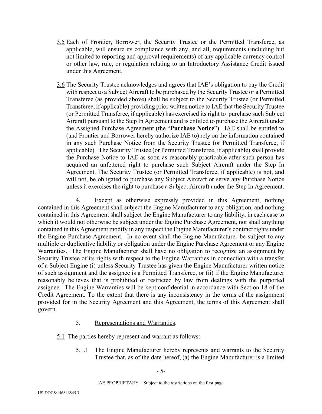 - 5- IAE PROPRIETARY – Subject to the restrictions on the first page. US-DOCS\146846845.3 3.5 Each of Frontier, Borrower, the Security Trustee or the Permitted Transferee, as applicable, will ensure its compliance with any, and all, requirements (including but not limited to reporting and approval requirements) of any applicable currency control or other law, rule, or regulation relating to an Introductory Assistance Credit issued under this Agreement. 3.6 The Security Trustee acknowledges and agrees that IAE’s obligation to pay the Credit with respect to a Subject Aircraft to be purchased by the Security Trustee or a Permitted Transferee (as provided above) shall be subject to the Security Trustee (or Permitted Transferee, if applicable) providing prior written notice to IAE that the Security Trustee (or Permitted Transferee, if applicable) has exercised its right to purchase such Subject Aircraft pursuant to the Step In Agreement and is entitled to purchase the Aircraft under the Assigned Purchase Agreement (the “Purchase Notice”). IAE shall be entitled to (and Frontier and Borrower hereby authorize IAE to) rely on the information contained in any such Purchase Notice from the Security Trustee (or Permitted Transferee, if applicable). The Security Trustee (or Permitted Transferee, if applicable) shall provide the Purchase Notice to IAE as soon as reasonably practicable after such person has acquired an unfettered right to purchase such Subject Aircraft under the Step In Agreement. The Security Trustee (or Permitted Transferee, if applicable) is not, and will not, be obligated to purchase any Subject Aircraft or serve any Purchase Notice unless it exercises the right to purchase a Subject Aircraft under the Step In Agreement. 4. Except as otherwise expressly provided in this Agreement, nothing contained in this Agreement shall subject the Engine Manufacturer to any obligation, and nothing contained in this Agreement shall subject the Engine Manufacturer to any liability, in each case to which it would not otherwise be subject under the Engine Purchase Agreement, nor shall anything contained in this Agreement modify in any respect the Engine Manufacturer’s contract rights under the Engine Purchase Agreement. In no event shall the Engine Manufacturer be subject to any multiple or duplicative liability or obligation under the Engine Purchase Agreement or any Engine Warranties. The Engine Manufacturer shall have no obligation to recognize an assignment by Security Trustee of its rights with respect to the Engine Warranties in connection with a transfer of a Subject Engine (i) unless Security Trustee has given the Engine Manufacturer written notice of such assignment and the assignee is a Permitted Transferee, or (ii) if the Engine Manufacturer reasonably believes that is prohibited or restricted by law from dealings with the purported assignee. The Engine Warranties will be kept confidential in accordance with Section 18 of the Credit Agreement. To the extent that there is any inconsistency in the terms of the assignment provided for in the Security Agreement and this Agreement, the terms of this Agreement shall govern. 5. Representations and Warranties. 5.1 The parties hereby represent and warrant as follows: 5.1.1 The Engine Manufacturer hereby represents and warrants to the Security Trustee that, as of the date hereof, (a) the Engine Manufacturer is a limited
