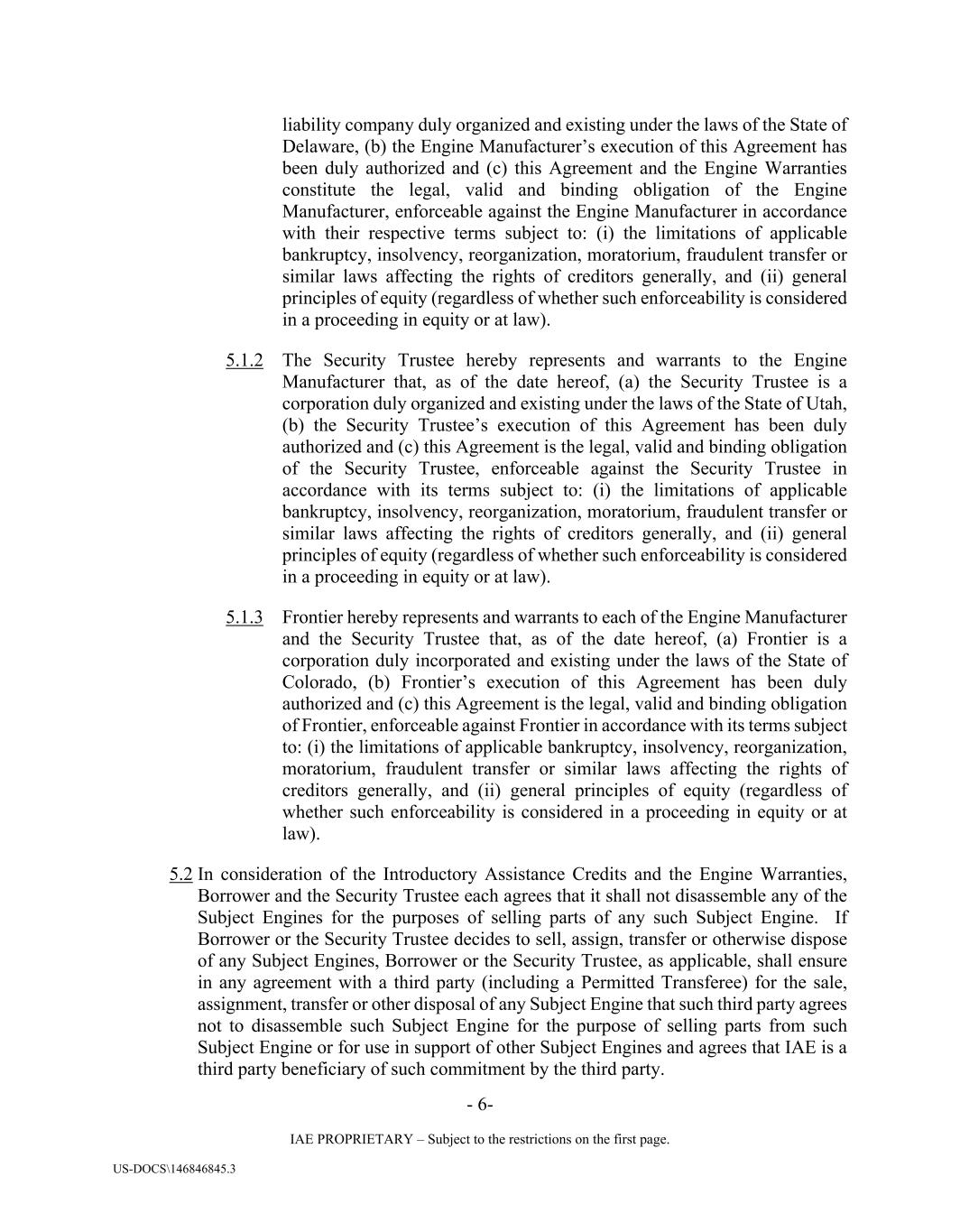 - 6- IAE PROPRIETARY – Subject to the restrictions on the first page. US-DOCS\146846845.3 liability company duly organized and existing under the laws of the State of Delaware, (b) the Engine Manufacturer’s execution of this Agreement has been duly authorized and (c) this Agreement and the Engine Warranties constitute the legal, valid and binding obligation of the Engine Manufacturer, enforceable against the Engine Manufacturer in accordance with their respective terms subject to: (i) the limitations of applicable bankruptcy, insolvency, reorganization, moratorium, fraudulent transfer or similar laws affecting the rights of creditors generally, and (ii) general principles of equity (regardless of whether such enforceability is considered in a proceeding in equity or at law). 5.1.2 The Security Trustee hereby represents and warrants to the Engine Manufacturer that, as of the date hereof, (a) the Security Trustee is a corporation duly organized and existing under the laws of the State of Utah, (b) the Security Trustee’s execution of this Agreement has been duly authorized and (c) this Agreement is the legal, valid and binding obligation of the Security Trustee, enforceable against the Security Trustee in accordance with its terms subject to: (i) the limitations of applicable bankruptcy, insolvency, reorganization, moratorium, fraudulent transfer or similar laws affecting the rights of creditors generally, and (ii) general principles of equity (regardless of whether such enforceability is considered in a proceeding in equity or at law). 5.1.3 Frontier hereby represents and warrants to each of the Engine Manufacturer and the Security Trustee that, as of the date hereof, (a) Frontier is a corporation duly incorporated and existing under the laws of the State of Colorado, (b) Frontier’s execution of this Agreement has been duly authorized and (c) this Agreement is the legal, valid and binding obligation of Frontier, enforceable against Frontier in accordance with its terms subject to: (i) the limitations of applicable bankruptcy, insolvency, reorganization, moratorium, fraudulent transfer or similar laws affecting the rights of creditors generally, and (ii) general principles of equity (regardless of whether such enforceability is considered in a proceeding in equity or at law). 5.2 In consideration of the Introductory Assistance Credits and the Engine Warranties, Borrower and the Security Trustee each agrees that it shall not disassemble any of the Subject Engines for the purposes of selling parts of any such Subject Engine. If Borrower or the Security Trustee decides to sell, assign, transfer or otherwise dispose of any Subject Engines, Borrower or the Security Trustee, as applicable, shall ensure in any agreement with a third party (including a Permitted Transferee) for the sale, assignment, transfer or other disposal of any Subject Engine that such third party agrees not to disassemble such Subject Engine for the purpose of selling parts from such Subject Engine or for use in support of other Subject Engines and agrees that IAE is a third party beneficiary of such commitment by the third party.