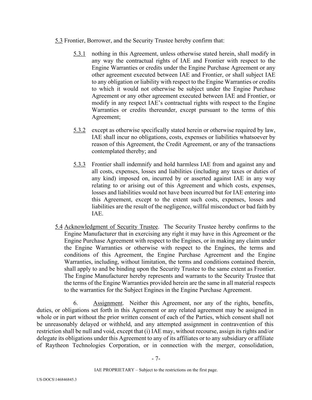- 7- IAE PROPRIETARY – Subject to the restrictions on the first page. US-DOCS\146846845.3 5.3 Frontier, Borrower, and the Security Trustee hereby confirm that: 5.3.1 nothing in this Agreement, unless otherwise stated herein, shall modify in any way the contractual rights of IAE and Frontier with respect to the Engine Warranties or credits under the Engine Purchase Agreement or any other agreement executed between IAE and Frontier, or shall subject IAE to any obligation or liability with respect to the Engine Warranties or credits to which it would not otherwise be subject under the Engine Purchase Agreement or any other agreement executed between IAE and Frontier, or modify in any respect IAE’s contractual rights with respect to the Engine Warranties or credits thereunder, except pursuant to the terms of this Agreement; 5.3.2 except as otherwise specifically stated herein or otherwise required by law, IAE shall incur no obligations, costs, expenses or liabilities whatsoever by reason of this Agreement, the Credit Agreement, or any of the transactions contemplated thereby; and 5.3.3 Frontier shall indemnify and hold harmless IAE from and against any and all costs, expenses, losses and liabilities (including any taxes or duties of any kind) imposed on, incurred by or asserted against IAE in any way relating to or arising out of this Agreement and which costs, expenses, losses and liabilities would not have been incurred but for IAE entering into this Agreement, except to the extent such costs, expenses, losses and liabilities are the result of the negligence, willful misconduct or bad faith by IAE. 5.4 Acknowledgment of Security Trustee. The Security Trustee hereby confirms to the Engine Manufacturer that in exercising any right it may have in this Agreement or the Engine Purchase Agreement with respect to the Engines, or in making any claim under the Engine Warranties or otherwise with respect to the Engines, the terms and conditions of this Agreement, the Engine Purchase Agreement and the Engine Warranties, including, without limitation, the terms and conditions contained therein, shall apply to and be binding upon the Security Trustee to the same extent as Frontier. The Engine Manufacturer hereby represents and warrants to the Security Trustee that the terms of the Engine Warranties provided herein are the same in all material respects to the warranties for the Subject Engines in the Engine Purchase Agreement. 6. Assignment. Neither this Agreement, nor any of the rights, benefits, duties, or obligations set forth in this Agreement or any related agreement may be assigned in whole or in part without the prior written consent of each of the Parties, which consent shall not be unreasonably delayed or withheld, and any attempted assignment in contravention of this restriction shall be null and void, except that (i) IAE may, without recourse, assign its rights and/or delegate its obligations under this Agreement to any of its affiliates or to any subsidiary or affiliate of Raytheon Technologies Corporation, or in connection with the merger, consolidation,