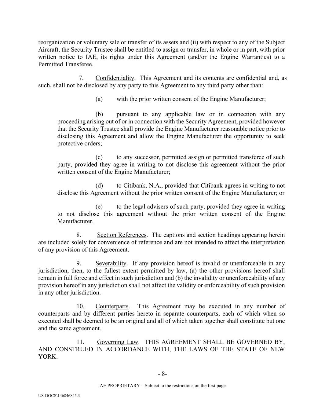 - 8- IAE PROPRIETARY – Subject to the restrictions on the first page. US-DOCS\146846845.3 reorganization or voluntary sale or transfer of its assets and (ii) with respect to any of the Subject Aircraft, the Security Trustee shall be entitled to assign or transfer, in whole or in part, with prior written notice to IAE, its rights under this Agreement (and/or the Engine Warranties) to a Permitted Transferee. 7. Confidentiality. This Agreement and its contents are confidential and, as such, shall not be disclosed by any party to this Agreement to any third party other than: (a) with the prior written consent of the Engine Manufacturer; (b) pursuant to any applicable law or in connection with any proceeding arising out of or in connection with the Security Agreement, provided however that the Security Trustee shall provide the Engine Manufacturer reasonable notice prior to disclosing this Agreement and allow the Engine Manufacturer the opportunity to seek protective orders; (c) to any successor, permitted assign or permitted transferee of such party, provided they agree in writing to not disclose this agreement without the prior written consent of the Engine Manufacturer; (d) to Citibank, N.A., provided that Citibank agrees in writing to not disclose this Agreement without the prior written consent of the Engine Manufacturer; or (e) to the legal advisers of such party, provided they agree in writing to not disclose this agreement without the prior written consent of the Engine Manufacturer. 8. Section References. The captions and section headings appearing herein are included solely for convenience of reference and are not intended to affect the interpretation of any provision of this Agreement. 9. Severability. If any provision hereof is invalid or unenforceable in any jurisdiction, then, to the fullest extent permitted by law, (a) the other provisions hereof shall remain in full force and effect in such jurisdiction and (b) the invalidity or unenforceability of any provision hereof in any jurisdiction shall not affect the validity or enforceability of such provision in any other jurisdiction. 10. Counterparts. This Agreement may be executed in any number of counterparts and by different parties hereto in separate counterparts, each of which when so executed shall be deemed to be an original and all of which taken together shall constitute but one and the same agreement. 11. Governing Law. THIS AGREEMENT SHALL BE GOVERNED BY, AND CONSTRUED IN ACCORDANCE WITH, THE LAWS OF THE STATE OF NEW YORK.