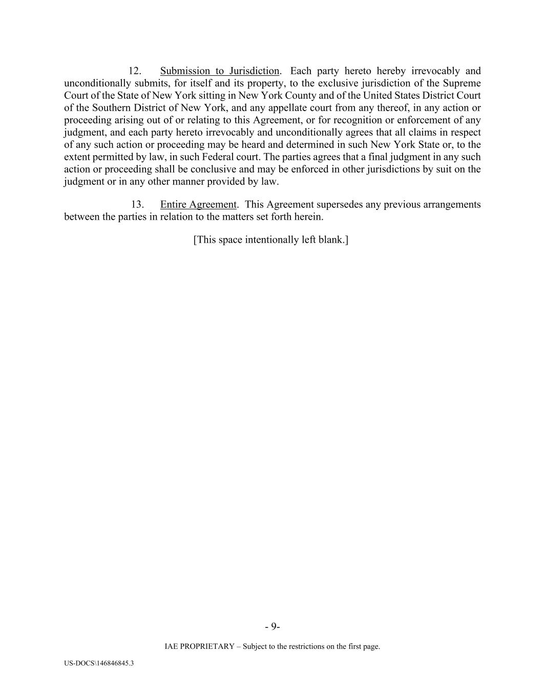 - 9- IAE PROPRIETARY – Subject to the restrictions on the first page. US-DOCS\146846845.3 12. Submission to Jurisdiction. Each party hereto hereby irrevocably and unconditionally submits, for itself and its property, to the exclusive jurisdiction of the Supreme Court of the State of New York sitting in New York County and of the United States District Court of the Southern District of New York, and any appellate court from any thereof, in any action or proceeding arising out of or relating to this Agreement, or for recognition or enforcement of any judgment, and each party hereto irrevocably and unconditionally agrees that all claims in respect of any such action or proceeding may be heard and determined in such New York State or, to the extent permitted by law, in such Federal court. The parties agrees that a final judgment in any such action or proceeding shall be conclusive and may be enforced in other jurisdictions by suit on the judgment or in any other manner provided by law. 13. Entire Agreement. This Agreement supersedes any previous arrangements between the parties in relation to the matters set forth herein. [This space intentionally left blank.]
