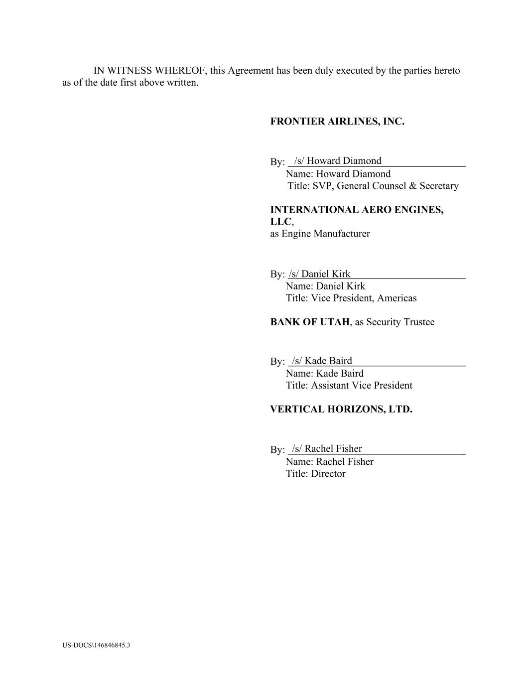 US-DOCS\146846845.3 /s/ Howard Diamond /s/ Daniel Kirk /s/ Kade Baird /s/ Rachel Fisher IN WITNESS WHEREOF, this Agreement has been duly executed by the parties hereto as of the date first above written. FRONTIER AIRLINES, INC. By: Name: Howard Diamond Title: SVP, General Counsel & Secretary INTERNATIONAL AERO ENGINES, LLC, as Engine Manufacturer By: Name: Daniel Kirk Title: Vice President, Americas BANK OF UTAH, as Security Trustee By: Name: Kade Baird Title: Assistant Vice President VERTICAL HORIZONS, LTD. By: Name: Rachel Fisher Title: Director