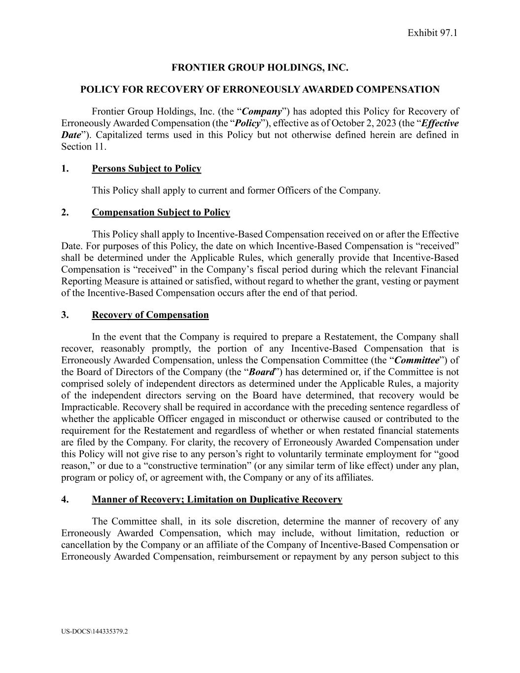 US-DOCS\144335379.2 FRONTIER GROUP HOLDINGS, INC. POLICY FOR RECOVERY OF ERRONEOUSLY AWARDED COMPENSATION Frontier Group Holdings, Inc. (the “Company”) has adopted this Policy for Recovery of Erroneously Awarded Compensation (the “Policy”), effective as of October 2, 2023 (the “Effective Date”). Capitalized terms used in this Policy but not otherwise defined herein are defined in Section 11. 1. Persons Subject to Policy This Policy shall apply to current and former Officers of the Company. 2. Compensation Subject to Policy This Policy shall apply to Incentive-Based Compensation received on or after the Effective Date. For purposes of this Policy, the date on which Incentive-Based Compensation is “received” shall be determined under the Applicable Rules, which generally provide that Incentive-Based Compensation is “received” in the Company’s fiscal period during which the relevant Financial Reporting Measure is attained or satisfied, without regard to whether the grant, vesting or payment of the Incentive-Based Compensation occurs after the end of that period. 3. Recovery of Compensation In the event that the Company is required to prepare a Restatement, the Company shall recover, reasonably promptly, the portion of any Incentive-Based Compensation that is Erroneously Awarded Compensation, unless the Compensation Committee (the “Committee”) of the Board of Directors of the Company (the “Board”) has determined or, if the Committee is not comprised solely of independent directors as determined under the Applicable Rules, a majority of the independent directors serving on the Board have determined, that recovery would be Impracticable. Recovery shall be required in accordance with the preceding sentence regardless of whether the applicable Officer engaged in misconduct or otherwise caused or contributed to the requirement for the Restatement and regardless of whether or when restated financial statements are filed by the Company. For clarity, the recovery of Erroneously Awarded Compensation under this Policy will not give rise to any person’s right to voluntarily terminate employment for “good reason,” or due to a “constructive termination” (or any similar term of like effect) under any plan, program or policy of, or agreement with, the Company or any of its affiliates. 4. Manner of Recovery; Limitation on Duplicative Recovery The Committee shall, in its sole discretion, determine the manner of recovery of any Erroneously Awarded Compensation, which may include, without limitation, reduction or cancellation by the Company or an affiliate of the Company of Incentive-Based Compensation or Erroneously Awarded Compensation, reimbursement or repayment by any person subject to this Exhibit 97.1