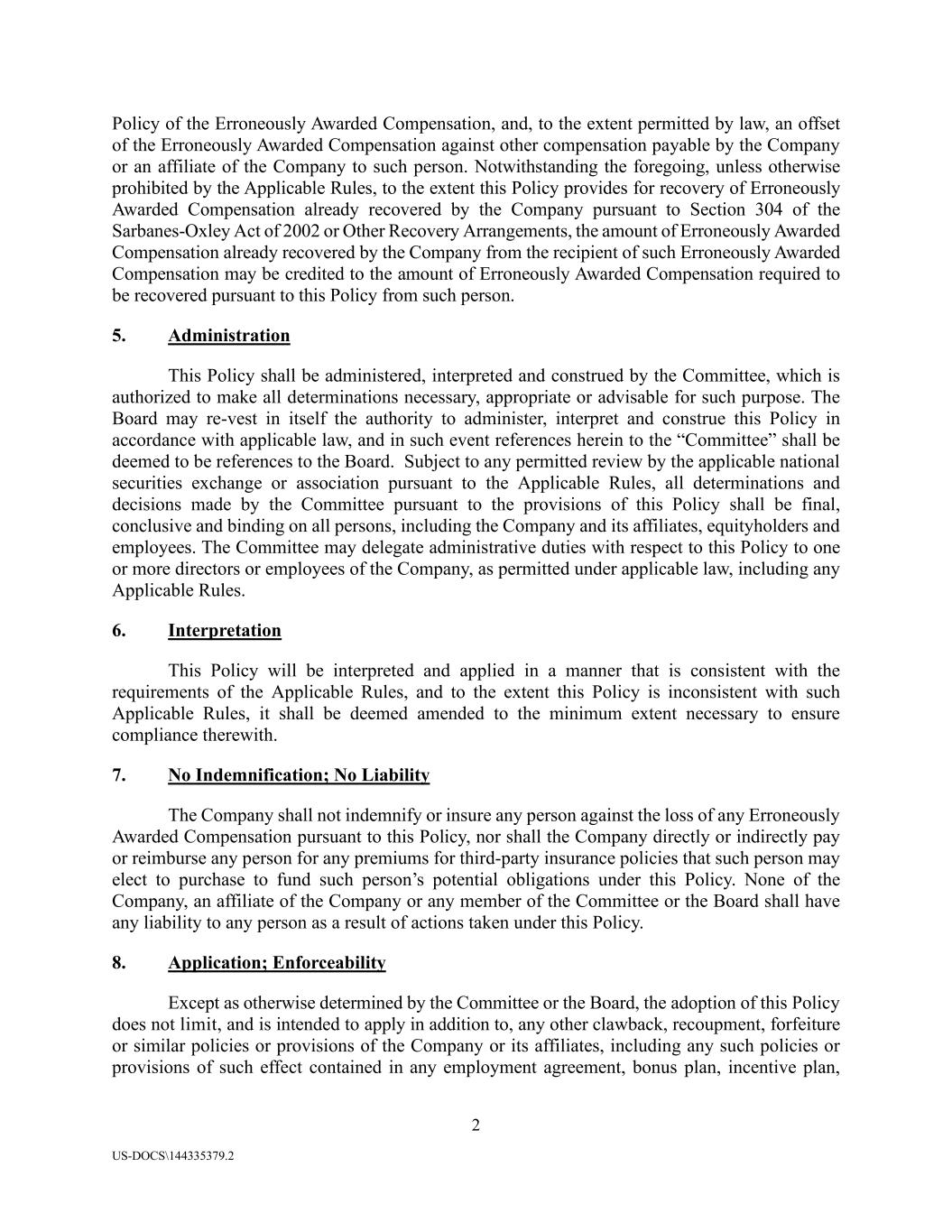 2 US-DOCS\144335379.2 Policy of the Erroneously Awarded Compensation, and, to the extent permitted by law, an offset of the Erroneously Awarded Compensation against other compensation payable by the Company or an affiliate of the Company to such person. Notwithstanding the foregoing, unless otherwise prohibited by the Applicable Rules, to the extent this Policy provides for recovery of Erroneously Awarded Compensation already recovered by the Company pursuant to Section 304 of the Sarbanes-Oxley Act of 2002 or Other Recovery Arrangements, the amount of Erroneously Awarded Compensation already recovered by the Company from the recipient of such Erroneously Awarded Compensation may be credited to the amount of Erroneously Awarded Compensation required to be recovered pursuant to this Policy from such person. 5. Administration This Policy shall be administered, interpreted and construed by the Committee, which is authorized to make all determinations necessary, appropriate or advisable for such purpose. The Board may re-vest in itself the authority to administer, interpret and construe this Policy in accordance with applicable law, and in such event references herein to the “Committee” shall be deemed to be references to the Board. Subject to any permitted review by the applicable national securities exchange or association pursuant to the Applicable Rules, all determinations and decisions made by the Committee pursuant to the provisions of this Policy shall be final, conclusive and binding on all persons, including the Company and its affiliates, equityholders and employees. The Committee may delegate administrative duties with respect to this Policy to one or more directors or employees of the Company, as permitted under applicable law, including any Applicable Rules. 6. Interpretation This Policy will be interpreted and applied in a manner that is consistent with the requirements of the Applicable Rules, and to the extent this Policy is inconsistent with such Applicable Rules, it shall be deemed amended to the minimum extent necessary to ensure compliance therewith. 7. No Indemnification; No Liability The Company shall not indemnify or insure any person against the loss of any Erroneously Awarded Compensation pursuant to this Policy, nor shall the Company directly or indirectly pay or reimburse any person for any premiums for third-party insurance policies that such person may elect to purchase to fund such person’s potential obligations under this Policy. None of the Company, an affiliate of the Company or any member of the Committee or the Board shall have any liability to any person as a result of actions taken under this Policy. 8. Application; Enforceability Except as otherwise determined by the Committee or the Board, the adoption of this Policy does not limit, and is intended to apply in addition to, any other clawback, recoupment, forfeiture or similar policies or provisions of the Company or its affiliates, including any such policies or provisions of such effect contained in any employment agreement, bonus plan, incentive plan,