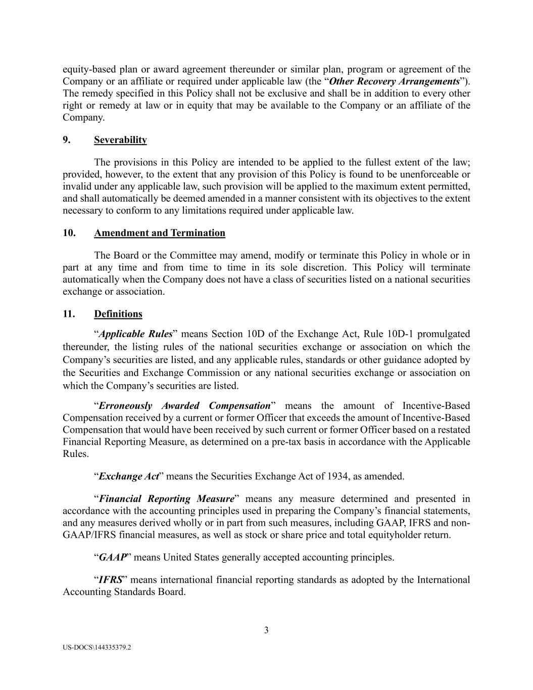 3 US-DOCS\144335379.2 equity-based plan or award agreement thereunder or similar plan, program or agreement of the Company or an affiliate or required under applicable law (the “Other Recovery Arrangements”). The remedy specified in this Policy shall not be exclusive and shall be in addition to every other right or remedy at law or in equity that may be available to the Company or an affiliate of the Company. 9. Severability The provisions in this Policy are intended to be applied to the fullest extent of the law; provided, however, to the extent that any provision of this Policy is found to be unenforceable or invalid under any applicable law, such provision will be applied to the maximum extent permitted, and shall automatically be deemed amended in a manner consistent with its objectives to the extent necessary to conform to any limitations required under applicable law. 10. Amendment and Termination The Board or the Committee may amend, modify or terminate this Policy in whole or in part at any time and from time to time in its sole discretion. This Policy will terminate automatically when the Company does not have a class of securities listed on a national securities exchange or association. 11. Definitions “Applicable Rules” means Section 10D of the Exchange Act, Rule 10D-1 promulgated thereunder, the listing rules of the national securities exchange or association on which the Company’s securities are listed, and any applicable rules, standards or other guidance adopted by the Securities and Exchange Commission or any national securities exchange or association on which the Company’s securities are listed. “Erroneously Awarded Compensation” means the amount of Incentive-Based Compensation received by a current or former Officer that exceeds the amount of Incentive-Based Compensation that would have been received by such current or former Officer based on a restated Financial Reporting Measure, as determined on a pre-tax basis in accordance with the Applicable Rules. “Exchange Act” means the Securities Exchange Act of 1934, as amended. “Financial Reporting Measure” means any measure determined and presented in accordance with the accounting principles used in preparing the Company’s financial statements, and any measures derived wholly or in part from such measures, including GAAP, IFRS and non- GAAP/IFRS financial measures, as well as stock or share price and total equityholder return. “GAAP” means United States generally accepted accounting principles. “IFRS” means international financial reporting standards as adopted by the International Accounting Standards Board.