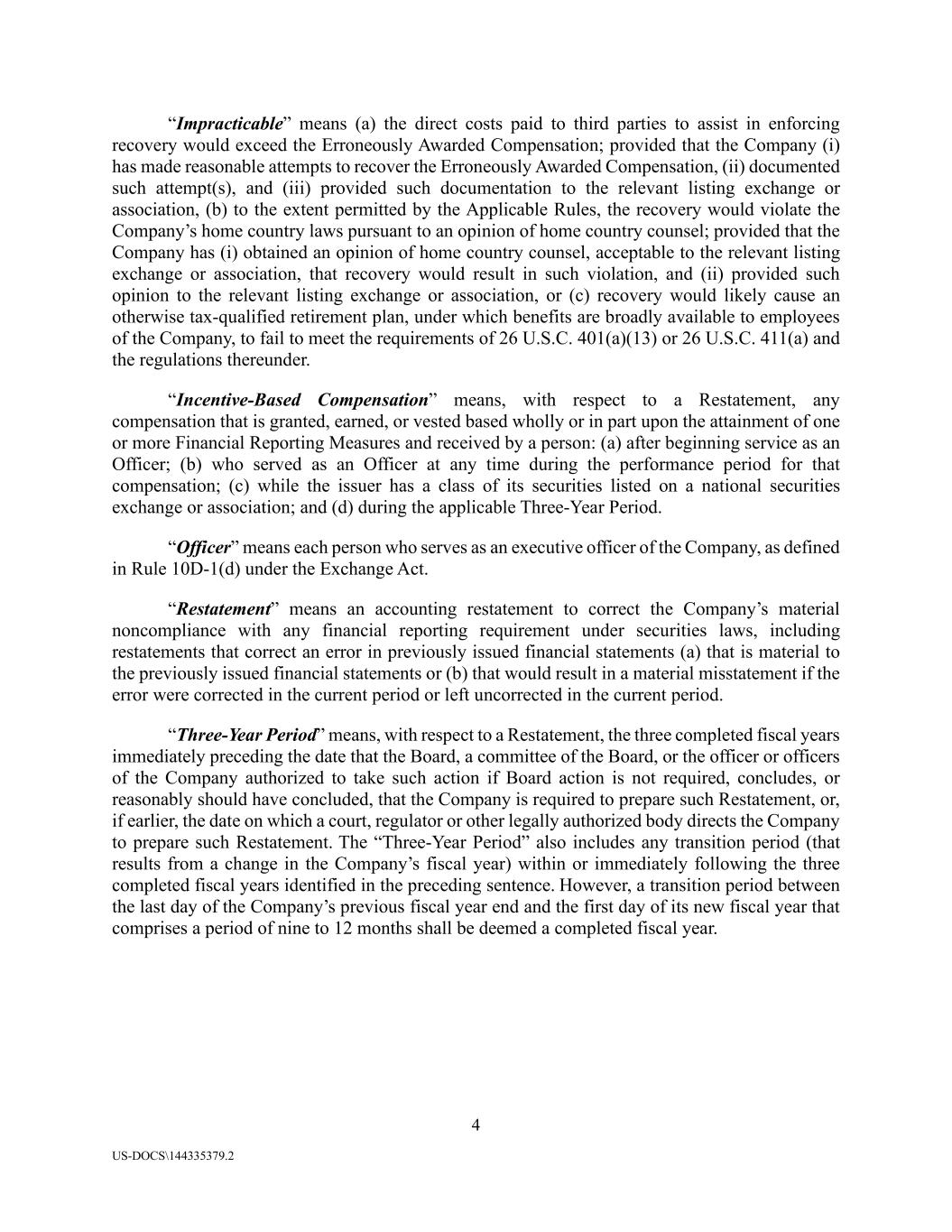 4 US-DOCS\144335379.2 “Impracticable” means (a) the direct costs paid to third parties to assist in enforcing recovery would exceed the Erroneously Awarded Compensation; provided that the Company (i) has made reasonable attempts to recover the Erroneously Awarded Compensation, (ii) documented such attempt(s), and (iii) provided such documentation to the relevant listing exchange or association, (b) to the extent permitted by the Applicable Rules, the recovery would violate the Company’s home country laws pursuant to an opinion of home country counsel; provided that the Company has (i) obtained an opinion of home country counsel, acceptable to the relevant listing exchange or association, that recovery would result in such violation, and (ii) provided such opinion to the relevant listing exchange or association, or (c) recovery would likely cause an otherwise tax-qualified retirement plan, under which benefits are broadly available to employees of the Company, to fail to meet the requirements of 26 U.S.C. 401(a)(13) or 26 U.S.C. 411(a) and the regulations thereunder. “Incentive-Based Compensation” means, with respect to a Restatement, any compensation that is granted, earned, or vested based wholly or in part upon the attainment of one or more Financial Reporting Measures and received by a person: (a) after beginning service as an Officer; (b) who served as an Officer at any time during the performance period for that compensation; (c) while the issuer has a class of its securities listed on a national securities exchange or association; and (d) during the applicable Three-Year Period. “Officer” means each person who serves as an executive officer of the Company, as defined in Rule 10D-1(d) under the Exchange Act. “Restatement” means an accounting restatement to correct the Company’s material noncompliance with any financial reporting requirement under securities laws, including restatements that correct an error in previously issued financial statements (a) that is material to the previously issued financial statements or (b) that would result in a material misstatement if the error were corrected in the current period or left uncorrected in the current period. “Three-Year Period” means, with respect to a Restatement, the three completed fiscal years immediately preceding the date that the Board, a committee of the Board, or the officer or officers of the Company authorized to take such action if Board action is not required, concludes, or reasonably should have concluded, that the Company is required to prepare such Restatement, or, if earlier, the date on which a court, regulator or other legally authorized body directs the Company to prepare such Restatement. The “Three-Year Period” also includes any transition period (that results from a change in the Company’s fiscal year) within or immediately following the three completed fiscal years identified in the preceding sentence. However, a transition period between the last day of the Company’s previous fiscal year end and the first day of its new fiscal year that comprises a period of nine to 12 months shall be deemed a completed fiscal year.