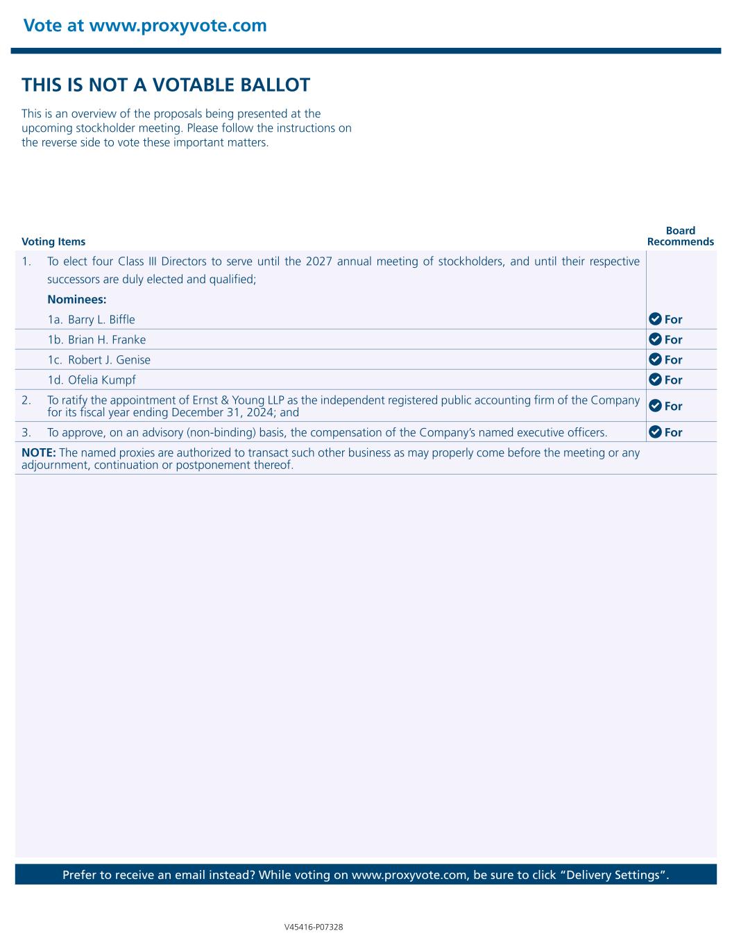 Prefer to receive an email instead? While voting on www.proxyvote.com, be sure to click “Delivery Settings”. Voting Items Board Recommends THIS IS NOT A VOTABLE BALLOT This is an overview of the proposals being presented at the upcoming stockholder meeting. Please follow the instructions on the reverse side to vote these important matters. Vote at www.proxyvote.com V45416-P07328 1. To elect four Class III Directors to serve until the 2027 annual meeting of stockholders, and until their respective successors are duly elected and qualified; Nominees: 1a. Barry L. Biffle For 1b. Brian H. Franke For 1c. Robert J. Genise For 1d. Ofelia Kumpf For 2. To ratify the appointment of Ernst & Young LLP as the independent registered public accounting firm of the Company for its fiscal year ending December 31, 2024; and For 3. To approve, on an advisory (non-binding) basis, the compensation of the Company’s named executive officers. For NOTE: The named proxies are authorized to transact such other business as may properly come before the meeting or any adjournment, continuation or postponement thereof.