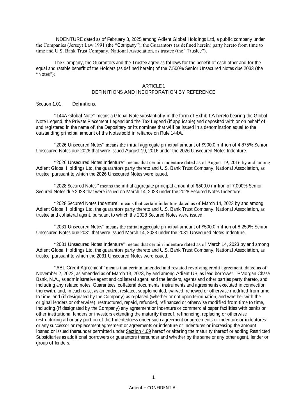 1 Adient – CONFIDENTIAL INDENTURE dated as of February 3, 2025 among Adient Global Holdings Ltd, a public company under the Companies (Jersey) Law 1991 (the “Company”), the Guarantors (as defined herein) party hereto from time to time and U.S. Bank Trust Company, National Association, as trustee (the “Trustee”). The Company, the Guarantors and the Trustee agree as follows for the benefit of each other and for the equal and ratable benefit of the Holders (as defined herein) of the 7.500% Senior Unsecured Notes due 2033 (the “Notes”): ARTICLE 1 DEFINITIONS AND INCORPORATION BY REFERENCE Section 1.01 Definitions. “144A Global Note” means a Global Note substantially in the form of Exhibit A hereto bearing the Global Note Legend, the Private Placement Legend and the Tax Legend (if applicable) and deposited with or on behalf of, and registered in the name of, the Depositary or its nominee that will be issued in a denomination equal to the outstanding principal amount of the Notes sold in reliance on Rule 144A. “2026 Unsecured Notes” means the initial aggregate principal amount of $900.0 million of 4.875% Senior Unsecured Notes due 2026 that were issued August 19, 2016 under the 2026 Unsecured Notes Indenture. “2026 Unsecured Notes Indenture” means that certain indenture dated as of August 19, 2016 by and among Adient Global Holdings Ltd, the guarantors party thereto and U.S. Bank Trust Company, National Association, as trustee, pursuant to which the 2026 Unsecured Notes were issued. “2028 Secured Notes” means the initial aggregate principal amount of $500.0 million of 7.000% Senior Secured Notes due 2028 that were issued on March 14, 2023 under the 2028 Secured Notes Indenture. “2028 Secured Notes Indenture” means that certain indenture dated as of March 14, 2023 by and among Adient Global Holdings Ltd, the guarantors party thereto and U.S. Bank Trust Company, National Association, as trustee and collateral agent, pursuant to which the 2028 Secured Notes were issued. “2031 Unsecured Notes” means the initial aggregate principal amount of $500.0 million of 8.250% Senior Unsecured Notes due 2031 that were issued March 14, 2023 under the 2031 Unsecured Notes Indenture. “2031 Unsecured Notes Indenture” means that certain indenture dated as of March 14, 2023 by and among Adient Global Holdings Ltd, the guarantors party thereto and U.S. Bank Trust Company, National Association, as trustee, pursuant to which the 2031 Unsecured Notes were issued. “ABL Credit Agreement” means that certain amended and restated revolving credit agreement, dated as of November 2, 2022, as amended as of March 13, 2023, by and among Adient US, as lead borrower, JPMorgan Chase Bank, N.A., as administrative agent and collateral agent, and the lenders, agents and other parties party thereto, and including any related notes, Guarantees, collateral documents, instruments and agreements executed in connection therewith, and, in each case, as amended, restated, supplemented, waived, renewed or otherwise modified from time to time, and (if designated by the Company) as replaced (whether or not upon termination, and whether with the original lenders or otherwise), restructured, repaid, refunded, refinanced or otherwise modified from time to time, including (if designated by the Company) any agreement or indenture or commercial paper facilities with banks or other institutional lenders or investors extending the maturity thereof, refinancing, replacing or otherwise restructuring all or any portion of the Indebtedness under such agreement or agreements or indenture or indentures or any successor or replacement agreement or agreements or indenture or indentures or increasing the amount loaned or issued thereunder permitted under Section 4.09 hereof or altering the maturity thereof or adding Restricted Subsidiaries as additional borrowers or guarantors thereunder and whether by the same or any other agent, lender or group of lenders.
