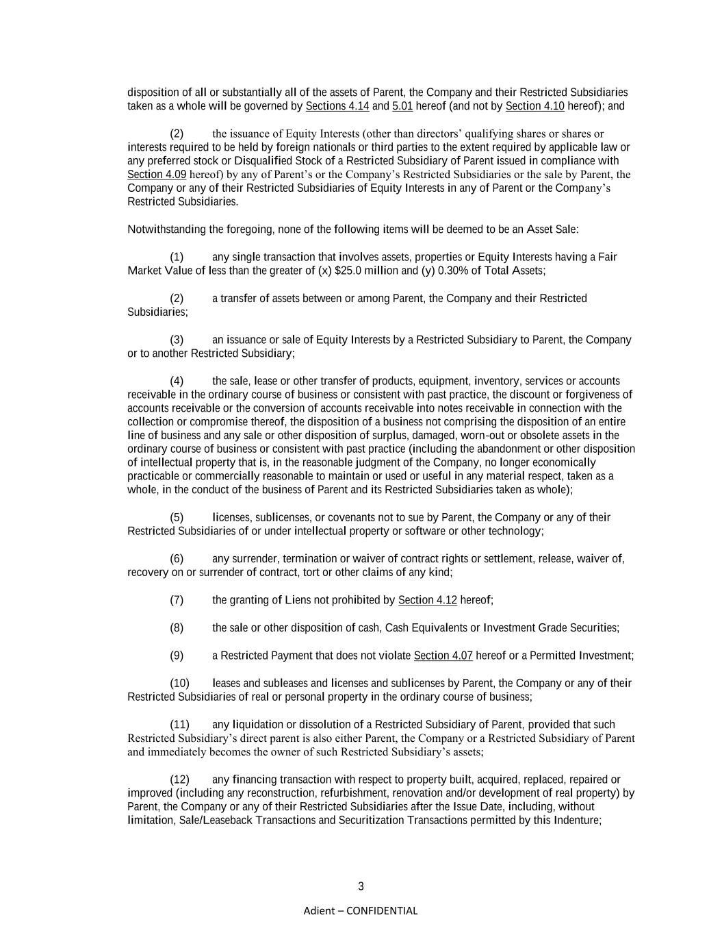 3 Adient – CONFIDENTIAL disposition of all or substantially all of the assets of Parent, the Company and their Restricted Subsidiaries taken as a whole will be governed by Sections 4.14 and 5.01 hereof (and not by Section 4.10 hereof); and (2) the issuance of Equity Interests (other than directors’ qualifying shares or shares or interests required to be held by foreign nationals or third parties to the extent required by applicable law or any preferred stock or Disqualified Stock of a Restricted Subsidiary of Parent issued in compliance with Section 4.09 hereof) by any of Parent’s or the Company’s Restricted Subsidiaries or the sale by Parent, the Company or any of their Restricted Subsidiaries of Equity Interests in any of Parent or the Company’s Restricted Subsidiaries. Notwithstanding the foregoing, none of the following items will be deemed to be an Asset Sale: (1) any single transaction that involves assets, properties or Equity Interests having a Fair Market Value of less than the greater of (x) $25.0 million and (y) 0.30% of Total Assets; (2) a transfer of assets between or among Parent, the Company and their Restricted Subsidiaries; (3) an issuance or sale of Equity Interests by a Restricted Subsidiary to Parent, the Company or to another Restricted Subsidiary; (4) the sale, lease or other transfer of products, equipment, inventory, services or accounts receivable in the ordinary course of business or consistent with past practice, the discount or forgiveness of accounts receivable or the conversion of accounts receivable into notes receivable in connection with the collection or compromise thereof, the disposition of a business not comprising the disposition of an entire line of business and any sale or other disposition of surplus, damaged, worn-out or obsolete assets in the ordinary course of business or consistent with past practice (including the abandonment or other disposition of intellectual property that is, in the reasonable judgment of the Company, no longer economically practicable or commercially reasonable to maintain or used or useful in any material respect, taken as a whole, in the conduct of the business of Parent and its Restricted Subsidiaries taken as whole); (5) licenses, sublicenses, or covenants not to sue by Parent, the Company or any of their Restricted Subsidiaries of or under intellectual property or software or other technology; (6) any surrender, termination or waiver of contract rights or settlement, release, waiver of, recovery on or surrender of contract, tort or other claims of any kind; (7) the granting of Liens not prohibited by Section 4.12 hereof; (8) the sale or other disposition of cash, Cash Equivalents or Investment Grade Securities; (9) a Restricted Payment that does not violate Section 4.07 hereof or a Permitted Investment; (10) leases and subleases and licenses and sublicenses by Parent, the Company or any of their Restricted Subsidiaries of real or personal property in the ordinary course of business; (11) any liquidation or dissolution of a Restricted Subsidiary of Parent, provided that such Restricted Subsidiary’s direct parent is also either Parent, the Company or a Restricted Subsidiary of Parent and immediately becomes the owner of such Restricted Subsidiary’s assets; (12) any financing transaction with respect to property built, acquired, replaced, repaired or improved (including any reconstruction, refurbishment, renovation and/or development of real property) by Parent, the Company or any of their Restricted Subsidiaries after the Issue Date, including, without limitation, Sale/Leaseback Transactions and Securitization Transactions permitted by this Indenture;