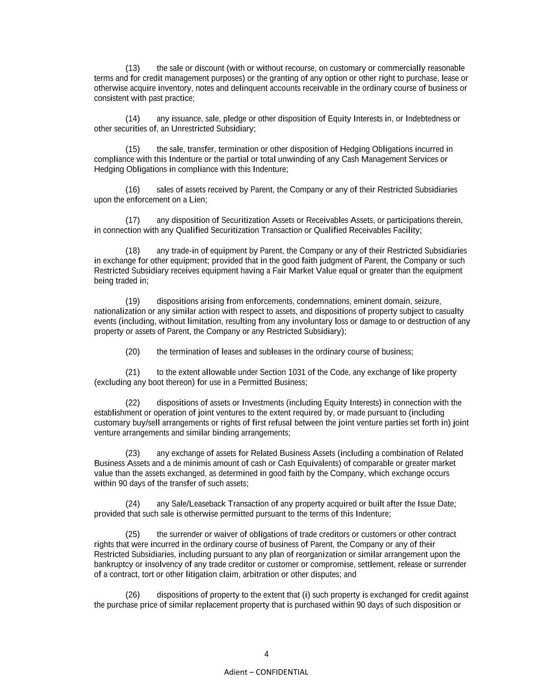 4 Adient – CONFIDENTIAL (13) the sale or discount (with or without recourse, on customary or commercially reasonable terms and for credit management purposes) or the granting of any option or other right to purchase, lease or otherwise acquire inventory, notes and delinquent accounts receivable in the ordinary course of business or consistent with past practice; (14) any issuance, sale, pledge or other disposition of Equity Interests in, or Indebtedness or other securities of, an Unrestricted Subsidiary; (15) the sale, transfer, termination or other disposition of Hedging Obligations incurred in compliance with this Indenture or the partial or total unwinding of any Cash Management Services or Hedging Obligations in compliance with this Indenture; (16) sales of assets received by Parent, the Company or any of their Restricted Subsidiaries upon the enforcement on a Lien; (17) any disposition of Securitization Assets or Receivables Assets, or participations therein, in connection with any Qualified Securitization Transaction or Qualified Receivables Facility; (18) any trade-in of equipment by Parent, the Company or any of their Restricted Subsidiaries in exchange for other equipment; provided that in the good faith judgment of Parent, the Company or such Restricted Subsidiary receives equipment having a Fair Market Value equal or greater than the equipment being traded in; (19) dispositions arising from enforcements, condemnations, eminent domain, seizure, nationalization or any similar action with respect to assets, and dispositions of property subject to casualty events (including, without limitation, resulting from any involuntary loss or damage to or destruction of any property or assets of Parent, the Company or any Restricted Subsidiary); (20) the termination of leases and subleases in the ordinary course of business; (21) to the extent allowable under Section 1031 of the Code, any exchange of like property (excluding any boot thereon) for use in a Permitted Business; (22) dispositions of assets or Investments (including Equity Interests) in connection with the establishment or operation of joint ventures to the extent required by, or made pursuant to (including customary buy/sell arrangements or rights of first refusal between the joint venture parties set forth in) joint venture arrangements and similar binding arrangements; (23) any exchange of assets for Related Business Assets (including a combination of Related Business Assets and a de minimis amount of cash or Cash Equivalents) of comparable or greater market value than the assets exchanged, as determined in good faith by the Company, which exchange occurs within 90 days of the transfer of such assets; (24) any Sale/Leaseback Transaction of any property acquired or built after the Issue Date; provided that such sale is otherwise permitted pursuant to the terms of this Indenture; (25) the surrender or waiver of obligations of trade creditors or customers or other contract rights that were incurred in the ordinary course of business of Parent, the Company or any of their Restricted Subsidiaries, including pursuant to any plan of reorganization or similar arrangement upon the bankruptcy or insolvency of any trade creditor or customer or compromise, settlement, release or surrender of a contract, tort or other litigation claim, arbitration or other disputes; and (26) dispositions of property to the extent that (i) such property is exchanged for credit against the purchase price of similar replacement property that is purchased within 90 days of such disposition or
