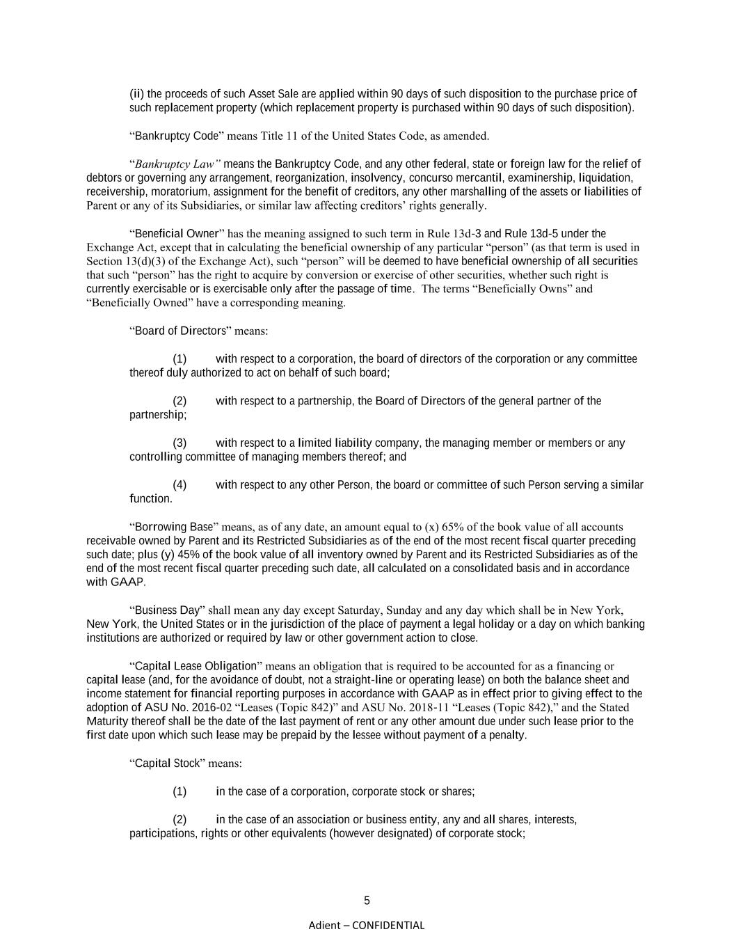 5 Adient – CONFIDENTIAL (ii) the proceeds of such Asset Sale are applied within 90 days of such disposition to the purchase price of such replacement property (which replacement property is purchased within 90 days of such disposition). “Bankruptcy Code” means Title 11 of the United States Code, as amended. “Bankruptcy Law” means the Bankruptcy Code, and any other federal, state or foreign law for the relief of debtors or governing any arrangement, reorganization, insolvency, concurso mercantil, examinership, liquidation, receivership, moratorium, assignment for the benefit of creditors, any other marshalling of the assets or liabilities of Parent or any of its Subsidiaries, or similar law affecting creditors’ rights generally. “Beneficial Owner” has the meaning assigned to such term in Rule 13d-3 and Rule 13d-5 under the Exchange Act, except that in calculating the beneficial ownership of any particular “person” (as that term is used in Section 13(d)(3) of the Exchange Act), such “person” will be deemed to have beneficial ownership of all securities that such “person” has the right to acquire by conversion or exercise of other securities, whether such right is currently exercisable or is exercisable only after the passage of time. The terms “Beneficially Owns” and “Beneficially Owned” have a corresponding meaning. “Board of Directors” means: (1) with respect to a corporation, the board of directors of the corporation or any committee thereof duly authorized to act on behalf of such board; (2) with respect to a partnership, the Board of Directors of the general partner of the partnership; (3) with respect to a limited liability company, the managing member or members or any controlling committee of managing members thereof; and (4) with respect to any other Person, the board or committee of such Person serving a similar function. “Borrowing Base” means, as of any date, an amount equal to (x) 65% of the book value of all accounts receivable owned by Parent and its Restricted Subsidiaries as of the end of the most recent fiscal quarter preceding such date; plus (y) 45% of the book value of all inventory owned by Parent and its Restricted Subsidiaries as of the end of the most recent fiscal quarter preceding such date, all calculated on a consolidated basis and in accordance with GAAP. “Business Day” shall mean any day except Saturday, Sunday and any day which shall be in New York, New York, the United States or in the jurisdiction of the place of payment a legal holiday or a day on which banking institutions are authorized or required by law or other government action to close. “Capital Lease Obligation” means an obligation that is required to be accounted for as a financing or capital lease (and, for the avoidance of doubt, not a straight-line or operating lease) on both the balance sheet and income statement for financial reporting purposes in accordance with GAAP as in effect prior to giving effect to the adoption of ASU No. 2016-02 “Leases (Topic 842)” and ASU No. 2018-11 “Leases (Topic 842),” and the Stated Maturity thereof shall be the date of the last payment of rent or any other amount due under such lease prior to the first date upon which such lease may be prepaid by the lessee without payment of a penalty. “Capital Stock” means: (1) in the case of a corporation, corporate stock or shares; (2) in the case of an association or business entity, any and all shares, interests, participations, rights or other equivalents (however designated) of corporate stock;