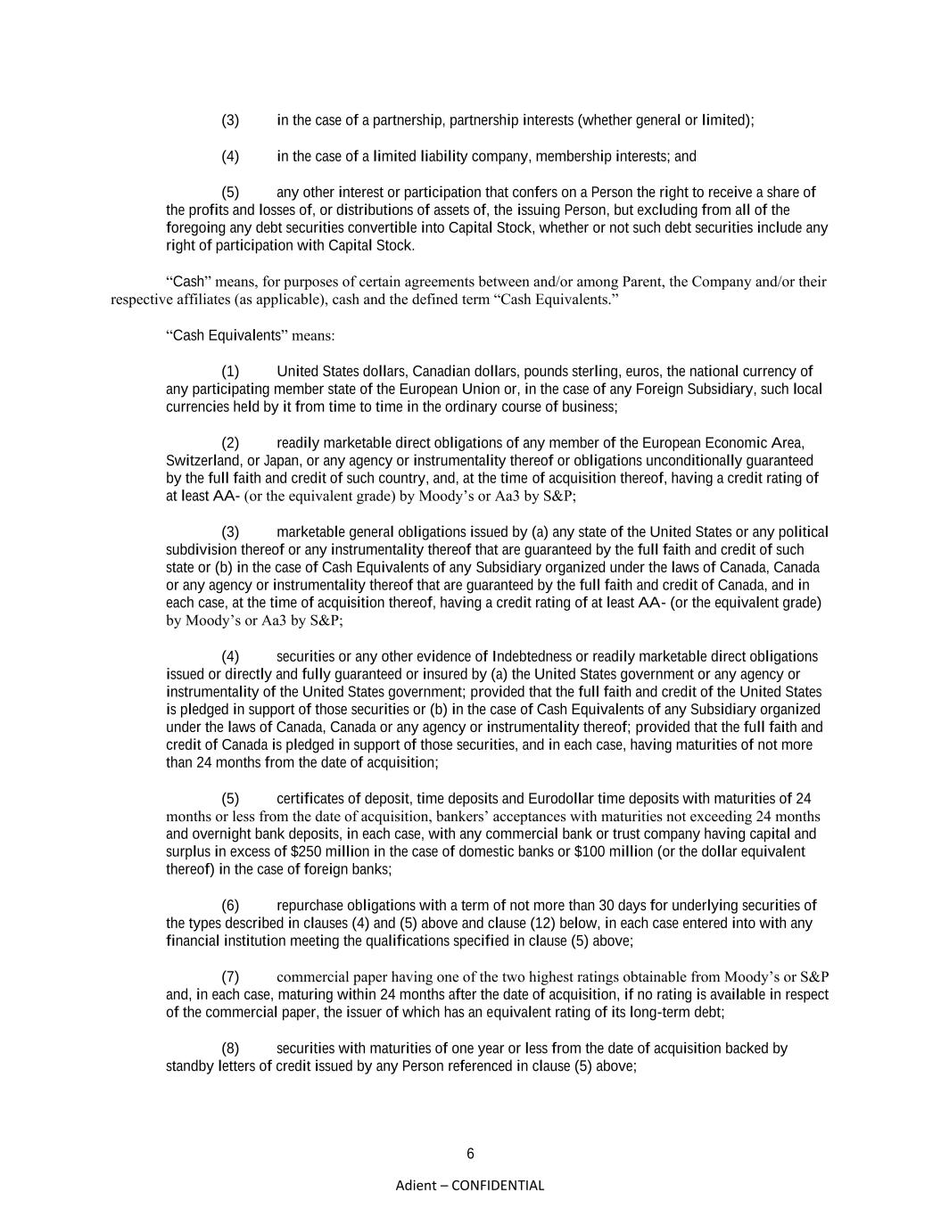 6 Adient – CONFIDENTIAL (3) in the case of a partnership, partnership interests (whether general or limited); (4) in the case of a limited liability company, membership interests; and (5) any other interest or participation that confers on a Person the right to receive a share of the profits and losses of, or distributions of assets of, the issuing Person, but excluding from all of the foregoing any debt securities convertible into Capital Stock, whether or not such debt securities include any right of participation with Capital Stock. “Cash” means, for purposes of certain agreements between and/or among Parent, the Company and/or their respective affiliates (as applicable), cash and the defined term “Cash Equivalents.” “Cash Equivalents” means: (1) United States dollars, Canadian dollars, pounds sterling, euros, the national currency of any participating member state of the European Union or, in the case of any Foreign Subsidiary, such local currencies held by it from time to time in the ordinary course of business; (2) readily marketable direct obligations of any member of the European Economic Area, Switzerland, or Japan, or any agency or instrumentality thereof or obligations unconditionally guaranteed by the full faith and credit of such country, and, at the time of acquisition thereof, having a credit rating of at least AA- (or the equivalent grade) by Moody’s or Aa3 by S&P; (3) marketable general obligations issued by (a) any state of the United States or any political subdivision thereof or any instrumentality thereof that are guaranteed by the full faith and credit of such state or (b) in the case of Cash Equivalents of any Subsidiary organized under the laws of Canada, Canada or any agency or instrumentality thereof that are guaranteed by the full faith and credit of Canada, and in each case, at the time of acquisition thereof, having a credit rating of at least AA- (or the equivalent grade) by Moody’s or Aa3 by S&P; (4) securities or any other evidence of Indebtedness or readily marketable direct obligations issued or directly and fully guaranteed or insured by (a) the United States government or any agency or instrumentality of the United States government; provided that the full faith and credit of the United States is pledged in support of those securities or (b) in the case of Cash Equivalents of any Subsidiary organized under the laws of Canada, Canada or any agency or instrumentality thereof; provided that the full faith and credit of Canada is pledged in support of those securities, and in each case, having maturities of not more than 24 months from the date of acquisition; (5) certificates of deposit, time deposits and Eurodollar time deposits with maturities of 24 months or less from the date of acquisition, bankers’ acceptances with maturities not exceeding 24 months and overnight bank deposits, in each case, with any commercial bank or trust company having capital and surplus in excess of $250 million in the case of domestic banks or $100 million (or the dollar equivalent thereof) in the case of foreign banks; (6) repurchase obligations with a term of not more than 30 days for underlying securities of the types described in clauses (4) and (5) above and clause (12) below, in each case entered into with any financial institution meeting the qualifications specified in clause (5) above; (7) commercial paper having one of the two highest ratings obtainable from Moody’s or S&P and, in each case, maturing within 24 months after the date of acquisition, if no rating is available in respect of the commercial paper, the issuer of which has an equivalent rating of its long-term debt; (8) securities with maturities of one year or less from the date of acquisition backed by standby letters of credit issued by any Person referenced in clause (5) above;