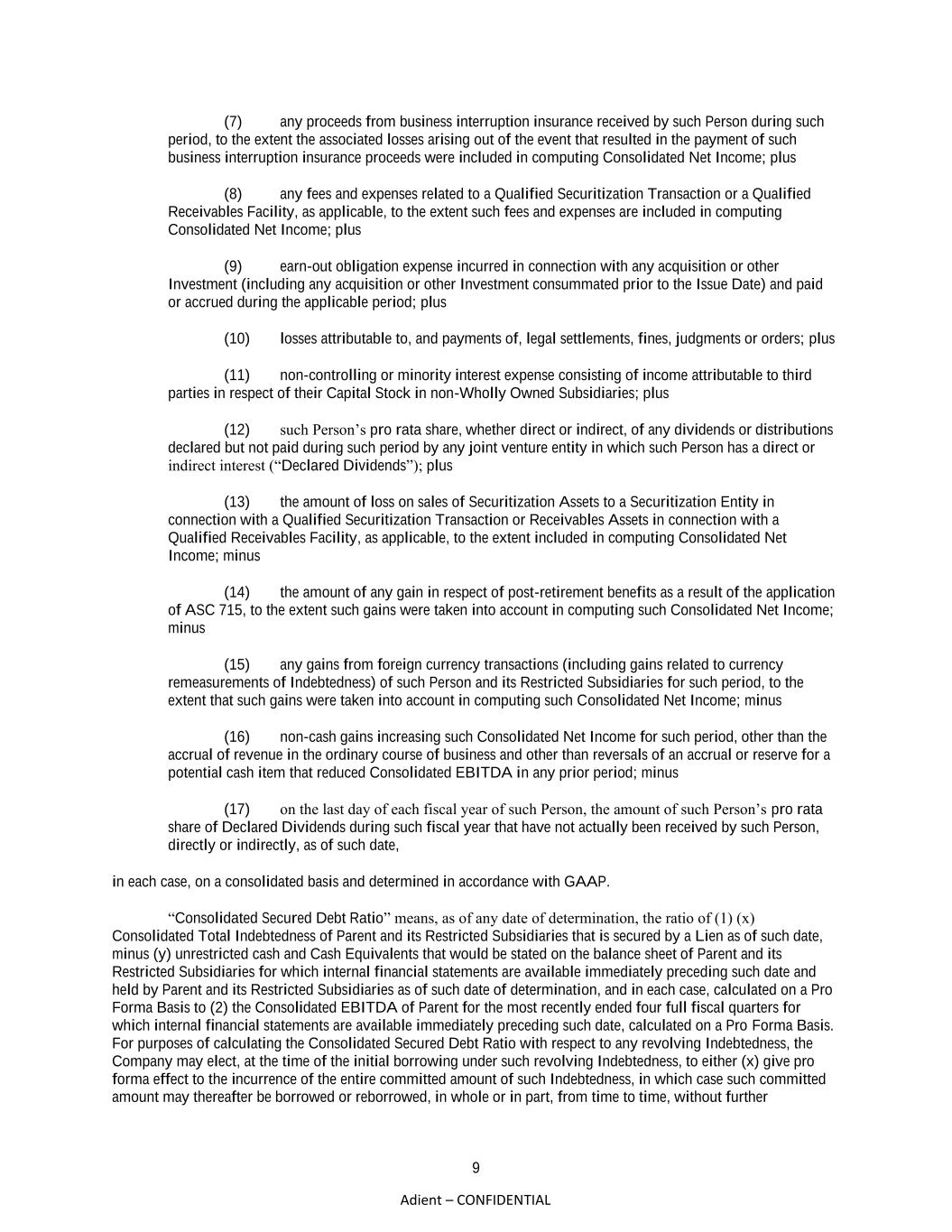 9 Adient – CONFIDENTIAL (7) any proceeds from business interruption insurance received by such Person during such period, to the extent the associated losses arising out of the event that resulted in the payment of such business interruption insurance proceeds were included in computing Consolidated Net Income; plus (8) any fees and expenses related to a Qualified Securitization Transaction or a Qualified Receivables Facility, as applicable, to the extent such fees and expenses are included in computing Consolidated Net Income; plus (9) earn-out obligation expense incurred in connection with any acquisition or other Investment (including any acquisition or other Investment consummated prior to the Issue Date) and paid or accrued during the applicable period; plus (10) losses attributable to, and payments of, legal settlements, fines, judgments or orders; plus (11) non-controlling or minority interest expense consisting of income attributable to third parties in respect of their Capital Stock in non-Wholly Owned Subsidiaries; plus (12) such Person’s pro rata share, whether direct or indirect, of any dividends or distributions declared but not paid during such period by any joint venture entity in which such Person has a direct or indirect interest (“Declared Dividends”); plus (13) the amount of loss on sales of Securitization Assets to a Securitization Entity in connection with a Qualified Securitization Transaction or Receivables Assets in connection with a Qualified Receivables Facility, as applicable, to the extent included in computing Consolidated Net Income; minus (14) the amount of any gain in respect of post-retirement benefits as a result of the application of ASC 715, to the extent such gains were taken into account in computing such Consolidated Net Income; minus (15) any gains from foreign currency transactions (including gains related to currency remeasurements of Indebtedness) of such Person and its Restricted Subsidiaries for such period, to the extent that such gains were taken into account in computing such Consolidated Net Income; minus (16) non-cash gains increasing such Consolidated Net Income for such period, other than the accrual of revenue in the ordinary course of business and other than reversals of an accrual or reserve for a potential cash item that reduced Consolidated EBITDA in any prior period; minus (17) on the last day of each fiscal year of such Person, the amount of such Person’s pro rata share of Declared Dividends during such fiscal year that have not actually been received by such Person, directly or indirectly, as of such date, in each case, on a consolidated basis and determined in accordance with GAAP. “Consolidated Secured Debt Ratio” means, as of any date of determination, the ratio of (1) (x) Consolidated Total Indebtedness of Parent and its Restricted Subsidiaries that is secured by a Lien as of such date, minus (y) unrestricted cash and Cash Equivalents that would be stated on the balance sheet of Parent and its Restricted Subsidiaries for which internal financial statements are available immediately preceding such date and held by Parent and its Restricted Subsidiaries as of such date of determination, and in each case, calculated on a Pro Forma Basis to (2) the Consolidated EBITDA of Parent for the most recently ended four full fiscal quarters for which internal financial statements are available immediately preceding such date, calculated on a Pro Forma Basis. For purposes of calculating the Consolidated Secured Debt Ratio with respect to any revolving Indebtedness, the Company may elect, at the time of the initial borrowing under such revolving Indebtedness, to either (x) give pro forma effect to the incurrence of the entire committed amount of such Indebtedness, in which case such committed amount may thereafter be borrowed or reborrowed, in whole or in part, from time to time, without further