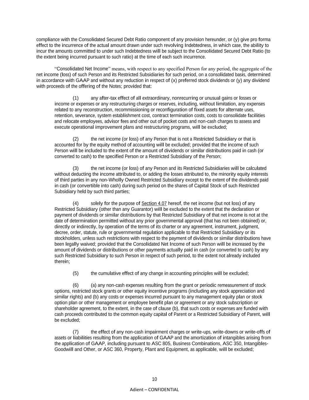 10 Adient – CONFIDENTIAL compliance with the Consolidated Secured Debt Ratio component of any provision hereunder, or (y) give pro forma effect to the incurrence of the actual amount drawn under such revolving Indebtedness, in which case, the ability to incur the amounts committed to under such Indebtedness will be subject to the Consolidated Secured Debt Ratio (to the extent being incurred pursuant to such ratio) at the time of each such incurrence. “Consolidated Net Income” means, with respect to any specified Person for any period, the aggregate of the net income (loss) of such Person and its Restricted Subsidiaries for such period, on a consolidated basis, determined in accordance with GAAP and without any reduction in respect of (x) preferred stock dividends or (y) any dividend with proceeds of the offering of the Notes; provided that: (1) any after-tax effect of all extraordinary, nonrecurring or unusual gains or losses or income or expenses or any restructuring charges or reserves, including, without limitation, any expenses related to any reconstruction, recommissioning or reconfiguration of fixed assets for alternate uses, retention, severance, system establishment cost, contract termination costs, costs to consolidate facilities and relocate employees, advisor fees and other out of pocket costs and non-cash charges to assess and execute operational improvement plans and restructuring programs, will be excluded; (2) the net income (or loss) of any Person that is not a Restricted Subsidiary or that is accounted for by the equity method of accounting will be excluded; provided that the income of such Person will be included to the extent of the amount of dividends or similar distributions paid in cash (or converted to cash) to the specified Person or a Restricted Subsidiary of the Person; (3) the net income (or loss) of any Person and its Restricted Subsidiaries will be calculated without deducting the income attributed to, or adding the losses attributed to, the minority equity interests of third parties in any non-Wholly Owned Restricted Subsidiary except to the extent of the dividends paid in cash (or convertible into cash) during such period on the shares of Capital Stock of such Restricted Subsidiary held by such third parties; (4) solely for the purpose of Section 4.07 hereof, the net income (but not loss) of any Restricted Subsidiary (other than any Guarantor) will be excluded to the extent that the declaration or payment of dividends or similar distributions by that Restricted Subsidiary of that net income is not at the date of determination permitted without any prior governmental approval (that has not been obtained) or, directly or indirectly, by operation of the terms of its charter or any agreement, instrument, judgment, decree, order, statute, rule or governmental regulation applicable to that Restricted Subsidiary or its stockholders, unless such restrictions with respect to the payment of dividends or similar distributions have been legally waived; provided that the Consolidated Net Income of such Person will be increased by the amount of dividends or distributions or other payments actually paid in cash (or converted to cash) by any such Restricted Subsidiary to such Person in respect of such period, to the extent not already included therein; (5) the cumulative effect of any change in accounting principles will be excluded; (6) (a) any non-cash expenses resulting from the grant or periodic remeasurement of stock options, restricted stock grants or other equity incentive programs (including any stock appreciation and similar rights) and (b) any costs or expenses incurred pursuant to any management equity plan or stock option plan or other management or employee benefit plan or agreement or any stock subscription or shareholder agreement, to the extent, in the case of clause (b), that such costs or expenses are funded with cash proceeds contributed to the common equity capital of Parent or a Restricted Subsidiary of Parent, will be excluded; (7) the effect of any non-cash impairment charges or write-ups, write-downs or write-offs of assets or liabilities resulting from the application of GAAP and the amortization of intangibles arising from the application of GAAP, including pursuant to ASC 805, Business Combinations, ASC 350, Intangibles- Goodwill and Other, or ASC 360, Property, Plant and Equipment, as applicable, will be excluded;