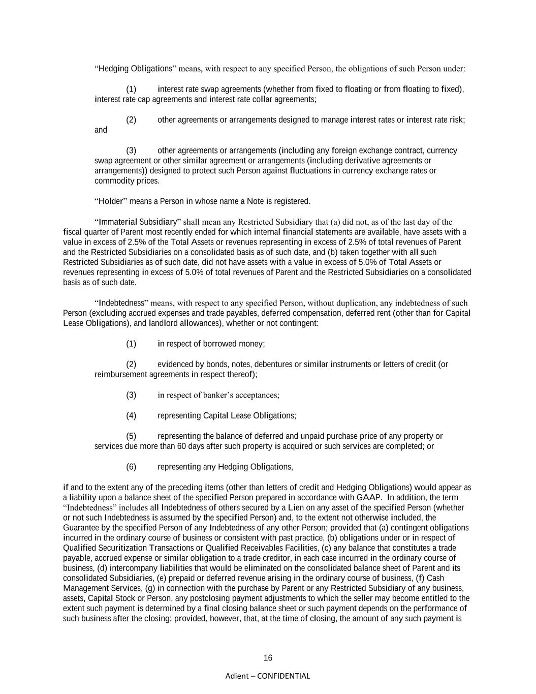 16 Adient – CONFIDENTIAL “Hedging Obligations” means, with respect to any specified Person, the obligations of such Person under: (1) interest rate swap agreements (whether from fixed to floating or from floating to fixed), interest rate cap agreements and interest rate collar agreements; (2) other agreements or arrangements designed to manage interest rates or interest rate risk; and (3) other agreements or arrangements (including any foreign exchange contract, currency swap agreement or other similar agreement or arrangements (including derivative agreements or arrangements)) designed to protect such Person against fluctuations in currency exchange rates or commodity prices. “Holder” means a Person in whose name a Note is registered. “Immaterial Subsidiary” shall mean any Restricted Subsidiary that (a) did not, as of the last day of the fiscal quarter of Parent most recently ended for which internal financial statements are available, have assets with a value in excess of 2.5% of the Total Assets or revenues representing in excess of 2.5% of total revenues of Parent and the Restricted Subsidiaries on a consolidated basis as of such date, and (b) taken together with all such Restricted Subsidiaries as of such date, did not have assets with a value in excess of 5.0% of Total Assets or revenues representing in excess of 5.0% of total revenues of Parent and the Restricted Subsidiaries on a consolidated basis as of such date. “Indebtedness” means, with respect to any specified Person, without duplication, any indebtedness of such Person (excluding accrued expenses and trade payables, deferred compensation, deferred rent (other than for Capital Lease Obligations), and landlord allowances), whether or not contingent: (1) in respect of borrowed money; (2) evidenced by bonds, notes, debentures or similar instruments or letters of credit (or reimbursement agreements in respect thereof); (3) in respect of banker’s acceptances; (4) representing Capital Lease Obligations; (5) representing the balance of deferred and unpaid purchase price of any property or services due more than 60 days after such property is acquired or such services are completed; or (6) representing any Hedging Obligations, if and to the extent any of the preceding items (other than letters of credit and Hedging Obligations) would appear as a liability upon a balance sheet of the specified Person prepared in accordance with GAAP. In addition, the term “Indebtedness” includes all Indebtedness of others secured by a Lien on any asset of the specified Person (whether or not such Indebtedness is assumed by the specified Person) and, to the extent not otherwise included, the Guarantee by the specified Person of any Indebtedness of any other Person; provided that (a) contingent obligations incurred in the ordinary course of business or consistent with past practice, (b) obligations under or in respect of Qualified Securitization Transactions or Qualified Receivables Facilities, (c) any balance that constitutes a trade payable, accrued expense or similar obligation to a trade creditor, in each case incurred in the ordinary course of business, (d) intercompany liabilities that would be eliminated on the consolidated balance sheet of Parent and its consolidated Subsidiaries, (e) prepaid or deferred revenue arising in the ordinary course of business, (f) Cash Management Services, (g) in connection with the purchase by Parent or any Restricted Subsidiary of any business, assets, Capital Stock or Person, any postclosing payment adjustments to which the seller may become entitled to the extent such payment is determined by a final closing balance sheet or such payment depends on the performance of such business after the closing; provided, however, that, at the time of closing, the amount of any such payment is