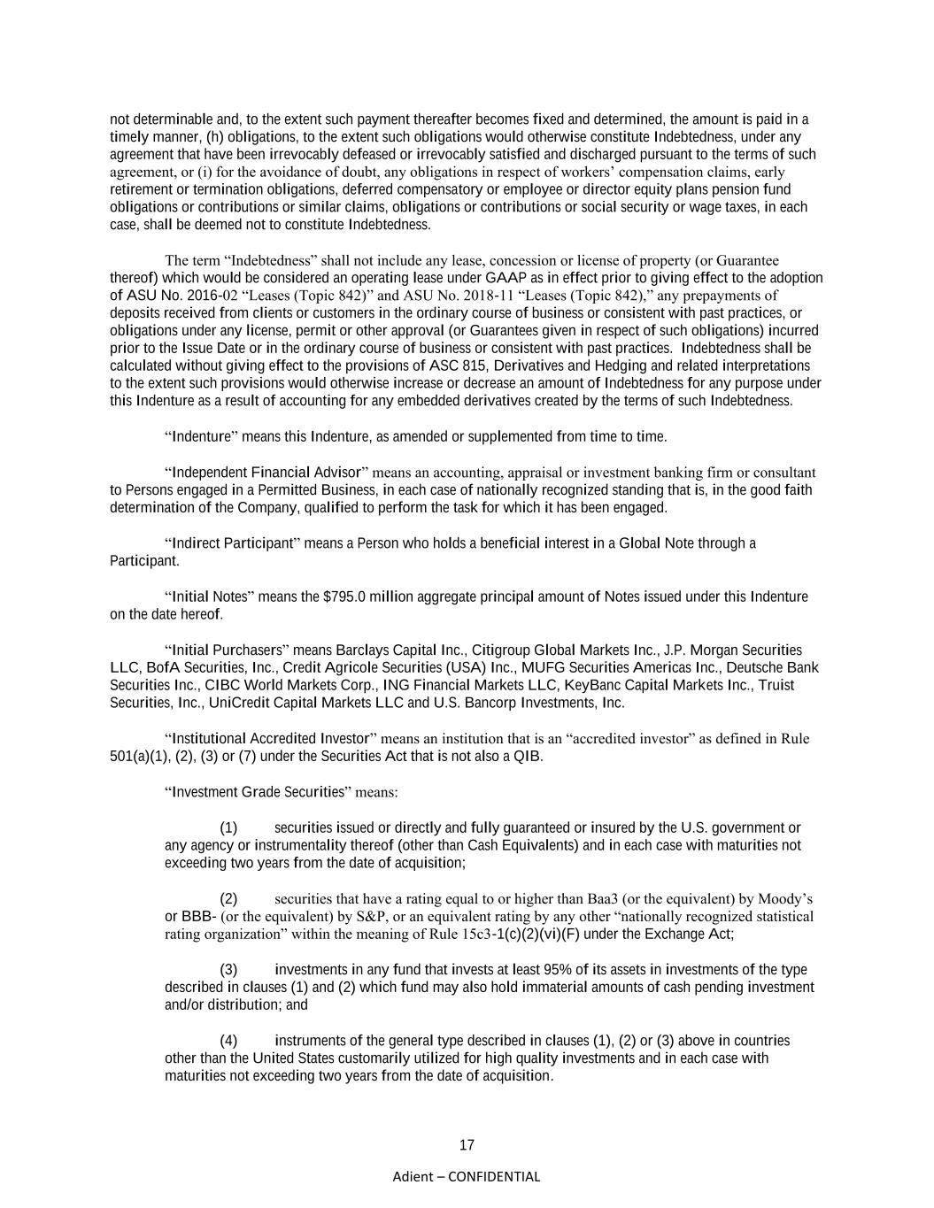 17 Adient – CONFIDENTIAL not determinable and, to the extent such payment thereafter becomes fixed and determined, the amount is paid in a timely manner, (h) obligations, to the extent such obligations would otherwise constitute Indebtedness, under any agreement that have been irrevocably defeased or irrevocably satisfied and discharged pursuant to the terms of such agreement, or (i) for the avoidance of doubt, any obligations in respect of workers’ compensation claims, early retirement or termination obligations, deferred compensatory or employee or director equity plans pension fund obligations or contributions or similar claims, obligations or contributions or social security or wage taxes, in each case, shall be deemed not to constitute Indebtedness. The term “Indebtedness” shall not include any lease, concession or license of property (or Guarantee thereof) which would be considered an operating lease under GAAP as in effect prior to giving effect to the adoption of ASU No. 2016-02 “Leases (Topic 842)” and ASU No. 2018-11 “Leases (Topic 842),” any prepayments of deposits received from clients or customers in the ordinary course of business or consistent with past practices, or obligations under any license, permit or other approval (or Guarantees given in respect of such obligations) incurred prior to the Issue Date or in the ordinary course of business or consistent with past practices. Indebtedness shall be calculated without giving effect to the provisions of ASC 815, Derivatives and Hedging and related interpretations to the extent such provisions would otherwise increase or decrease an amount of Indebtedness for any purpose under this Indenture as a result of accounting for any embedded derivatives created by the terms of such Indebtedness. “Indenture” means this Indenture, as amended or supplemented from time to time. “Independent Financial Advisor” means an accounting, appraisal or investment banking firm or consultant to Persons engaged in a Permitted Business, in each case of nationally recognized standing that is, in the good faith determination of the Company, qualified to perform the task for which it has been engaged. “Indirect Participant” means a Person who holds a beneficial interest in a Global Note through a Participant. “Initial Notes” means the $795.0 million aggregate principal amount of Notes issued under this Indenture on the date hereof. “Initial Purchasers” means Barclays Capital Inc., Citigroup Global Markets Inc., J.P. Morgan Securities LLC, BofA Securities, Inc., Credit Agricole Securities (USA) Inc., MUFG Securities Americas Inc., Deutsche Bank Securities Inc., CIBC World Markets Corp., ING Financial Markets LLC, KeyBanc Capital Markets Inc., Truist Securities, Inc., UniCredit Capital Markets LLC and U.S. Bancorp Investments, Inc. “Institutional Accredited Investor” means an institution that is an “accredited investor” as defined in Rule 501(a)(1), (2), (3) or (7) under the Securities Act that is not also a QIB. “Investment Grade Securities” means: (1) securities issued or directly and fully guaranteed or insured by the U.S. government or any agency or instrumentality thereof (other than Cash Equivalents) and in each case with maturities not exceeding two years from the date of acquisition; (2) securities that have a rating equal to or higher than Baa3 (or the equivalent) by Moody’s or BBB- (or the equivalent) by S&P, or an equivalent rating by any other “nationally recognized statistical rating organization” within the meaning of Rule 15c3-1(c)(2)(vi)(F) under the Exchange Act; (3) investments in any fund that invests at least 95% of its assets in investments of the type described in clauses (1) and (2) which fund may also hold immaterial amounts of cash pending investment and/or distribution; and (4) instruments of the general type described in clauses (1), (2) or (3) above in countries other than the United States customarily utilized for high quality investments and in each case with maturities not exceeding two years from the date of acquisition.