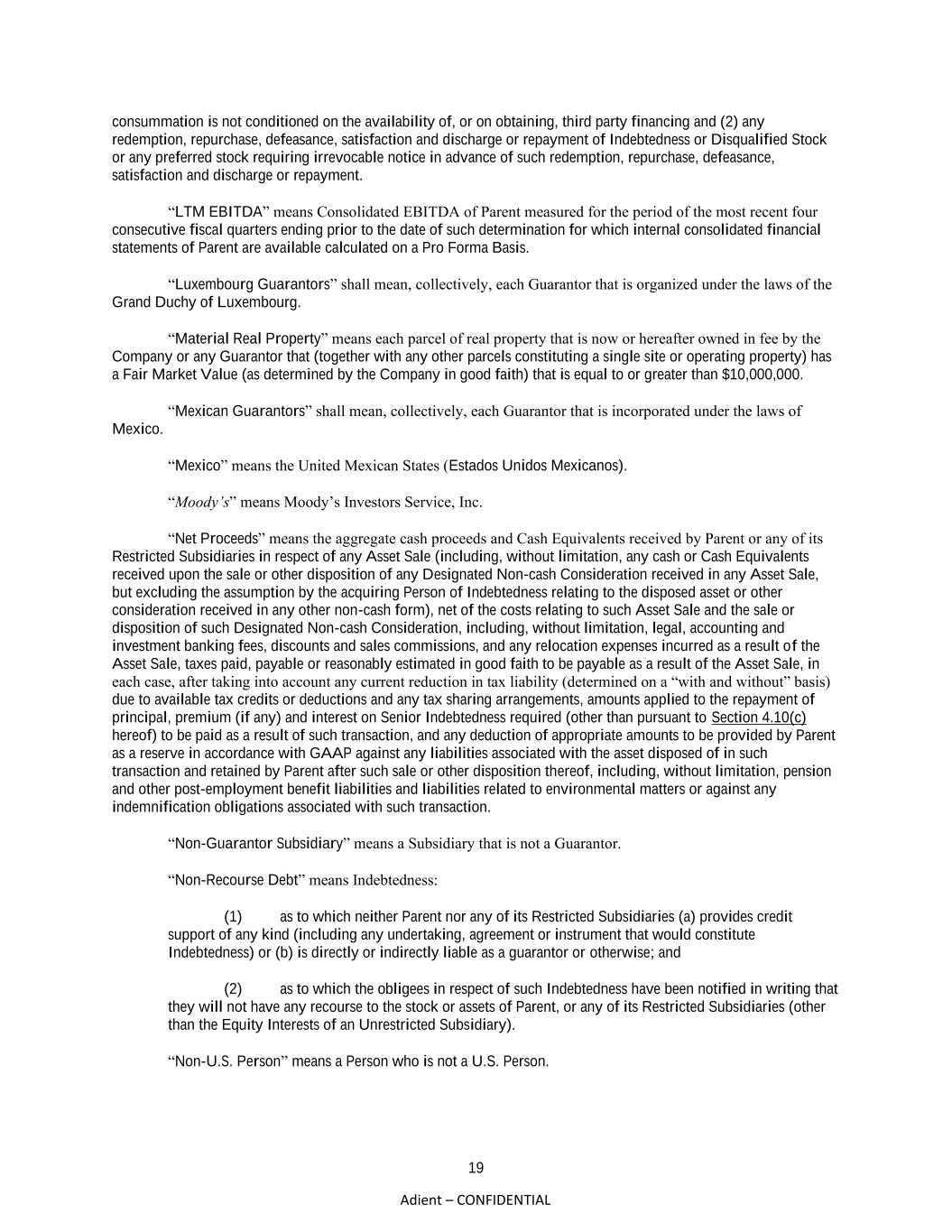 19 Adient – CONFIDENTIAL consummation is not conditioned on the availability of, or on obtaining, third party financing and (2) any redemption, repurchase, defeasance, satisfaction and discharge or repayment of Indebtedness or Disqualified Stock or any preferred stock requiring irrevocable notice in advance of such redemption, repurchase, defeasance, satisfaction and discharge or repayment. “LTM EBITDA” means Consolidated EBITDA of Parent measured for the period of the most recent four consecutive fiscal quarters ending prior to the date of such determination for which internal consolidated financial statements of Parent are available calculated on a Pro Forma Basis. “Luxembourg Guarantors” shall mean, collectively, each Guarantor that is organized under the laws of the Grand Duchy of Luxembourg. “Material Real Property” means each parcel of real property that is now or hereafter owned in fee by the Company or any Guarantor that (together with any other parcels constituting a single site or operating property) has a Fair Market Value (as determined by the Company in good faith) that is equal to or greater than $10,000,000. “Mexican Guarantors” shall mean, collectively, each Guarantor that is incorporated under the laws of Mexico. “Mexico” means the United Mexican States (Estados Unidos Mexicanos). “Moody’s” means Moody’s Investors Service, Inc. “Net Proceeds” means the aggregate cash proceeds and Cash Equivalents received by Parent or any of its Restricted Subsidiaries in respect of any Asset Sale (including, without limitation, any cash or Cash Equivalents received upon the sale or other disposition of any Designated Non-cash Consideration received in any Asset Sale, but excluding the assumption by the acquiring Person of Indebtedness relating to the disposed asset or other consideration received in any other non-cash form), net of the costs relating to such Asset Sale and the sale or disposition of such Designated Non-cash Consideration, including, without limitation, legal, accounting and investment banking fees, discounts and sales commissions, and any relocation expenses incurred as a result of the Asset Sale, taxes paid, payable or reasonably estimated in good faith to be payable as a result of the Asset Sale, in each case, after taking into account any current reduction in tax liability (determined on a “with and without” basis) due to available tax credits or deductions and any tax sharing arrangements, amounts applied to the repayment of principal, premium (if any) and interest on Senior Indebtedness required (other than pursuant to Section 4.10(c) hereof) to be paid as a result of such transaction, and any deduction of appropriate amounts to be provided by Parent as a reserve in accordance with GAAP against any liabilities associated with the asset disposed of in such transaction and retained by Parent after such sale or other disposition thereof, including, without limitation, pension and other post-employment benefit liabilities and liabilities related to environmental matters or against any indemnification obligations associated with such transaction. “Non-Guarantor Subsidiary” means a Subsidiary that is not a Guarantor. “Non-Recourse Debt” means Indebtedness: (1) as to which neither Parent nor any of its Restricted Subsidiaries (a) provides credit support of any kind (including any undertaking, agreement or instrument that would constitute Indebtedness) or (b) is directly or indirectly liable as a guarantor or otherwise; and (2) as to which the obligees in respect of such Indebtedness have been notified in writing that they will not have any recourse to the stock or assets of Parent, or any of its Restricted Subsidiaries (other than the Equity Interests of an Unrestricted Subsidiary). “Non-U.S. Person” means a Person who is not a U.S. Person.