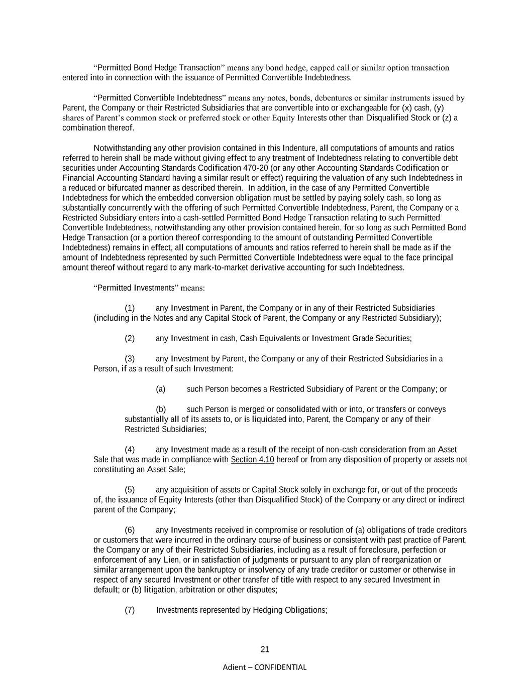 21 Adient – CONFIDENTIAL “Permitted Bond Hedge Transaction” means any bond hedge, capped call or similar option transaction entered into in connection with the issuance of Permitted Convertible Indebtedness. “Permitted Convertible Indebtedness” means any notes, bonds, debentures or similar instruments issued by Parent, the Company or their Restricted Subsidiaries that are convertible into or exchangeable for (x) cash, (y) shares of Parent’s common stock or preferred stock or other Equity Interests other than Disqualified Stock or (z) a combination thereof. Notwithstanding any other provision contained in this Indenture, all computations of amounts and ratios referred to herein shall be made without giving effect to any treatment of Indebtedness relating to convertible debt securities under Accounting Standards Codification 470-20 (or any other Accounting Standards Codification or Financial Accounting Standard having a similar result or effect) requiring the valuation of any such Indebtedness in a reduced or bifurcated manner as described therein. In addition, in the case of any Permitted Convertible Indebtedness for which the embedded conversion obligation must be settled by paying solely cash, so long as substantially concurrently with the offering of such Permitted Convertible Indebtedness, Parent, the Company or a Restricted Subsidiary enters into a cash-settled Permitted Bond Hedge Transaction relating to such Permitted Convertible Indebtedness, notwithstanding any other provision contained herein, for so long as such Permitted Bond Hedge Transaction (or a portion thereof corresponding to the amount of outstanding Permitted Convertible Indebtedness) remains in effect, all computations of amounts and ratios referred to herein shall be made as if the amount of Indebtedness represented by such Permitted Convertible Indebtedness were equal to the face principal amount thereof without regard to any mark-to-market derivative accounting for such Indebtedness. “Permitted Investments” means: (1) any Investment in Parent, the Company or in any of their Restricted Subsidiaries (including in the Notes and any Capital Stock of Parent, the Company or any Restricted Subsidiary); (2) any Investment in cash, Cash Equivalents or Investment Grade Securities; (3) any Investment by Parent, the Company or any of their Restricted Subsidiaries in a Person, if as a result of such Investment: (a) such Person becomes a Restricted Subsidiary of Parent or the Company; or (b) such Person is merged or consolidated with or into, or transfers or conveys substantially all of its assets to, or is liquidated into, Parent, the Company or any of their Restricted Subsidiaries; (4) any Investment made as a result of the receipt of non-cash consideration from an Asset Sale that was made in compliance with Section 4.10 hereof or from any disposition of property or assets not constituting an Asset Sale; (5) any acquisition of assets or Capital Stock solely in exchange for, or out of the proceeds of, the issuance of Equity Interests (other than Disqualified Stock) of the Company or any direct or indirect parent of the Company; (6) any Investments received in compromise or resolution of (a) obligations of trade creditors or customers that were incurred in the ordinary course of business or consistent with past practice of Parent, the Company or any of their Restricted Subsidiaries, including as a result of foreclosure, perfection or enforcement of any Lien, or in satisfaction of judgments or pursuant to any plan of reorganization or similar arrangement upon the bankruptcy or insolvency of any trade creditor or customer or otherwise in respect of any secured Investment or other transfer of title with respect to any secured Investment in default; or (b) litigation, arbitration or other disputes; (7) Investments represented by Hedging Obligations;