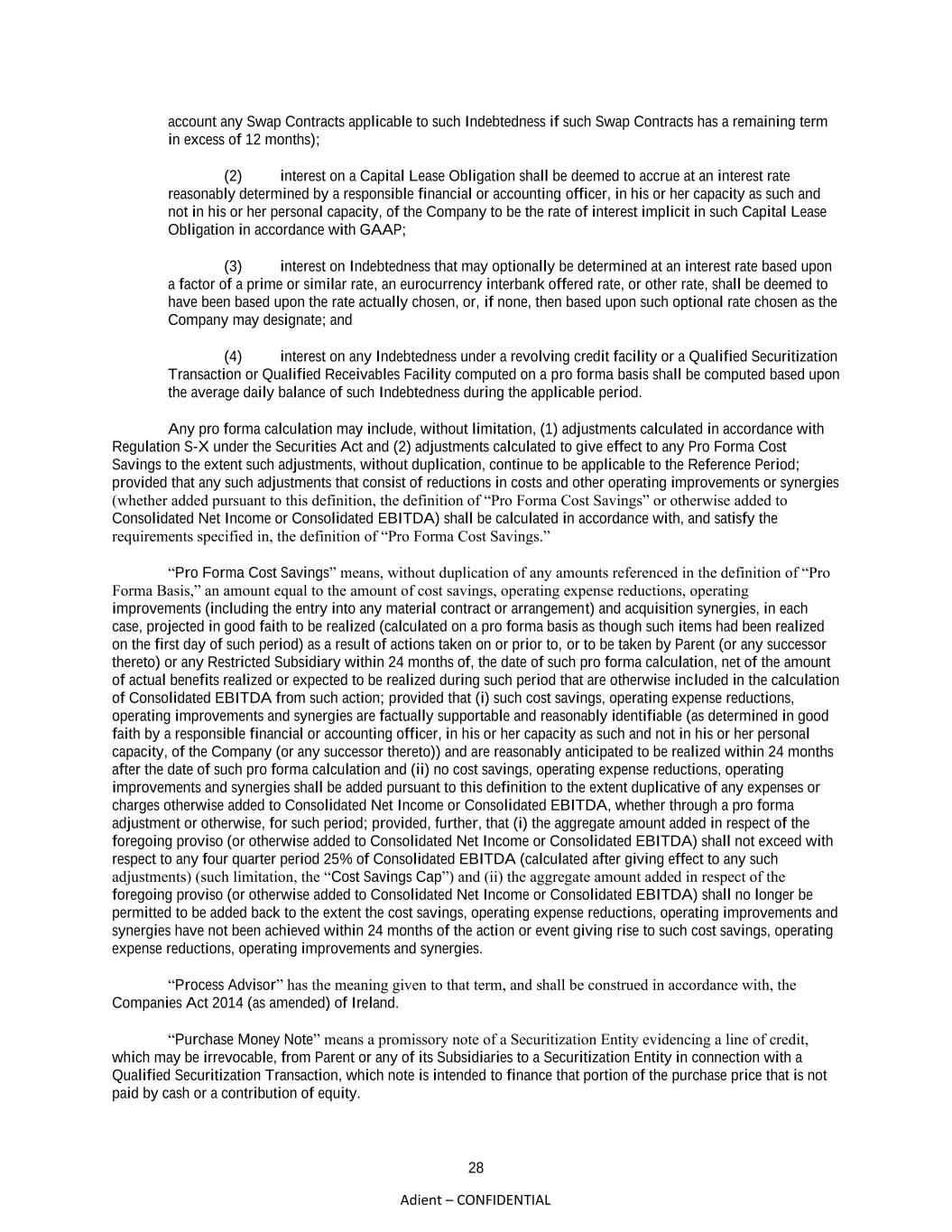 28 Adient – CONFIDENTIAL account any Swap Contracts applicable to such Indebtedness if such Swap Contracts has a remaining term in excess of 12 months); (2) interest on a Capital Lease Obligation shall be deemed to accrue at an interest rate reasonably determined by a responsible financial or accounting officer, in his or her capacity as such and not in his or her personal capacity, of the Company to be the rate of interest implicit in such Capital Lease Obligation in accordance with GAAP; (3) interest on Indebtedness that may optionally be determined at an interest rate based upon a factor of a prime or similar rate, an eurocurrency interbank offered rate, or other rate, shall be deemed to have been based upon the rate actually chosen, or, if none, then based upon such optional rate chosen as the Company may designate; and (4) interest on any Indebtedness under a revolving credit facility or a Qualified Securitization Transaction or Qualified Receivables Facility computed on a pro forma basis shall be computed based upon the average daily balance of such Indebtedness during the applicable period. Any pro forma calculation may include, without limitation, (1) adjustments calculated in accordance with Regulation S-X under the Securities Act and (2) adjustments calculated to give effect to any Pro Forma Cost Savings to the extent such adjustments, without duplication, continue to be applicable to the Reference Period; provided that any such adjustments that consist of reductions in costs and other operating improvements or synergies (whether added pursuant to this definition, the definition of “Pro Forma Cost Savings” or otherwise added to Consolidated Net Income or Consolidated EBITDA) shall be calculated in accordance with, and satisfy the requirements specified in, the definition of “Pro Forma Cost Savings.” “Pro Forma Cost Savings” means, without duplication of any amounts referenced in the definition of “Pro Forma Basis,” an amount equal to the amount of cost savings, operating expense reductions, operating improvements (including the entry into any material contract or arrangement) and acquisition synergies, in each case, projected in good faith to be realized (calculated on a pro forma basis as though such items had been realized on the first day of such period) as a result of actions taken on or prior to, or to be taken by Parent (or any successor thereto) or any Restricted Subsidiary within 24 months of, the date of such pro forma calculation, net of the amount of actual benefits realized or expected to be realized during such period that are otherwise included in the calculation of Consolidated EBITDA from such action; provided that (i) such cost savings, operating expense reductions, operating improvements and synergies are factually supportable and reasonably identifiable (as determined in good faith by a responsible financial or accounting officer, in his or her capacity as such and not in his or her personal capacity, of the Company (or any successor thereto)) and are reasonably anticipated to be realized within 24 months after the date of such pro forma calculation and (ii) no cost savings, operating expense reductions, operating improvements and synergies shall be added pursuant to this definition to the extent duplicative of any expenses or charges otherwise added to Consolidated Net Income or Consolidated EBITDA, whether through a pro forma adjustment or otherwise, for such period; provided, further, that (i) the aggregate amount added in respect of the foregoing proviso (or otherwise added to Consolidated Net Income or Consolidated EBITDA) shall not exceed with respect to any four quarter period 25% of Consolidated EBITDA (calculated after giving effect to any such adjustments) (such limitation, the “Cost Savings Cap”) and (ii) the aggregate amount added in respect of the foregoing proviso (or otherwise added to Consolidated Net Income or Consolidated EBITDA) shall no longer be permitted to be added back to the extent the cost savings, operating expense reductions, operating improvements and synergies have not been achieved within 24 months of the action or event giving rise to such cost savings, operating expense reductions, operating improvements and synergies. “Process Advisor” has the meaning given to that term, and shall be construed in accordance with, the Companies Act 2014 (as amended) of Ireland. “Purchase Money Note” means a promissory note of a Securitization Entity evidencing a line of credit, which may be irrevocable, from Parent or any of its Subsidiaries to a Securitization Entity in connection with a Qualified Securitization Transaction, which note is intended to finance that portion of the purchase price that is not paid by cash or a contribution of equity.