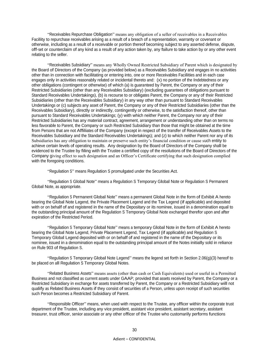 30 Adient – CONFIDENTIAL “Receivables Repurchase Obligation” means any obligation of a seller of receivables in a Receivables Facility to repurchase receivables arising as a result of a breach of a representation, warranty or covenant or otherwise, including as a result of a receivable or portion thereof becoming subject to any asserted defense, dispute, off-set or counterclaim of any kind as a result of any action taken by, any failure to take action by or any other event relating to the seller. “Receivables Subsidiary” means any Wholly Owned Restricted Subsidiary of Parent which is designated by the Board of Directors of the Company (as provided below) as a Receivables Subsidiary and engages in no activities other than in connection with facilitating or entering into, one or more Receivables Facilities and in each case engages only in activities reasonably related or incidental thereto and: (x) no portion of the Indebtedness or any other obligations (contingent or otherwise) of which (a) is guaranteed by Parent, the Company or any of their Restricted Subsidiaries (other than any Receivables Subsidiary) (excluding guarantees of obligations pursuant to Standard Receivables Undertakings), (b) is recourse to or obligates Parent, the Company or any of their Restricted Subsidiaries (other than the Receivables Subsidiary) in any way other than pursuant to Standard Receivables Undertakings or (c) subjects any asset of Parent, the Company or any of their Restricted Subsidiaries (other than the Receivables Subsidiary), directly or indirectly, contingently or otherwise, to the satisfaction thereof, other than pursuant to Standard Receivables Undertakings; (y) with which neither Parent, the Company nor any of their Restricted Subsidiaries has any material contract, agreement, arrangement or understanding other than on terms no less favorable to Parent, the Company or such Restricted Subsidiary than those that might be obtained at the time from Persons that are not Affiliates of the Company (except in respect of the transfer of Receivables Assets to the Receivables Subsidiary and the Standard Receivables Undertakings); and (z) to which neither Parent nor any of its Subsidiaries has any obligation to maintain or preserve such entity’s financial condition or cause such entity to achieve certain levels of operating results. Any designation by the Board of Directors of the Company shall be evidenced to the Trustee by filing with the Trustee a certified copy of the resolutions of the Board of Directors of the Company giving effect to such designation and an Officer’s Certificate certifying that such designation complied with the foregoing conditions. “Regulation S” means Regulation S promulgated under the Securities Act. “Regulation S Global Note” means a Regulation S Temporary Global Note or Regulation S Permanent Global Note, as appropriate. “Regulation S Permanent Global Note” means a permanent Global Note in the form of Exhibit A hereto bearing the Global Note Legend, the Private Placement Legend and the Tax Legend (if applicable) and deposited with or on behalf of and registered in the name of the Depositary or its nominee, issued in a denomination equal to the outstanding principal amount of the Regulation S Temporary Global Note exchanged therefor upon and after expiration of the Restricted Period. “Regulation S Temporary Global Note” means a temporary Global Note in the form of Exhibit A hereto bearing the Global Note Legend, Private Placement Legend, Tax Legend (if applicable) and Regulation S Temporary Global Legend deposited with or on behalf of and registered in the name of the Depositary or its nominee, issued in a denomination equal to the outstanding principal amount of the Notes initially sold in reliance on Rule 903 of Regulation S. “Regulation S Temporary Global Note Legend” means the legend set forth in Section 2.06(g)(3) hereof to be placed on all Regulation S Temporary Global Notes. “Related Business Assets” means assets (other than cash or Cash Equivalents) used or useful in a Permitted Business and not classified as current assets under GAAP; provided that assets received by Parent, the Company or a Restricted Subsidiary in exchange for assets transferred by Parent, the Company or a Restricted Subsidiary will not qualify as Related Business Assets if they consist of securities of a Person, unless upon receipt of such securities such Person becomes a Restricted Subsidiary of Parent. “Responsible Officer” means, when used with respect to the Trustee, any officer within the corporate trust department of the Trustee, including any vice president, assistant vice president, assistant secretary, assistant treasurer, trust officer, senior associate or any other officer of the Trustee who customarily performs functions