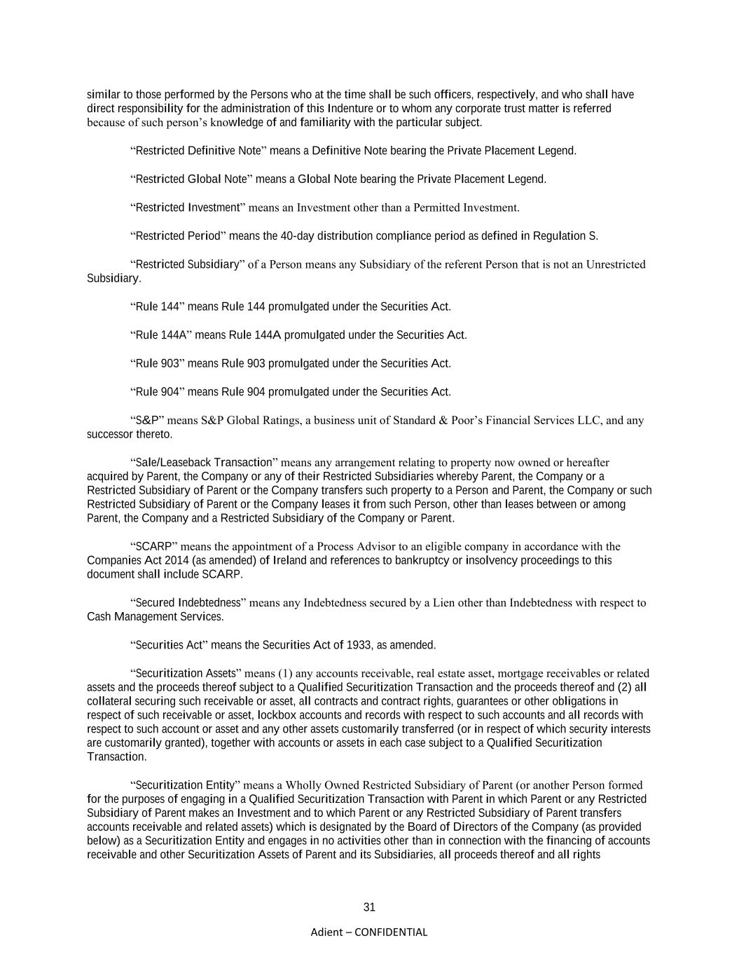 31 Adient – CONFIDENTIAL similar to those performed by the Persons who at the time shall be such officers, respectively, and who shall have direct responsibility for the administration of this Indenture or to whom any corporate trust matter is referred because of such person’s knowledge of and familiarity with the particular subject. “Restricted Definitive Note” means a Definitive Note bearing the Private Placement Legend. “Restricted Global Note” means a Global Note bearing the Private Placement Legend. “Restricted Investment” means an Investment other than a Permitted Investment. “Restricted Period” means the 40-day distribution compliance period as defined in Regulation S. “Restricted Subsidiary” of a Person means any Subsidiary of the referent Person that is not an Unrestricted Subsidiary. “Rule 144” means Rule 144 promulgated under the Securities Act. “Rule 144A” means Rule 144A promulgated under the Securities Act. “Rule 903” means Rule 903 promulgated under the Securities Act. “Rule 904” means Rule 904 promulgated under the Securities Act. “S&P” means S&P Global Ratings, a business unit of Standard & Poor’s Financial Services LLC, and any successor thereto. “Sale/Leaseback Transaction” means any arrangement relating to property now owned or hereafter acquired by Parent, the Company or any of their Restricted Subsidiaries whereby Parent, the Company or a Restricted Subsidiary of Parent or the Company transfers such property to a Person and Parent, the Company or such Restricted Subsidiary of Parent or the Company leases it from such Person, other than leases between or among Parent, the Company and a Restricted Subsidiary of the Company or Parent. “SCARP” means the appointment of a Process Advisor to an eligible company in accordance with the Companies Act 2014 (as amended) of Ireland and references to bankruptcy or insolvency proceedings to this document shall include SCARP. “Secured Indebtedness” means any Indebtedness secured by a Lien other than Indebtedness with respect to Cash Management Services. “Securities Act” means the Securities Act of 1933, as amended. “Securitization Assets” means (1) any accounts receivable, real estate asset, mortgage receivables or related assets and the proceeds thereof subject to a Qualified Securitization Transaction and the proceeds thereof and (2) all collateral securing such receivable or asset, all contracts and contract rights, guarantees or other obligations in respect of such receivable or asset, lockbox accounts and records with respect to such accounts and all records with respect to such account or asset and any other assets customarily transferred (or in respect of which security interests are customarily granted), together with accounts or assets in each case subject to a Qualified Securitization Transaction. “Securitization Entity” means a Wholly Owned Restricted Subsidiary of Parent (or another Person formed for the purposes of engaging in a Qualified Securitization Transaction with Parent in which Parent or any Restricted Subsidiary of Parent makes an Investment and to which Parent or any Restricted Subsidiary of Parent transfers accounts receivable and related assets) which is designated by the Board of Directors of the Company (as provided below) as a Securitization Entity and engages in no activities other than in connection with the financing of accounts receivable and other Securitization Assets of Parent and its Subsidiaries, all proceeds thereof and all rights