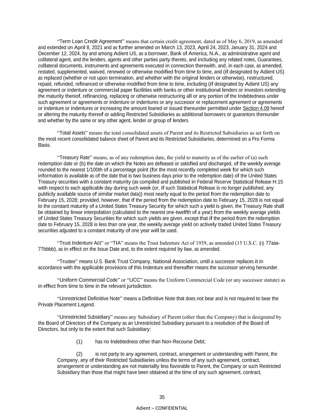 35 Adient – CONFIDENTIAL “Term Loan Credit Agreement” means that certain credit agreement, dated as of May 6, 2019, as amended and extended on April 8, 2021 and as further amended on March 13, 2023, April 24, 2023, January 31, 2024 and December 12, 2024, by and among Adient US, as a borrower, Bank of America, N.A., as administrative agent and collateral agent, and the lenders, agents and other parties party thereto, and including any related notes, Guarantees, collateral documents, instruments and agreements executed in connection therewith, and, in each case, as amended, restated, supplemented, waived, renewed or otherwise modified from time to time, and (if designated by Adient US) as replaced (whether or not upon termination, and whether with the original lenders or otherwise), restructured, repaid, refunded, refinanced or otherwise modified from time to time, including (if designated by Adient US) any agreement or indenture or commercial paper facilities with banks or other institutional lenders or investors extending the maturity thereof, refinancing, replacing or otherwise restructuring all or any portion of the Indebtedness under such agreement or agreements or indenture or indentures or any successor or replacement agreement or agreements or indenture or indentures or increasing the amount loaned or issued thereunder permitted under Section 4.09 hereof or altering the maturity thereof or adding Restricted Subsidiaries as additional borrowers or guarantors thereunder and whether by the same or any other agent, lender or group of lenders. “Total Assets” means the total consolidated assets of Parent and its Restricted Subsidiaries as set forth on the most recent consolidated balance sheet of Parent and its Restricted Subsidiaries, determined on a Pro Forma Basis. “Treasury Rate” means, as of any redemption date, the yield to maturity as of the earlier of (a) such redemption date or (b) the date on which the Notes are defeased or satisfied and discharged, of the weekly average rounded to the nearest 1/100th of a percentage point (for the most recently completed week for which such information is available as of the date that is two business days prior to the redemption date) of the United States Treasury securities with a constant maturity (as compiled and published in Federal Reserve Statistical Release H.15 with respect to each applicable day during such week (or, if such Statistical Release is no longer published, any publicly available source of similar market data)) most nearly equal to the period from the redemption date to February 15, 2028; provided, however, that if the period from the redemption date to February 15, 2028 is not equal to the constant maturity of a United States Treasury Security for which such a yield is given, the Treasury Rate shall be obtained by linear interpolation (calculated to the nearest one-twelfth of a year) from the weekly average yields of United States Treasury Securities for which such yields are given, except that if the period from the redemption date to February 15, 2028 is less than one year, the weekly average yield on actively traded United States Treasury securities adjusted to a constant maturity of one year will be used. “Trust Indenture Act” or “TIA” means the Trust Indenture Act of 1939, as amended (15 U.S.C. §§ 77aaa- 77bbbb), as in effect on the Issue Date and, to the extent required by law, as amended. “Trustee” means U.S. Bank Trust Company, National Association, until a successor replaces it in accordance with the applicable provisions of this Indenture and thereafter means the successor serving hereunder. “Uniform Commercial Code” or “UCC” means the Uniform Commercial Code (or any successor statute) as in effect from time to time in the relevant jurisdiction. “Unrestricted Definitive Note” means a Definitive Note that does not bear and is not required to bear the Private Placement Legend. “Unrestricted Subsidiary” means any Subsidiary of Parent (other than the Company) that is designated by the Board of Directors of the Company as an Unrestricted Subsidiary pursuant to a resolution of the Board of Directors, but only to the extent that such Subsidiary: (1) has no Indebtedness other than Non-Recourse Debt; (2) is not party to any agreement, contract, arrangement or understanding with Parent, the Company, any of their Restricted Subsidiaries unless the terms of any such agreement, contract, arrangement or understanding are not materially less favorable to Parent, the Company or such Restricted Subsidiary than those that might have been obtained at the time of any such agreement, contract,