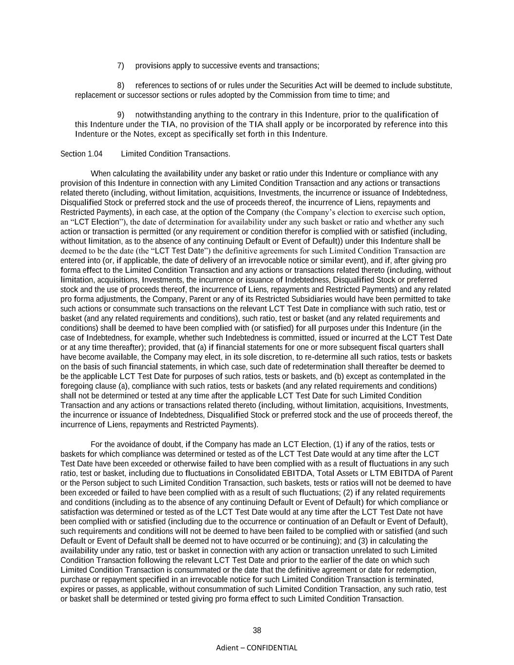 38 Adient – CONFIDENTIAL 7) provisions apply to successive events and transactions; 8) references to sections of or rules under the Securities Act will be deemed to include substitute, replacement or successor sections or rules adopted by the Commission from time to time; and 9) notwithstanding anything to the contrary in this Indenture, prior to the qualification of this Indenture under the TIA, no provision of the TIA shall apply or be incorporated by reference into this Indenture or the Notes, except as specifically set forth in this Indenture. Section 1.04 Limited Condition Transactions. When calculating the availability under any basket or ratio under this Indenture or compliance with any provision of this Indenture in connection with any Limited Condition Transaction and any actions or transactions related thereto (including, without limitation, acquisitions, Investments, the incurrence or issuance of Indebtedness, Disqualified Stock or preferred stock and the use of proceeds thereof, the incurrence of Liens, repayments and Restricted Payments), in each case, at the option of the Company (the Company’s election to exercise such option, an “LCT Election”), the date of determination for availability under any such basket or ratio and whether any such action or transaction is permitted (or any requirement or condition therefor is complied with or satisfied (including, without limitation, as to the absence of any continuing Default or Event of Default)) under this Indenture shall be deemed to be the date (the “LCT Test Date”) the definitive agreements for such Limited Condition Transaction are entered into (or, if applicable, the date of delivery of an irrevocable notice or similar event), and if, after giving pro forma effect to the Limited Condition Transaction and any actions or transactions related thereto (including, without limitation, acquisitions, Investments, the incurrence or issuance of Indebtedness, Disqualified Stock or preferred stock and the use of proceeds thereof, the incurrence of Liens, repayments and Restricted Payments) and any related pro forma adjustments, the Company, Parent or any of its Restricted Subsidiaries would have been permitted to take such actions or consummate such transactions on the relevant LCT Test Date in compliance with such ratio, test or basket (and any related requirements and conditions), such ratio, test or basket (and any related requirements and conditions) shall be deemed to have been complied with (or satisfied) for all purposes under this Indenture (in the case of Indebtedness, for example, whether such Indebtedness is committed, issued or incurred at the LCT Test Date or at any time thereafter); provided, that (a) if financial statements for one or more subsequent fiscal quarters shall have become available, the Company may elect, in its sole discretion, to re-determine all such ratios, tests or baskets on the basis of such financial statements, in which case, such date of redetermination shall thereafter be deemed to be the applicable LCT Test Date for purposes of such ratios, tests or baskets, and (b) except as contemplated in the foregoing clause (a), compliance with such ratios, tests or baskets (and any related requirements and conditions) shall not be determined or tested at any time after the applicable LCT Test Date for such Limited Condition Transaction and any actions or transactions related thereto (including, without limitation, acquisitions, Investments, the incurrence or issuance of Indebtedness, Disqualified Stock or preferred stock and the use of proceeds thereof, the incurrence of Liens, repayments and Restricted Payments). For the avoidance of doubt, if the Company has made an LCT Election, (1) if any of the ratios, tests or baskets for which compliance was determined or tested as of the LCT Test Date would at any time after the LCT Test Date have been exceeded or otherwise failed to have been complied with as a result of fluctuations in any such ratio, test or basket, including due to fluctuations in Consolidated EBITDA, Total Assets or LTM EBITDA of Parent or the Person subject to such Limited Condition Transaction, such baskets, tests or ratios will not be deemed to have been exceeded or failed to have been complied with as a result of such fluctuations; (2) if any related requirements and conditions (including as to the absence of any continuing Default or Event of Default) for which compliance or satisfaction was determined or tested as of the LCT Test Date would at any time after the LCT Test Date not have been complied with or satisfied (including due to the occurrence or continuation of an Default or Event of Default), such requirements and conditions will not be deemed to have been failed to be complied with or satisfied (and such Default or Event of Default shall be deemed not to have occurred or be continuing); and (3) in calculating the availability under any ratio, test or basket in connection with any action or transaction unrelated to such Limited Condition Transaction following the relevant LCT Test Date and prior to the earlier of the date on which such Limited Condition Transaction is consummated or the date that the definitive agreement or date for redemption, purchase or repayment specified in an irrevocable notice for such Limited Condition Transaction is terminated, expires or passes, as applicable, without consummation of such Limited Condition Transaction, any such ratio, test or basket shall be determined or tested giving pro forma effect to such Limited Condition Transaction.