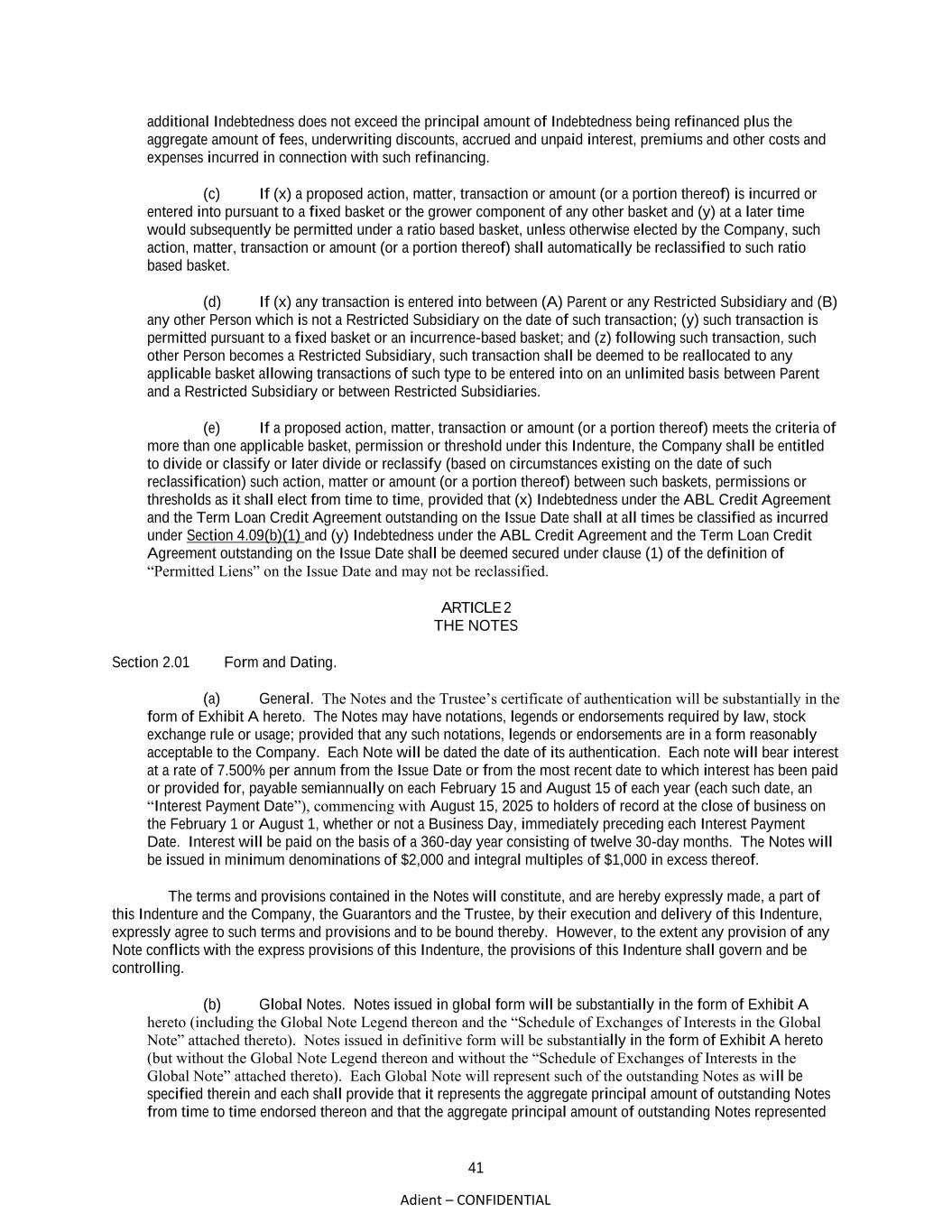 41 Adient – CONFIDENTIAL additional Indebtedness does not exceed the principal amount of Indebtedness being refinanced plus the aggregate amount of fees, underwriting discounts, accrued and unpaid interest, premiums and other costs and expenses incurred in connection with such refinancing. (c) If (x) a proposed action, matter, transaction or amount (or a portion thereof) is incurred or entered into pursuant to a fixed basket or the grower component of any other basket and (y) at a later time would subsequently be permitted under a ratio based basket, unless otherwise elected by the Company, such action, matter, transaction or amount (or a portion thereof) shall automatically be reclassified to such ratio based basket. (d) If (x) any transaction is entered into between (A) Parent or any Restricted Subsidiary and (B) any other Person which is not a Restricted Subsidiary on the date of such transaction; (y) such transaction is permitted pursuant to a fixed basket or an incurrence-based basket; and (z) following such transaction, such other Person becomes a Restricted Subsidiary, such transaction shall be deemed to be reallocated to any applicable basket allowing transactions of such type to be entered into on an unlimited basis between Parent and a Restricted Subsidiary or between Restricted Subsidiaries. (e) If a proposed action, matter, transaction or amount (or a portion thereof) meets the criteria of more than one applicable basket, permission or threshold under this Indenture, the Company shall be entitled to divide or classify or later divide or reclassify (based on circumstances existing on the date of such reclassification) such action, matter or amount (or a portion thereof) between such baskets, permissions or thresholds as it shall elect from time to time, provided that (x) Indebtedness under the ABL Credit Agreement and the Term Loan Credit Agreement outstanding on the Issue Date shall at all times be classified as incurred under Section 4.09(b)(1) and (y) Indebtedness under the ABL Credit Agreement and the Term Loan Credit Agreement outstanding on the Issue Date shall be deemed secured under clause (1) of the definition of “Permitted Liens” on the Issue Date and may not be reclassified. ARTICLE 2 THE NOTES Section 2.01 Form and Dating. (a) General. The Notes and the Trustee’s certificate of authentication will be substantially in the form of Exhibit A hereto. The Notes may have notations, legends or endorsements required by law, stock exchange rule or usage; provided that any such notations, legends or endorsements are in a form reasonably acceptable to the Company. Each Note will be dated the date of its authentication. Each note will bear interest at a rate of 7.500% per annum from the Issue Date or from the most recent date to which interest has been paid or provided for, payable semiannually on each February 15 and August 15 of each year (each such date, an “Interest Payment Date”), commencing with August 15, 2025 to holders of record at the close of business on the February 1 or August 1, whether or not a Business Day, immediately preceding each Interest Payment Date. Interest will be paid on the basis of a 360-day year consisting of twelve 30-day months. The Notes will be issued in minimum denominations of $2,000 and integral multiples of $1,000 in excess thereof. The terms and provisions contained in the Notes will constitute, and are hereby expressly made, a part of this Indenture and the Company, the Guarantors and the Trustee, by their execution and delivery of this Indenture, expressly agree to such terms and provisions and to be bound thereby. However, to the extent any provision of any Note conflicts with the express provisions of this Indenture, the provisions of this Indenture shall govern and be controlling. (b) Global Notes. Notes issued in global form will be substantially in the form of Exhibit A hereto (including the Global Note Legend thereon and the “Schedule of Exchanges of Interests in the Global Note” attached thereto). Notes issued in definitive form will be substantially in the form of Exhibit A hereto (but without the Global Note Legend thereon and without the “Schedule of Exchanges of Interests in the Global Note” attached thereto). Each Global Note will represent such of the outstanding Notes as will be specified therein and each shall provide that it represents the aggregate principal amount of outstanding Notes from time to time endorsed thereon and that the aggregate principal amount of outstanding Notes represented