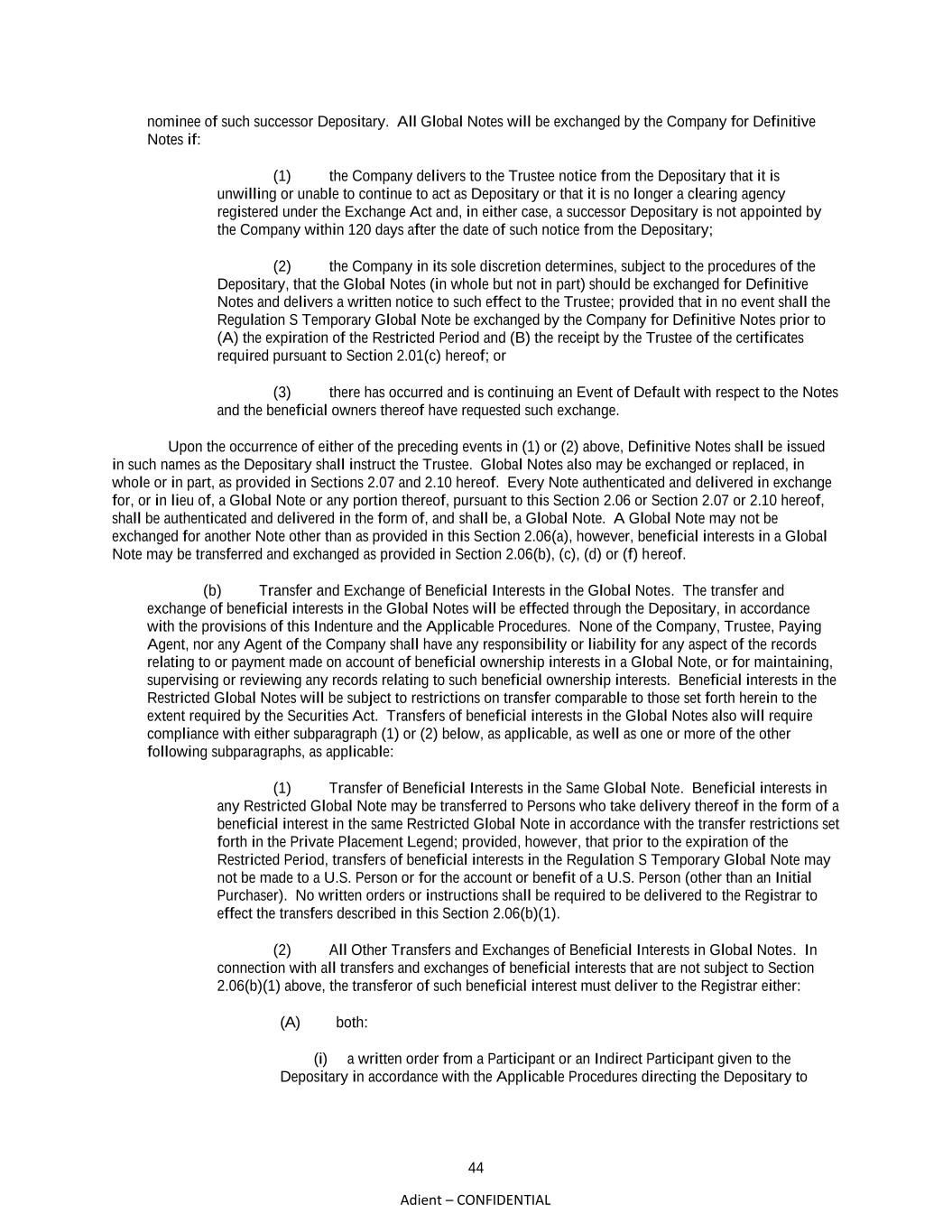 44 Adient – CONFIDENTIAL nominee of such successor Depositary. All Global Notes will be exchanged by the Company for Definitive Notes if: (1) the Company delivers to the Trustee notice from the Depositary that it is unwilling or unable to continue to act as Depositary or that it is no longer a clearing agency registered under the Exchange Act and, in either case, a successor Depositary is not appointed by the Company within 120 days after the date of such notice from the Depositary; (2) the Company in its sole discretion determines, subject to the procedures of the Depositary, that the Global Notes (in whole but not in part) should be exchanged for Definitive Notes and delivers a written notice to such effect to the Trustee; provided that in no event shall the Regulation S Temporary Global Note be exchanged by the Company for Definitive Notes prior to (A) the expiration of the Restricted Period and (B) the receipt by the Trustee of the certificates required pursuant to Section 2.01(c) hereof; or (3) there has occurred and is continuing an Event of Default with respect to the Notes and the beneficial owners thereof have requested such exchange. Upon the occurrence of either of the preceding events in (1) or (2) above, Definitive Notes shall be issued in such names as the Depositary shall instruct the Trustee. Global Notes also may be exchanged or replaced, in whole or in part, as provided in Sections 2.07 and 2.10 hereof. Every Note authenticated and delivered in exchange for, or in lieu of, a Global Note or any portion thereof, pursuant to this Section 2.06 or Section 2.07 or 2.10 hereof, shall be authenticated and delivered in the form of, and shall be, a Global Note. A Global Note may not be exchanged for another Note other than as provided in this Section 2.06(a), however, beneficial interests in a Global Note may be transferred and exchanged as provided in Section 2.06(b), (c), (d) or (f) hereof. (b) Transfer and Exchange of Beneficial Interests in the Global Notes. The transfer and exchange of beneficial interests in the Global Notes will be effected through the Depositary, in accordance with the provisions of this Indenture and the Applicable Procedures. None of the Company, Trustee, Paying Agent, nor any Agent of the Company shall have any responsibility or liability for any aspect of the records relating to or payment made on account of beneficial ownership interests in a Global Note, or for maintaining, supervising or reviewing any records relating to such beneficial ownership interests. Beneficial interests in the Restricted Global Notes will be subject to restrictions on transfer comparable to those set forth herein to the extent required by the Securities Act. Transfers of beneficial interests in the Global Notes also will require compliance with either subparagraph (1) or (2) below, as applicable, as well as one or more of the other following subparagraphs, as applicable: (1) Transfer of Beneficial Interests in the Same Global Note. Beneficial interests in any Restricted Global Note may be transferred to Persons who take delivery thereof in the form of a beneficial interest in the same Restricted Global Note in accordance with the transfer restrictions set forth in the Private Placement Legend; provided, however, that prior to the expiration of the Restricted Period, transfers of beneficial interests in the Regulation S Temporary Global Note may not be made to a U.S. Person or for the account or benefit of a U.S. Person (other than an Initial Purchaser). No written orders or instructions shall be required to be delivered to the Registrar to effect the transfers described in this Section 2.06(b)(1). (2) All Other Transfers and Exchanges of Beneficial Interests in Global Notes. In connection with all transfers and exchanges of beneficial interests that are not subject to Section 2.06(b)(1) above, the transferor of such beneficial interest must deliver to the Registrar either: (A) both: (i) a written order from a Participant or an Indirect Participant given to the Depositary in accordance with the Applicable Procedures directing the Depositary to