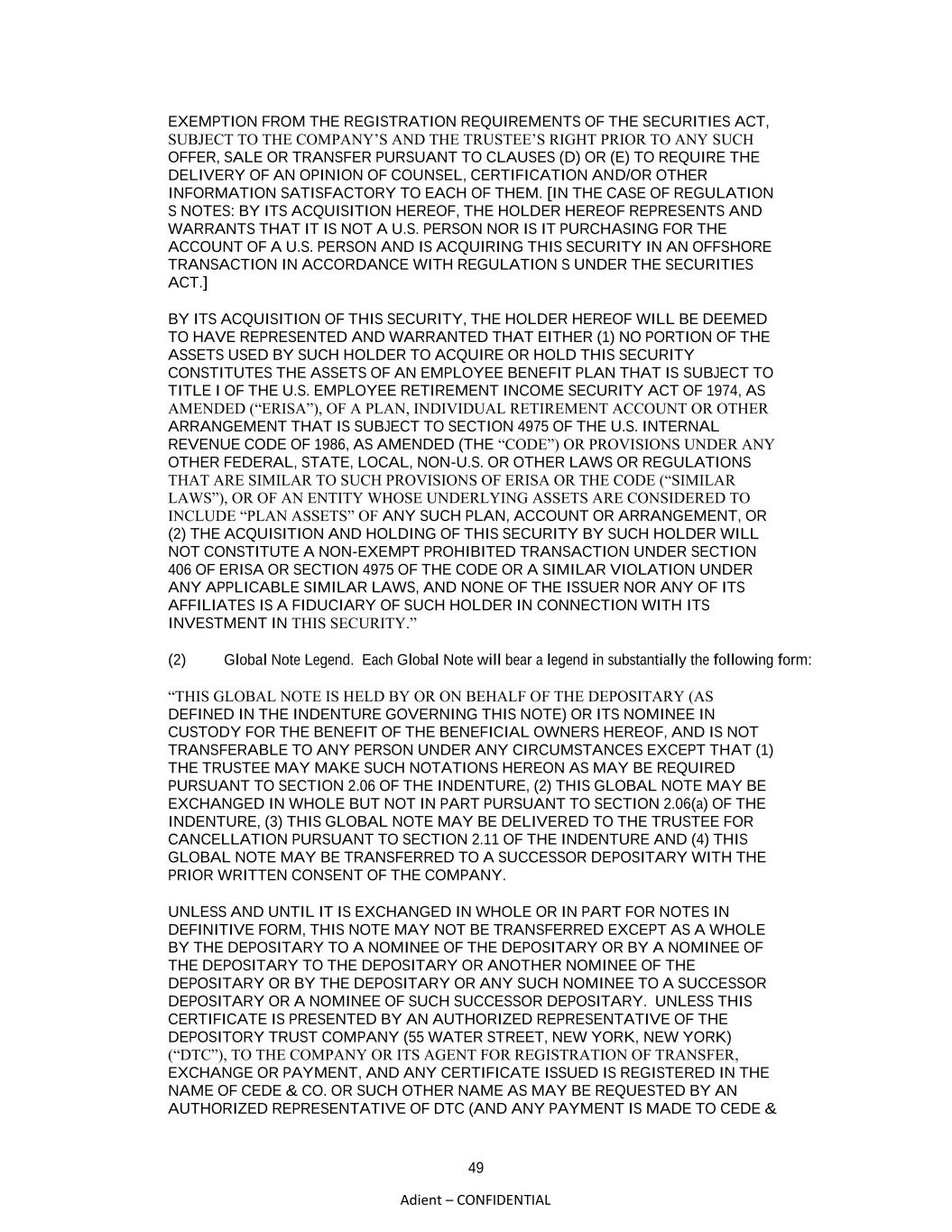 49 Adient – CONFIDENTIAL EXEMPTION FROM THE REGISTRATION REQUIREMENTS OF THE SECURITIES ACT, SUBJECT TO THE COMPANY’S AND THE TRUSTEE’S RIGHT PRIOR TO ANY SUCH OFFER, SALE OR TRANSFER PURSUANT TO CLAUSES (D) OR (E) TO REQUIRE THE DELIVERY OF AN OPINION OF COUNSEL, CERTIFICATION AND/OR OTHER INFORMATION SATISFACTORY TO EACH OF THEM. [IN THE CASE OF REGULATION S NOTES: BY ITS ACQUISITION HEREOF, THE HOLDER HEREOF REPRESENTS AND WARRANTS THAT IT IS NOT A U.S. PERSON NOR IS IT PURCHASING FOR THE ACCOUNT OF A U.S. PERSON AND IS ACQUIRING THIS SECURITY IN AN OFFSHORE TRANSACTION IN ACCORDANCE WITH REGULATION S UNDER THE SECURITIES ACT.] BY ITS ACQUISITION OF THIS SECURITY, THE HOLDER HEREOF WILL BE DEEMED TO HAVE REPRESENTED AND WARRANTED THAT EITHER (1) NO PORTION OF THE ASSETS USED BY SUCH HOLDER TO ACQUIRE OR HOLD THIS SECURITY CONSTITUTES THE ASSETS OF AN EMPLOYEE BENEFIT PLAN THAT IS SUBJECT TO TITLE I OF THE U.S. EMPLOYEE RETIREMENT INCOME SECURITY ACT OF 1974, AS AMENDED (“ERISA”), OF A PLAN, INDIVIDUAL RETIREMENT ACCOUNT OR OTHER ARRANGEMENT THAT IS SUBJECT TO SECTION 4975 OF THE U.S. INTERNAL REVENUE CODE OF 1986, AS AMENDED (THE “CODE”) OR PROVISIONS UNDER ANY OTHER FEDERAL, STATE, LOCAL, NON-U.S. OR OTHER LAWS OR REGULATIONS THAT ARE SIMILAR TO SUCH PROVISIONS OF ERISA OR THE CODE (“SIMILAR LAWS”), OR OF AN ENTITY WHOSE UNDERLYING ASSETS ARE CONSIDERED TO INCLUDE “PLAN ASSETS” OF ANY SUCH PLAN, ACCOUNT OR ARRANGEMENT, OR (2) THE ACQUISITION AND HOLDING OF THIS SECURITY BY SUCH HOLDER WILL NOT CONSTITUTE A NON-EXEMPT PROHIBITED TRANSACTION UNDER SECTION 406 OF ERISA OR SECTION 4975 OF THE CODE OR A SIMILAR VIOLATION UNDER ANY APPLICABLE SIMILAR LAWS, AND NONE OF THE ISSUER NOR ANY OF ITS AFFILIATES IS A FIDUCIARY OF SUCH HOLDER IN CONNECTION WITH ITS INVESTMENT IN THIS SECURITY.” (2) Global Note Legend. Each Global Note will bear a legend in substantially the following form: “THIS GLOBAL NOTE IS HELD BY OR ON BEHALF OF THE DEPOSITARY (AS DEFINED IN THE INDENTURE GOVERNING THIS NOTE) OR ITS NOMINEE IN CUSTODY FOR THE BENEFIT OF THE BENEFICIAL OWNERS HEREOF, AND IS NOT TRANSFERABLE TO ANY PERSON UNDER ANY CIRCUMSTANCES EXCEPT THAT (1) THE TRUSTEE MAY MAKE SUCH NOTATIONS HEREON AS MAY BE REQUIRED PURSUANT TO SECTION 2.06 OF THE INDENTURE, (2) THIS GLOBAL NOTE MAY BE EXCHANGED IN WHOLE BUT NOT IN PART PURSUANT TO SECTION 2.06(a) OF THE INDENTURE, (3) THIS GLOBAL NOTE MAY BE DELIVERED TO THE TRUSTEE FOR CANCELLATION PURSUANT TO SECTION 2.11 OF THE INDENTURE AND (4) THIS GLOBAL NOTE MAY BE TRANSFERRED TO A SUCCESSOR DEPOSITARY WITH THE PRIOR WRITTEN CONSENT OF THE COMPANY. UNLESS AND UNTIL IT IS EXCHANGED IN WHOLE OR IN PART FOR NOTES IN DEFINITIVE FORM, THIS NOTE MAY NOT BE TRANSFERRED EXCEPT AS A WHOLE BY THE DEPOSITARY TO A NOMINEE OF THE DEPOSITARY OR BY A NOMINEE OF THE DEPOSITARY TO THE DEPOSITARY OR ANOTHER NOMINEE OF THE DEPOSITARY OR BY THE DEPOSITARY OR ANY SUCH NOMINEE TO A SUCCESSOR DEPOSITARY OR A NOMINEE OF SUCH SUCCESSOR DEPOSITARY. UNLESS THIS CERTIFICATE IS PRESENTED BY AN AUTHORIZED REPRESENTATIVE OF THE DEPOSITORY TRUST COMPANY (55 WATER STREET, NEW YORK, NEW YORK) (“DTC”), TO THE COMPANY OR ITS AGENT FOR REGISTRATION OF TRANSFER, EXCHANGE OR PAYMENT, AND ANY CERTIFICATE ISSUED IS REGISTERED IN THE NAME OF CEDE & CO. OR SUCH OTHER NAME AS MAY BE REQUESTED BY AN AUTHORIZED REPRESENTATIVE OF DTC (AND ANY PAYMENT IS MADE TO CEDE &