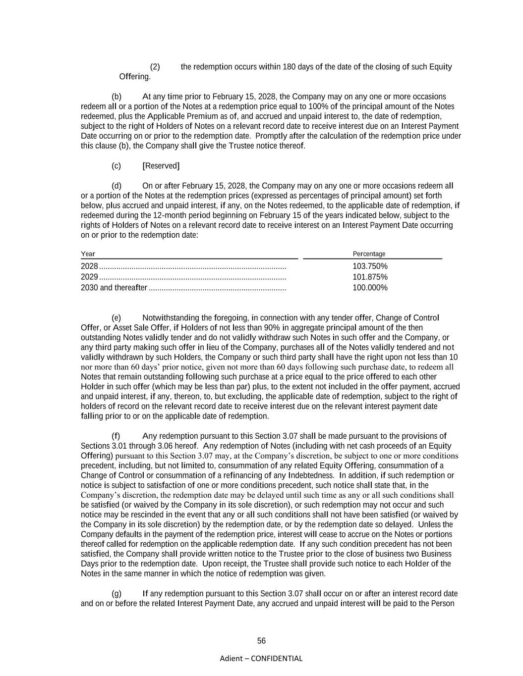 55 Adient – CONFIDENTIAL At the Company’s request, the Trustee will give the notice of redemption in the Company’s name and at the Company’s expense; provided, however, that the Company has delivered to the Trustee, at least 30 days prior to the redemption date (or such shorter period as is acceptable to the Trustee), an Officer’s Certificate requesting that the Trustee give such notice and setting forth the information to be stated in such notice as provided in the preceding paragraph. Section 3.04 Effect of Notice of Redemption. Except as provided in Section 3.07(f) hereof, once notice of redemption is mailed or transmitted in accordance with Section 3.03 hereof, Notes called for redemption become irrevocably due and payable on the redemption date at the redemption price. The notice, if mailed or transmitted in a manner herein provided, shall be conclusively presumed to have been given whether or not the Holder receives such notice. In any case, failure to give such notice by mail or by such other means as may be required hereby or any defect in the notice to the Holder of any Note designated for redemption in whole or in part shall not affect the validity of the proceedings for the redemption of any other Note. Subject to Section 3.05 hereof, on and after the redemption date, interest will cease to accrue on the Notes or portion thereof called for redemption. Section 3.05 Deposit of Redemption or Purchase Price. Prior to 10:00 a.m. Eastern Time on the redemption or purchase date, the Company will deposit with the Trustee or with the Paying Agent money sufficient to pay the redemption or purchase price of, and accrued interest, if any, on, all Notes to be redeemed or purchased on that date. The Trustee or the Paying Agent will promptly return to the Company any money deposited with the Trustee or the Paying Agent by the Company in excess of the amounts necessary to pay the redemption or purchase price of, and accrued interest, if any, on, all Notes to be redeemed or purchased. If the Company complies with the provisions of the preceding paragraph, on and after the redemption or purchase date, interest will cease to accrue on the Notes or the portions of Notes called for redemption or purchase. If any Note called for redemption or purchase is not so paid upon surrender for redemption or purchase because of the failure of the Company to comply with the preceding paragraph, interest shall be paid on the unpaid principal, from the redemption or purchase date until such principal is paid, and to the extent lawful on any interest not paid on such unpaid principal, in each case at the rate provided in the Notes and in Section 4.01 hereof. Section 3.06 Notes Redeemed or Purchased in Part. Upon surrender of a Note that is redeemed or purchased in part, the Company will issue, and upon receipt of an Authentication Order, the Trustee will authenticate for the Holder at the expense of the Company, a new Note equal in principal amount to the unredeemed or unpurchased portion of the Note surrendered (or transfer such Note by book entry). Section 3.07 Optional Redemption. (a) At any time prior to February 15, 2028, the Company may on any one or more occasions redeem up to 40% of the aggregate principal amount of Notes (calculated after giving effect to the issuance of any Additional Notes) issued under this Indenture at a redemption price equal to 107.500% of the principal amount of Notes redeemed, plus accrued and unpaid interest, if any, to the date of redemption (subject to the right of Holders of Notes on a relevant record date to receive interest on an Interest Payment Date occurring on or prior to the redemption date), with the net cash proceeds of an Equity Offering; provided that: (1) at least 50% of the aggregate principal amount of Notes issued under this Indenture (including any Additional Notes, but excluding Notes held by the Company, any direct or indirect parent of the Company or any of the Company’s Subsidiaries) remain outstanding immediately after the occurrence of such redemption; and