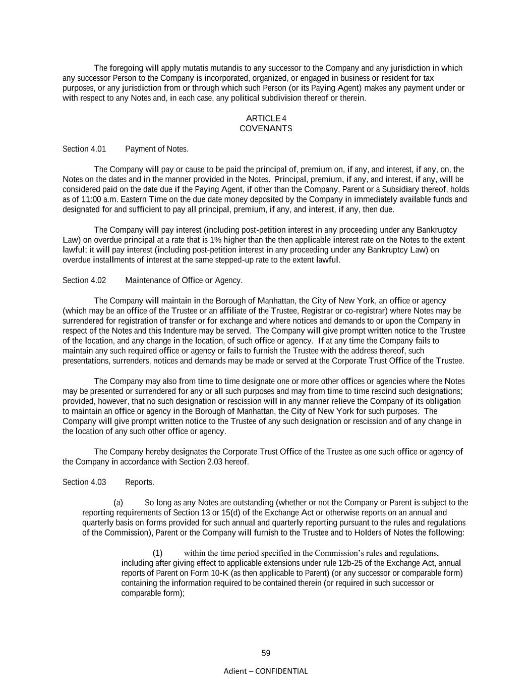 59 Adient – CONFIDENTIAL The foregoing will apply mutatis mutandis to any successor to the Company and any jurisdiction in which any successor Person to the Company is incorporated, organized, or engaged in business or resident for tax purposes, or any jurisdiction from or through which such Person (or its Paying Agent) makes any payment under or with respect to any Notes and, in each case, any political subdivision thereof or therein. ARTICLE 4 COVENANTS Section 4.01 Payment of Notes. The Company will pay or cause to be paid the principal of, premium on, if any, and interest, if any, on, the Notes on the dates and in the manner provided in the Notes. Principal, premium, if any, and interest, if any, will be considered paid on the date due if the Paying Agent, if other than the Company, Parent or a Subsidiary thereof, holds as of 11:00 a.m. Eastern Time on the due date money deposited by the Company in immediately available funds and designated for and sufficient to pay all principal, premium, if any, and interest, if any, then due. The Company will pay interest (including post-petition interest in any proceeding under any Bankruptcy Law) on overdue principal at a rate that is 1% higher than the then applicable interest rate on the Notes to the extent lawful; it will pay interest (including post-petition interest in any proceeding under any Bankruptcy Law) on overdue installments of interest at the same stepped-up rate to the extent lawful. Section 4.02 Maintenance of Office or Agency. The Company will maintain in the Borough of Manhattan, the City of New York, an office or agency (which may be an office of the Trustee or an affiliate of the Trustee, Registrar or co-registrar) where Notes may be surrendered for registration of transfer or for exchange and where notices and demands to or upon the Company in respect of the Notes and this Indenture may be served. The Company will give prompt written notice to the Trustee of the location, and any change in the location, of such office or agency. If at any time the Company fails to maintain any such required office or agency or fails to furnish the Trustee with the address thereof, such presentations, surrenders, notices and demands may be made or served at the Corporate Trust Office of the Trustee. The Company may also from time to time designate one or more other offices or agencies where the Notes may be presented or surrendered for any or all such purposes and may from time to time rescind such designations; provided, however, that no such designation or rescission will in any manner relieve the Company of its obligation to maintain an office or agency in the Borough of Manhattan, the City of New York for such purposes. The Company will give prompt written notice to the Trustee of any such designation or rescission and of any change in the location of any such other office or agency. The Company hereby designates the Corporate Trust Office of the Trustee as one such office or agency of the Company in accordance with Section 2.03 hereof. Section 4.03 Reports. (a) So long as any Notes are outstanding (whether or not the Company or Parent is subject to the reporting requirements of Section 13 or 15(d) of the Exchange Act or otherwise reports on an annual and quarterly basis on forms provided for such annual and quarterly reporting pursuant to the rules and regulations of the Commission), Parent or the Company will furnish to the Trustee and to Holders of Notes the following: (1) within the time period specified in the Commission’s rules and regulations, including after giving effect to applicable extensions under rule 12b-25 of the Exchange Act, annual reports of Parent on Form 10-K (as then applicable to Parent) (or any successor or comparable form) containing the information required to be contained therein (or required in such successor or comparable form);