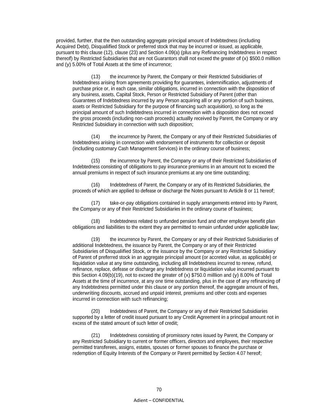70 Adient – CONFIDENTIAL provided, further, that the then outstanding aggregate principal amount of Indebtedness (including Acquired Debt), Disqualified Stock or preferred stock that may be incurred or issued, as applicable, pursuant to this clause (12), clause (23) and Section 4.09(a) (plus any Refinancing Indebtedness in respect thereof) by Restricted Subsidiaries that are not Guarantors shall not exceed the greater of (x) $500.0 million and (y) 5.00% of Total Assets at the time of incurrence; (13) the incurrence by Parent, the Company or their Restricted Subsidiaries of Indebtedness arising from agreements providing for guarantees, indemnification, adjustments of purchase price or, in each case, similar obligations, incurred in connection with the disposition of any business, assets, Capital Stock, Person or Restricted Subsidiary of Parent (other than Guarantees of Indebtedness incurred by any Person acquiring all or any portion of such business, assets or Restricted Subsidiary for the purpose of financing such acquisition), so long as the principal amount of such Indebtedness incurred in connection with a disposition does not exceed the gross proceeds (including non-cash proceeds) actually received by Parent, the Company or any Restricted Subsidiary in connection with such disposition; (14) the incurrence by Parent, the Company or any of their Restricted Subsidiaries of Indebtedness arising in connection with endorsement of instruments for collection or deposit (including customary Cash Management Services) in the ordinary course of business; (15) the incurrence by Parent, the Company or any of their Restricted Subsidiaries of Indebtedness consisting of obligations to pay insurance premiums in an amount not to exceed the annual premiums in respect of such insurance premiums at any one time outstanding; (16) Indebtedness of Parent, the Company or any of its Restricted Subsidiaries, the proceeds of which are applied to defease or discharge the Notes pursuant to Article 8 or 11 hereof; (17) take-or-pay obligations contained in supply arrangements entered into by Parent, the Company or any of their Restricted Subsidiaries in the ordinary course of business; (18) Indebtedness related to unfunded pension fund and other employee benefit plan obligations and liabilities to the extent they are permitted to remain unfunded under applicable law; (19) the incurrence by Parent, the Company or any of their Restricted Subsidiaries of additional Indebtedness, the issuance by Parent, the Company or any of their Restricted Subsidiaries of Disqualified Stock, or the issuance by the Company or any Restricted Subsidiary of Parent of preferred stock in an aggregate principal amount (or accreted value, as applicable) or liquidation value at any time outstanding, including all Indebtedness incurred to renew, refund, refinance, replace, defease or discharge any Indebtedness or liquidation value incurred pursuant to this Section 4.09(b)(19), not to exceed the greater of (x) $750.0 million and (y) 8.00% of Total Assets at the time of incurrence, at any one time outstanding, plus in the case of any refinancing of any Indebtedness permitted under this clause or any portion thereof, the aggregate amount of fees, underwriting discounts, accrued and unpaid interest, premiums and other costs and expenses incurred in connection with such refinancing; (20) Indebtedness of Parent, the Company or any of their Restricted Subsidiaries supported by a letter of credit issued pursuant to any Credit Agreement in a principal amount not in excess of the stated amount of such letter of credit; (21) Indebtedness consisting of promissory notes issued by Parent, the Company or any Restricted Subsidiary to current or former officers, directors and employees, their respective permitted transferees, assigns, estates, spouses or former spouses to finance the purchase or redemption of Equity Interests of the Company or Parent permitted by Section 4.07 hereof;