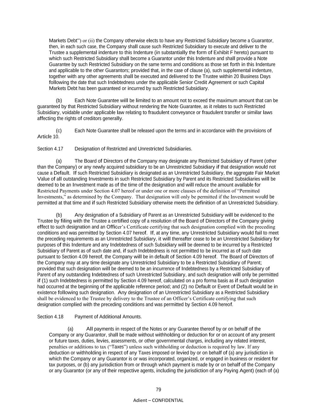 79 Adient – CONFIDENTIAL Markets Debt”) or (ii) the Company otherwise elects to have any Restricted Subsidiary become a Guarantor, then, in each such case, the Company shall cause such Restricted Subsidiary to execute and deliver to the Trustee a supplemental indenture to this Indenture (in substantially the form of Exhibit F hereto) pursuant to which such Restricted Subsidiary shall become a Guarantor under this Indenture and shall provide a Note Guarantee by such Restricted Subsidiary on the same terms and conditions as those set forth in this Indenture and applicable to the other Guarantors; provided that, in the case of clause (a), such supplemental indenture, together with any other agreements shall be executed and delivered to the Trustee within 20 Business Days following the date that such Indebtedness under the applicable Senior Credit Agreement or such Capital Markets Debt has been guaranteed or incurred by such Restricted Subsidiary. (b) Each Note Guarantee will be limited to an amount not to exceed the maximum amount that can be guaranteed by that Restricted Subsidiary without rendering the Note Guarantee, as it relates to such Restricted Subsidiary, voidable under applicable law relating to fraudulent conveyance or fraudulent transfer or similar laws affecting the rights of creditors generally. (c) Each Note Guarantee shall be released upon the terms and in accordance with the provisions of Article 10. Section 4.17 Designation of Restricted and Unrestricted Subsidiaries. (a) The Board of Directors of the Company may designate any Restricted Subsidiary of Parent (other than the Company) or any newly acquired subsidiary to be an Unrestricted Subsidiary if that designation would not cause a Default. If such Restricted Subsidiary is designated as an Unrestricted Subsidiary, the aggregate Fair Market Value of all outstanding Investments in such Restricted Subsidiary by Parent and its Restricted Subsidiaries will be deemed to be an Investment made as of the time of the designation and will reduce the amount available for Restricted Payments under Section 4.07 hereof or under one or more clauses of the definition of “Permitted Investments,” as determined by the Company. That designation will only be permitted if the Investment would be permitted at that time and if such Restricted Subsidiary otherwise meets the definition of an Unrestricted Subsidiary. (b) Any designation of a Subsidiary of Parent as an Unrestricted Subsidiary will be evidenced to the Trustee by filing with the Trustee a certified copy of a resolution of the Board of Directors of the Company giving effect to such designation and an Officer’s Certificate certifying that such designation complied with the preceding conditions and was permitted by Section 4.07 hereof. If, at any time, any Unrestricted Subsidiary would fail to meet the preceding requirements as an Unrestricted Subsidiary, it will thereafter cease to be an Unrestricted Subsidiary for purposes of this Indenture and any Indebtedness of such Subsidiary will be deemed to be incurred by a Restricted Subsidiary of Parent as of such date and, if such Indebtedness is not permitted to be incurred as of such date pursuant to Section 4.09 hereof, the Company will be in default of Section 4.09 hereof. The Board of Directors of the Company may at any time designate any Unrestricted Subsidiary to be a Restricted Subsidiary of Parent; provided that such designation will be deemed to be an incurrence of Indebtedness by a Restricted Subsidiary of Parent of any outstanding Indebtedness of such Unrestricted Subsidiary, and such designation will only be permitted if (1) such Indebtedness is permitted by Section 4.09 hereof, calculated on a pro forma basis as if such designation had occurred at the beginning of the applicable reference period; and (2) no Default or Event of Default would be in existence following such designation. Any designation of an Unrestricted Subsidiary as a Restricted Subsidiary shall be evidenced to the Trustee by delivery to the Trustee of an Officer’s Certificate certifying that such designation complied with the preceding conditions and was permitted by Section 4.09 hereof. Section 4.18 Payment of Additional Amounts. (a) All payments in respect of the Notes or any Guarantee thereof by or on behalf of the Company or any Guarantor, shall be made without withholding or deduction for or on account of any present or future taxes, duties, levies, assessments, or other governmental charges, including any related interest, penalties or additions to tax (“Taxes”) unless such withholding or deduction is required by law. If any deduction or withholding in respect of any Taxes imposed or levied by or on behalf of (a) any jurisdiction in which the Company or any Guarantor is or was incorporated, organized, or engaged in business or resident for tax purposes, or (b) any jurisdiction from or through which payment is made by or on behalf of the Company or any Guarantor (or any of their respective agents, including the jurisdiction of any Paying Agent) (each of (a)