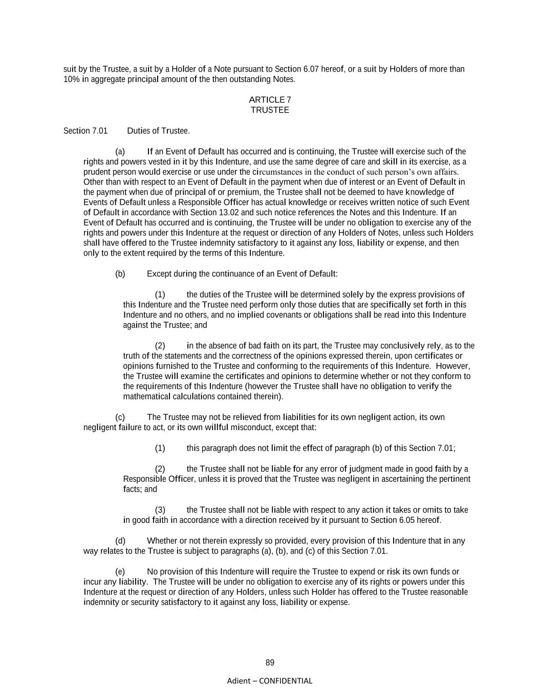 89 Adient – CONFIDENTIAL suit by the Trustee, a suit by a Holder of a Note pursuant to Section 6.07 hereof, or a suit by Holders of more than 10% in aggregate principal amount of the then outstanding Notes. ARTICLE 7 TRUSTEE Section 7.01 Duties of Trustee. (a) If an Event of Default has occurred and is continuing, the Trustee will exercise such of the rights and powers vested in it by this Indenture, and use the same degree of care and skill in its exercise, as a prudent person would exercise or use under the circumstances in the conduct of such person’s own affairs. Other than with respect to an Event of Default in the payment when due of interest or an Event of Default in the payment when due of principal of or premium, the Trustee shall not be deemed to have knowledge of Events of Default unless a Responsible Officer has actual knowledge or receives written notice of such Event of Default in accordance with Section 13.02 and such notice references the Notes and this Indenture. If an Event of Default has occurred and is continuing, the Trustee will be under no obligation to exercise any of the rights and powers under this Indenture at the request or direction of any Holders of Notes, unless such Holders shall have offered to the Trustee indemnity satisfactory to it against any loss, liability or expense, and then only to the extent required by the terms of this Indenture. (b) Except during the continuance of an Event of Default: (1) the duties of the Trustee will be determined solely by the express provisions of this Indenture and the Trustee need perform only those duties that are specifically set forth in this Indenture and no others, and no implied covenants or obligations shall be read into this Indenture against the Trustee; and (2) in the absence of bad faith on its part, the Trustee may conclusively rely, as to the truth of the statements and the correctness of the opinions expressed therein, upon certificates or opinions furnished to the Trustee and conforming to the requirements of this Indenture. However, the Trustee will examine the certificates and opinions to determine whether or not they conform to the requirements of this Indenture (however the Trustee shall have no obligation to verify the mathematical calculations contained therein). (c) The Trustee may not be relieved from liabilities for its own negligent action, its own negligent failure to act, or its own willful misconduct, except that: (1) this paragraph does not limit the effect of paragraph (b) of this Section 7.01; (2) the Trustee shall not be liable for any error of judgment made in good faith by a Responsible Officer, unless it is proved that the Trustee was negligent in ascertaining the pertinent facts; and (3) the Trustee shall not be liable with respect to any action it takes or omits to take in good faith in accordance with a direction received by it pursuant to Section 6.05 hereof. (d) Whether or not therein expressly so provided, every provision of this Indenture that in any way relates to the Trustee is subject to paragraphs (a), (b), and (c) of this Section 7.01. (e) No provision of this Indenture will require the Trustee to expend or risk its own funds or incur any liability. The Trustee will be under no obligation to exercise any of its rights or powers under this Indenture at the request or direction of any Holders, unless such Holder has offered to the Trustee reasonable indemnity or security satisfactory to it against any loss, liability or expense.