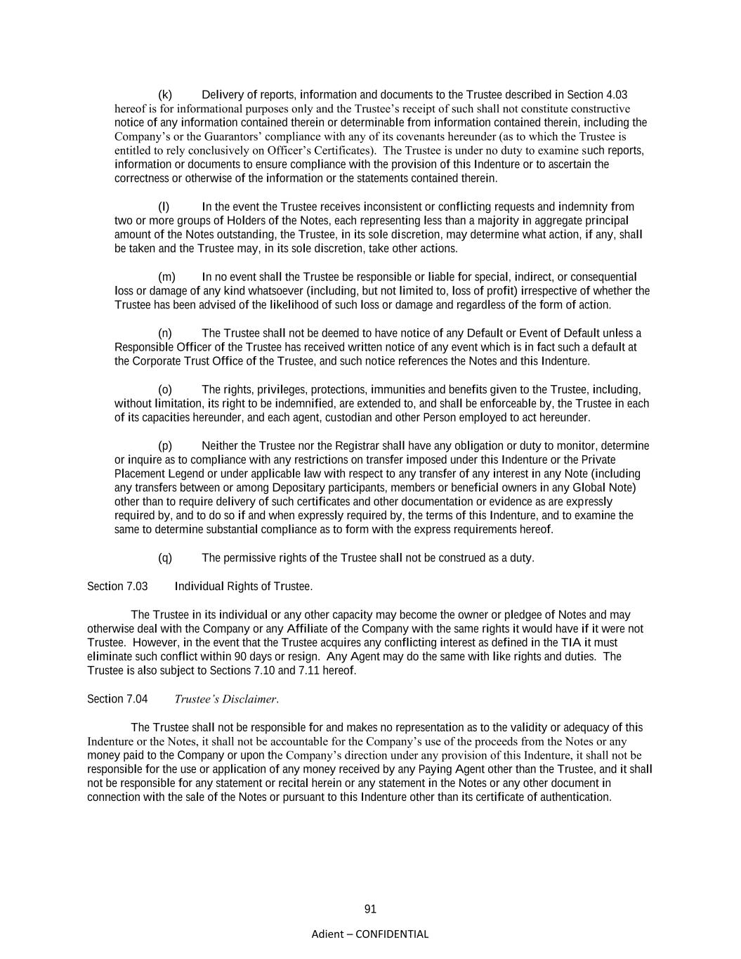 91 Adient – CONFIDENTIAL (k) Delivery of reports, information and documents to the Trustee described in Section 4.03 hereof is for informational purposes only and the Trustee’s receipt of such shall not constitute constructive notice of any information contained therein or determinable from information contained therein, including the Company’s or the Guarantors’ compliance with any of its covenants hereunder (as to which the Trustee is entitled to rely conclusively on Officer’s Certificates). The Trustee is under no duty to examine such reports, information or documents to ensure compliance with the provision of this Indenture or to ascertain the correctness or otherwise of the information or the statements contained therein. (l) In the event the Trustee receives inconsistent or conflicting requests and indemnity from two or more groups of Holders of the Notes, each representing less than a majority in aggregate principal amount of the Notes outstanding, the Trustee, in its sole discretion, may determine what action, if any, shall be taken and the Trustee may, in its sole discretion, take other actions. (m) In no event shall the Trustee be responsible or liable for special, indirect, or consequential loss or damage of any kind whatsoever (including, but not limited to, loss of profit) irrespective of whether the Trustee has been advised of the likelihood of such loss or damage and regardless of the form of action. (n) The Trustee shall not be deemed to have notice of any Default or Event of Default unless a Responsible Officer of the Trustee has received written notice of any event which is in fact such a default at the Corporate Trust Office of the Trustee, and such notice references the Notes and this Indenture. (o) The rights, privileges, protections, immunities and benefits given to the Trustee, including, without limitation, its right to be indemnified, are extended to, and shall be enforceable by, the Trustee in each of its capacities hereunder, and each agent, custodian and other Person employed to act hereunder. (p) Neither the Trustee nor the Registrar shall have any obligation or duty to monitor, determine or inquire as to compliance with any restrictions on transfer imposed under this Indenture or the Private Placement Legend or under applicable law with respect to any transfer of any interest in any Note (including any transfers between or among Depositary participants, members or beneficial owners in any Global Note) other than to require delivery of such certificates and other documentation or evidence as are expressly required by, and to do so if and when expressly required by, the terms of this Indenture, and to examine the same to determine substantial compliance as to form with the express requirements hereof. (q) The permissive rights of the Trustee shall not be construed as a duty. Section 7.03 Individual Rights of Trustee. The Trustee in its individual or any other capacity may become the owner or pledgee of Notes and may otherwise deal with the Company or any Affiliate of the Company with the same rights it would have if it were not Trustee. However, in the event that the Trustee acquires any conflicting interest as defined in the TIA it must eliminate such conflict within 90 days or resign. Any Agent may do the same with like rights and duties. The Trustee is also subject to Sections 7.10 and 7.11 hereof. Section 7.04 Trustee’s Disclaimer. The Trustee shall not be responsible for and makes no representation as to the validity or adequacy of this Indenture or the Notes, it shall not be accountable for the Company’s use of the proceeds from the Notes or any money paid to the Company or upon the Company’s direction under any provision of this Indenture, it shall not be responsible for the use or application of any money received by any Paying Agent other than the Trustee, and it shall not be responsible for any statement or recital herein or any statement in the Notes or any other document in connection with the sale of the Notes or pursuant to this Indenture other than its certificate of authentication.