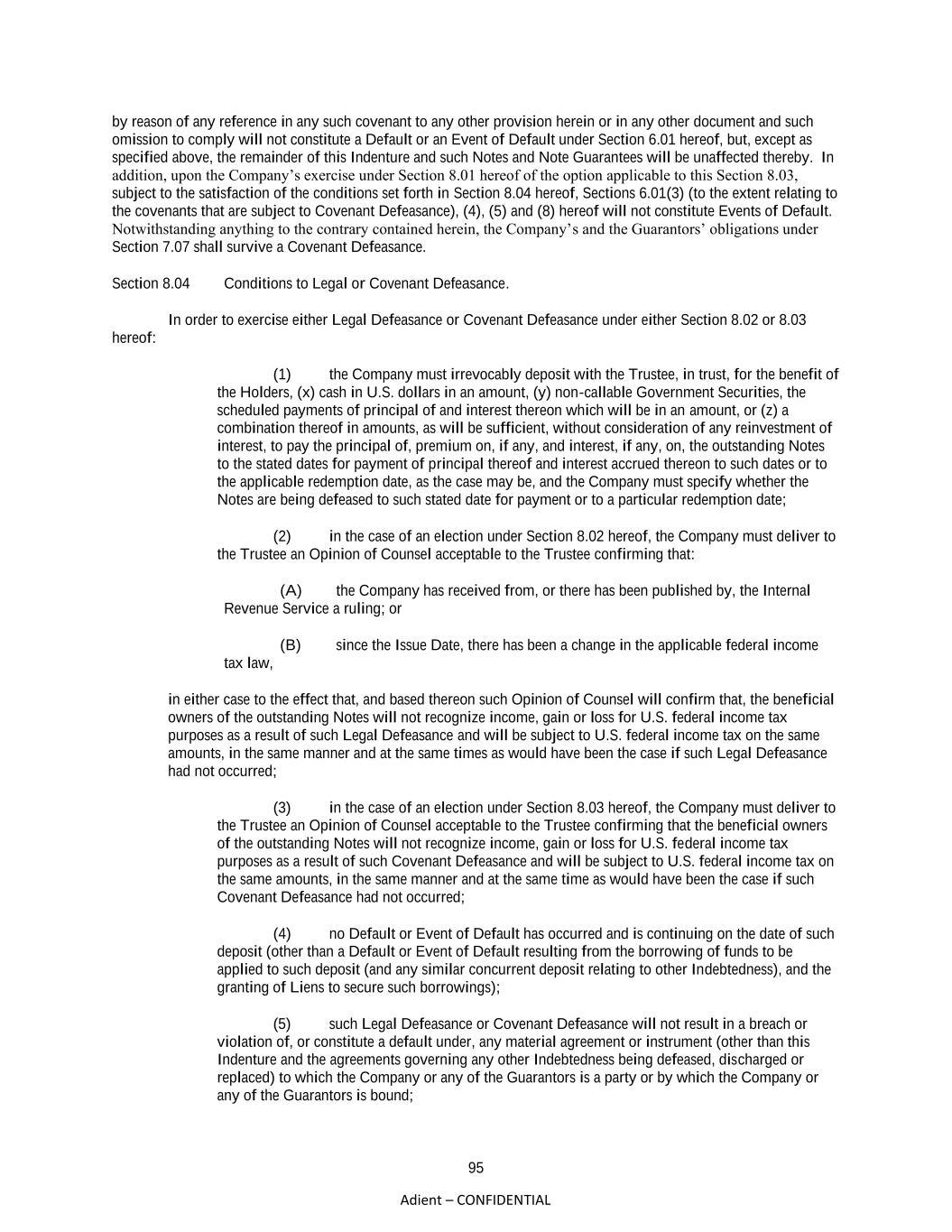 95 Adient – CONFIDENTIAL by reason of any reference in any such covenant to any other provision herein or in any other document and such omission to comply will not constitute a Default or an Event of Default under Section 6.01 hereof, but, except as specified above, the remainder of this Indenture and such Notes and Note Guarantees will be unaffected thereby. In addition, upon the Company’s exercise under Section 8.01 hereof of the option applicable to this Section 8.03, subject to the satisfaction of the conditions set forth in Section 8.04 hereof, Sections 6.01(3) (to the extent relating to the covenants that are subject to Covenant Defeasance), (4), (5) and (8) hereof will not constitute Events of Default. Notwithstanding anything to the contrary contained herein, the Company’s and the Guarantors’ obligations under Section 7.07 shall survive a Covenant Defeasance. Section 8.04 Conditions to Legal or Covenant Defeasance. In order to exercise either Legal Defeasance or Covenant Defeasance under either Section 8.02 or 8.03 hereof: (1) the Company must irrevocably deposit with the Trustee, in trust, for the benefit of the Holders, (x) cash in U.S. dollars in an amount, (y) non-callable Government Securities, the scheduled payments of principal of and interest thereon which will be in an amount, or (z) a combination thereof in amounts, as will be sufficient, without consideration of any reinvestment of interest, to pay the principal of, premium on, if any, and interest, if any, on, the outstanding Notes to the stated dates for payment of principal thereof and interest accrued thereon to such dates or to the applicable redemption date, as the case may be, and the Company must specify whether the Notes are being defeased to such stated date for payment or to a particular redemption date; (2) in the case of an election under Section 8.02 hereof, the Company must deliver to the Trustee an Opinion of Counsel acceptable to the Trustee confirming that: (A) the Company has received from, or there has been published by, the Internal Revenue Service a ruling; or (B) since the Issue Date, there has been a change in the applicable federal income tax law, in either case to the effect that, and based thereon such Opinion of Counsel will confirm that, the beneficial owners of the outstanding Notes will not recognize income, gain or loss for U.S. federal income tax purposes as a result of such Legal Defeasance and will be subject to U.S. federal income tax on the same amounts, in the same manner and at the same times as would have been the case if such Legal Defeasance had not occurred; (3) in the case of an election under Section 8.03 hereof, the Company must deliver to the Trustee an Opinion of Counsel acceptable to the Trustee confirming that the beneficial owners of the outstanding Notes will not recognize income, gain or loss for U.S. federal income tax purposes as a result of such Covenant Defeasance and will be subject to U.S. federal income tax on the same amounts, in the same manner and at the same time as would have been the case if such Covenant Defeasance had not occurred; (4) no Default or Event of Default has occurred and is continuing on the date of such deposit (other than a Default or Event of Default resulting from the borrowing of funds to be applied to such deposit (and any similar concurrent deposit relating to other Indebtedness), and the granting of Liens to secure such borrowings); (5) such Legal Defeasance or Covenant Defeasance will not result in a breach or violation of, or constitute a default under, any material agreement or instrument (other than this Indenture and the agreements governing any other Indebtedness being defeased, discharged or replaced) to which the Company or any of the Guarantors is a party or by which the Company or any of the Guarantors is bound;
