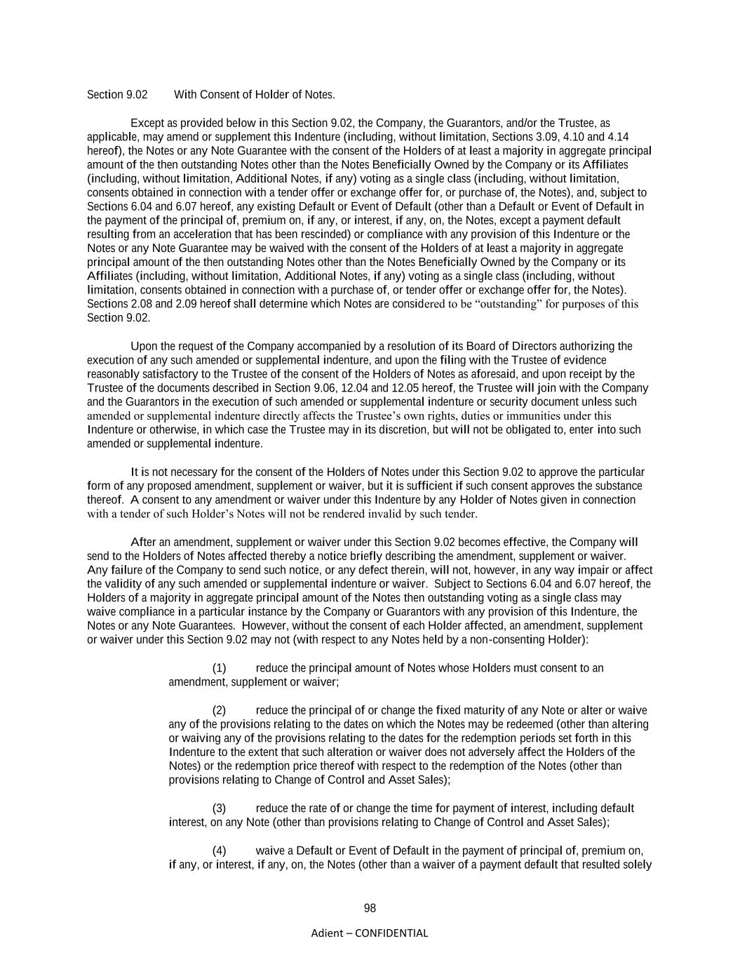 98 Adient – CONFIDENTIAL Section 9.02 With Consent of Holder of Notes. Except as provided below in this Section 9.02, the Company, the Guarantors, and/or the Trustee, as applicable, may amend or supplement this Indenture (including, without limitation, Sections 3.09, 4.10 and 4.14 hereof), the Notes or any Note Guarantee with the consent of the Holders of at least a majority in aggregate principal amount of the then outstanding Notes other than the Notes Beneficially Owned by the Company or its Affiliates (including, without limitation, Additional Notes, if any) voting as a single class (including, without limitation, consents obtained in connection with a tender offer or exchange offer for, or purchase of, the Notes), and, subject to Sections 6.04 and 6.07 hereof, any existing Default or Event of Default (other than a Default or Event of Default in the payment of the principal of, premium on, if any, or interest, if any, on, the Notes, except a payment default resulting from an acceleration that has been rescinded) or compliance with any provision of this Indenture or the Notes or any Note Guarantee may be waived with the consent of the Holders of at least a majority in aggregate principal amount of the then outstanding Notes other than the Notes Beneficially Owned by the Company or its Affiliates (including, without limitation, Additional Notes, if any) voting as a single class (including, without limitation, consents obtained in connection with a purchase of, or tender offer or exchange offer for, the Notes). Sections 2.08 and 2.09 hereof shall determine which Notes are considered to be “outstanding” for purposes of this Section 9.02. Upon the request of the Company accompanied by a resolution of its Board of Directors authorizing the execution of any such amended or supplemental indenture, and upon the filing with the Trustee of evidence reasonably satisfactory to the Trustee of the consent of the Holders of Notes as aforesaid, and upon receipt by the Trustee of the documents described in Section 9.06, 12.04 and 12.05 hereof, the Trustee will join with the Company and the Guarantors in the execution of such amended or supplemental indenture or security document unless such amended or supplemental indenture directly affects the Trustee’s own rights, duties or immunities under this Indenture or otherwise, in which case the Trustee may in its discretion, but will not be obligated to, enter into such amended or supplemental indenture. It is not necessary for the consent of the Holders of Notes under this Section 9.02 to approve the particular form of any proposed amendment, supplement or waiver, but it is sufficient if such consent approves the substance thereof. A consent to any amendment or waiver under this Indenture by any Holder of Notes given in connection with a tender of such Holder’s Notes will not be rendered invalid by such tender. After an amendment, supplement or waiver under this Section 9.02 becomes effective, the Company will send to the Holders of Notes affected thereby a notice briefly describing the amendment, supplement or waiver. Any failure of the Company to send such notice, or any defect therein, will not, however, in any way impair or affect the validity of any such amended or supplemental indenture or waiver. Subject to Sections 6.04 and 6.07 hereof, the Holders of a majority in aggregate principal amount of the Notes then outstanding voting as a single class may waive compliance in a particular instance by the Company or Guarantors with any provision of this Indenture, the Notes or any Note Guarantees. However, without the consent of each Holder affected, an amendment, supplement or waiver under this Section 9.02 may not (with respect to any Notes held by a non-consenting Holder): (1) reduce the principal amount of Notes whose Holders must consent to an amendment, supplement or waiver; (2) reduce the principal of or change the fixed maturity of any Note or alter or waive any of the provisions relating to the dates on which the Notes may be redeemed (other than altering or waiving any of the provisions relating to the dates for the redemption periods set forth in this Indenture to the extent that such alteration or waiver does not adversely affect the Holders of the Notes) or the redemption price thereof with respect to the redemption of the Notes (other than provisions relating to Change of Control and Asset Sales); (3) reduce the rate of or change the time for payment of interest, including default interest, on any Note (other than provisions relating to Change of Control and Asset Sales); (4) waive a Default or Event of Default in the payment of principal of, premium on, if any, or interest, if any, on, the Notes (other than a waiver of a payment default that resulted solely