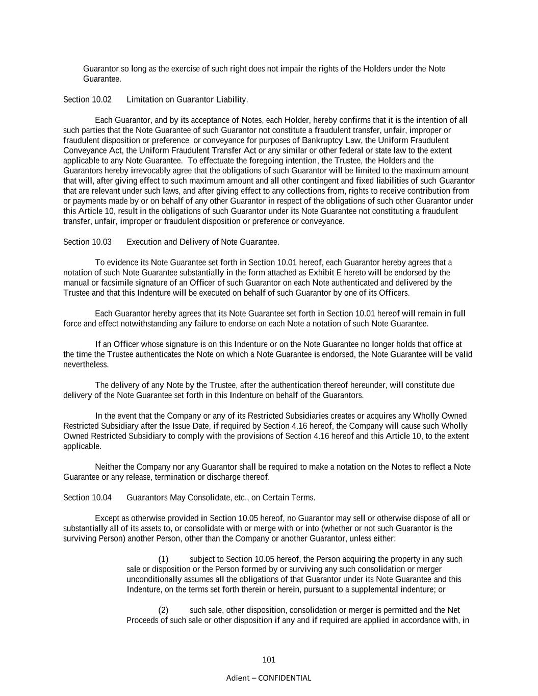 101 Adient – CONFIDENTIAL Guarantor so long as the exercise of such right does not impair the rights of the Holders under the Note Guarantee. Section 10.02 Limitation on Guarantor Liability. Each Guarantor, and by its acceptance of Notes, each Holder, hereby confirms that it is the intention of all such parties that the Note Guarantee of such Guarantor not constitute a fraudulent transfer, unfair, improper or fraudulent disposition or preference or conveyance for purposes of Bankruptcy Law, the Uniform Fraudulent Conveyance Act, the Uniform Fraudulent Transfer Act or any similar or other federal or state law to the extent applicable to any Note Guarantee. To effectuate the foregoing intention, the Trustee, the Holders and the Guarantors hereby irrevocably agree that the obligations of such Guarantor will be limited to the maximum amount that will, after giving effect to such maximum amount and all other contingent and fixed liabilities of such Guarantor that are relevant under such laws, and after giving effect to any collections from, rights to receive contribution from or payments made by or on behalf of any other Guarantor in respect of the obligations of such other Guarantor under this Article 10, result in the obligations of such Guarantor under its Note Guarantee not constituting a fraudulent transfer, unfair, improper or fraudulent disposition or preference or conveyance. Section 10.03 Execution and Delivery of Note Guarantee. To evidence its Note Guarantee set forth in Section 10.01 hereof, each Guarantor hereby agrees that a notation of such Note Guarantee substantially in the form attached as Exhibit E hereto will be endorsed by the manual or facsimile signature of an Officer of such Guarantor on each Note authenticated and delivered by the Trustee and that this Indenture will be executed on behalf of such Guarantor by one of its Officers. Each Guarantor hereby agrees that its Note Guarantee set forth in Section 10.01 hereof will remain in full force and effect notwithstanding any failure to endorse on each Note a notation of such Note Guarantee. If an Officer whose signature is on this Indenture or on the Note Guarantee no longer holds that office at the time the Trustee authenticates the Note on which a Note Guarantee is endorsed, the Note Guarantee will be valid nevertheless. The delivery of any Note by the Trustee, after the authentication thereof hereunder, will constitute due delivery of the Note Guarantee set forth in this Indenture on behalf of the Guarantors. In the event that the Company or any of its Restricted Subsidiaries creates or acquires any Wholly Owned Restricted Subsidiary after the Issue Date, if required by Section 4.16 hereof, the Company will cause such Wholly Owned Restricted Subsidiary to comply with the provisions of Section 4.16 hereof and this Article 10, to the extent applicable. Neither the Company nor any Guarantor shall be required to make a notation on the Notes to reflect a Note Guarantee or any release, termination or discharge thereof. Section 10.04 Guarantors May Consolidate, etc., on Certain Terms. Except as otherwise provided in Section 10.05 hereof, no Guarantor may sell or otherwise dispose of all or substantially all of its assets to, or consolidate with or merge with or into (whether or not such Guarantor is the surviving Person) another Person, other than the Company or another Guarantor, unless either: (1) subject to Section 10.05 hereof, the Person acquiring the property in any such sale or disposition or the Person formed by or surviving any such consolidation or merger unconditionally assumes all the obligations of that Guarantor under its Note Guarantee and this Indenture, on the terms set forth therein or herein, pursuant to a supplemental indenture; or (2) such sale, other disposition, consolidation or merger is permitted and the Net Proceeds of such sale or other disposition if any and if required are applied in accordance with, in