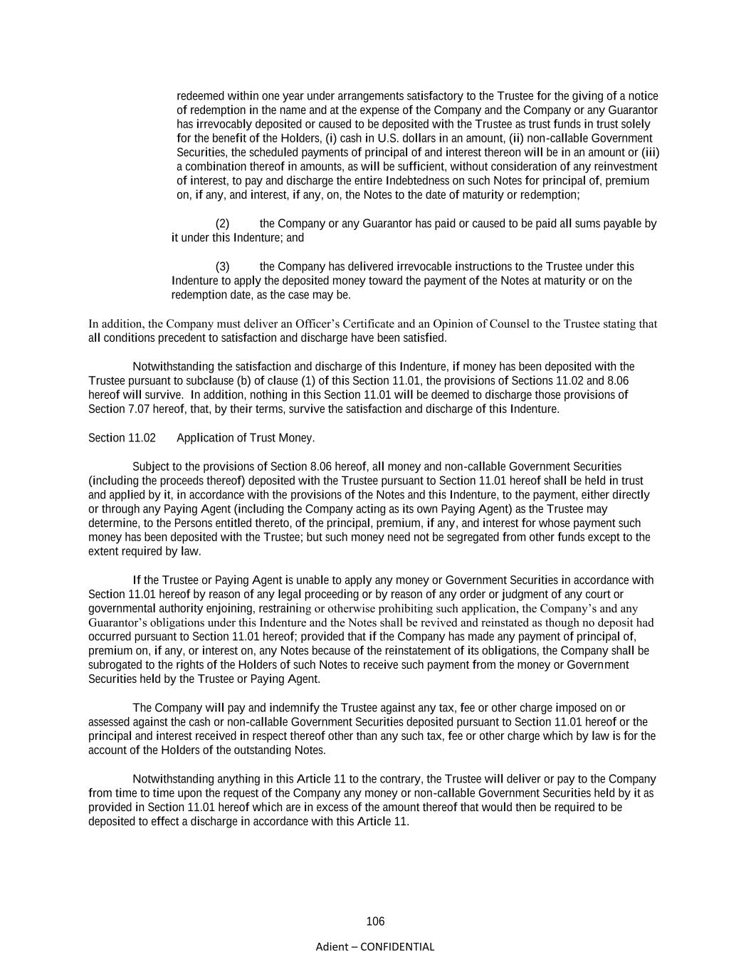 106 Adient – CONFIDENTIAL redeemed within one year under arrangements satisfactory to the Trustee for the giving of a notice of redemption in the name and at the expense of the Company and the Company or any Guarantor has irrevocably deposited or caused to be deposited with the Trustee as trust funds in trust solely for the benefit of the Holders, (i) cash in U.S. dollars in an amount, (ii) non-callable Government Securities, the scheduled payments of principal of and interest thereon will be in an amount or (iii) a combination thereof in amounts, as will be sufficient, without consideration of any reinvestment of interest, to pay and discharge the entire Indebtedness on such Notes for principal of, premium on, if any, and interest, if any, on, the Notes to the date of maturity or redemption; (2) the Company or any Guarantor has paid or caused to be paid all sums payable by it under this Indenture; and (3) the Company has delivered irrevocable instructions to the Trustee under this Indenture to apply the deposited money toward the payment of the Notes at maturity or on the redemption date, as the case may be. In addition, the Company must deliver an Officer’s Certificate and an Opinion of Counsel to the Trustee stating that all conditions precedent to satisfaction and discharge have been satisfied. Notwithstanding the satisfaction and discharge of this Indenture, if money has been deposited with the Trustee pursuant to subclause (b) of clause (1) of this Section 11.01, the provisions of Sections 11.02 and 8.06 hereof will survive. In addition, nothing in this Section 11.01 will be deemed to discharge those provisions of Section 7.07 hereof, that, by their terms, survive the satisfaction and discharge of this Indenture. Section 11.02 Application of Trust Money. Subject to the provisions of Section 8.06 hereof, all money and non-callable Government Securities (including the proceeds thereof) deposited with the Trustee pursuant to Section 11.01 hereof shall be held in trust and applied by it, in accordance with the provisions of the Notes and this Indenture, to the payment, either directly or through any Paying Agent (including the Company acting as its own Paying Agent) as the Trustee may determine, to the Persons entitled thereto, of the principal, premium, if any, and interest for whose payment such money has been deposited with the Trustee; but such money need not be segregated from other funds except to the extent required by law. If the Trustee or Paying Agent is unable to apply any money or Government Securities in accordance with Section 11.01 hereof by reason of any legal proceeding or by reason of any order or judgment of any court or governmental authority enjoining, restraining or otherwise prohibiting such application, the Company’s and any Guarantor’s obligations under this Indenture and the Notes shall be revived and reinstated as though no deposit had occurred pursuant to Section 11.01 hereof; provided that if the Company has made any payment of principal of, premium on, if any, or interest on, any Notes because of the reinstatement of its obligations, the Company shall be subrogated to the rights of the Holders of such Notes to receive such payment from the money or Government Securities held by the Trustee or Paying Agent. The Company will pay and indemnify the Trustee against any tax, fee or other charge imposed on or assessed against the cash or non-callable Government Securities deposited pursuant to Section 11.01 hereof or the principal and interest received in respect thereof other than any such tax, fee or other charge which by law is for the account of the Holders of the outstanding Notes. Notwithstanding anything in this Article 11 to the contrary, the Trustee will deliver or pay to the Company from time to time upon the request of the Company any money or non-callable Government Securities held by it as provided in Section 11.01 hereof which are in excess of the amount thereof that would then be required to be deposited to effect a discharge in accordance with this Article 11.