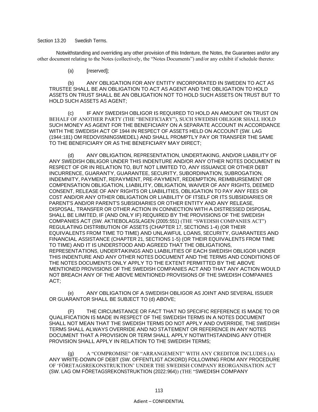 113 Adient – CONFIDENTIAL Section 13.20 Swedish Terms. Notwithstanding and overriding any other provision of this Indenture, the Notes, the Guarantees and/or any other document relating to the Notes (collectively, the “Notes Documents”) and/or any exhibit if schedule thereto: (a) [reserved]; (b) ANY OBLIGATION FOR ANY ENTITY INCORPORATED IN SWEDEN TO ACT AS TRUSTEE SHALL BE AN OBLIGATION TO ACT AS AGENT AND THE OBLIGATION TO HOLD ASSETS ON TRUST SHALL BE AN OBLIGATION NOT TO HOLD SUCH ASSETS ON TRUST BUT TO HOLD SUCH ASSETS AS AGENT; (c) IF ANY SWEDISH OBLIGOR IS REQUIRED TO HOLD AN AMOUNT ON TRUST ON BEHALF OF ANOTHER PARTY (THE “BENEFICIARY”), SUCH SWEDISH OBLIGOR SHALL HOLD SUCH MONEY AS AGENT FOR THE BENEFICIARY ON A SEPARATE ACCOUNT IN ACCORDANCE WITH THE SWEDISH ACT OF 1944 IN RESPECT OF ASSETS HELD ON ACCOUNT (SW. LAG (1944:181) OM REDOVISNINGSMEDEL) AND SHALL PROMPTLY PAY OR TRANSFER THE SAME TO THE BENEFICIARY OR AS THE BENEFICIARY MAY DIRECT; (d) ANY OBLIGATION, REPRESENTATION, UNDERTAKING, AND/OR LIABILITY OF ANY SWEDISH OBLIGOR UNDER THIS INDENTURE AND/OR ANY OTHER NOTES DOCUMENT IN RESPECT OF OR IN RELATION TO, BUT NOT LIMITED TO, ANY ISSUANCE OR OTHER DEBT INCURRENCE, GUARANTY, GUARANTEE, SECURITY, SUBORDINATION, SUBROGATION, INDEMNITY, PAYMENT, REPAYMENT, PRE-PAYMENT, REDEMPTION, REIMBURSEMENT OR COMPENSATION OBLIGATION, LIABILITY, OBLIGATION, WAIVER OF ANY RIGHTS, DEEMED CONSENT, RELEASE OF ANY RIGHTS OR LIABILITIES, OBLIGATION TO PAY ANY FEES OR COST AND/OR ANY OTHER OBLIGATION OR LIABILITY OF ITSELF OR ITS SUBSIDIARIES OR PARENT'S AND/OR PARENT'S SUBSIDIARIES OR OTHER ENTITY AND ANY RELEASE, DISPOSAL, TRANSFER OR OTHER ACTION IN CONNECTION WITH A DISTRESSED DISPOSAL SHALL BE LIMITED, IF (AND ONLY IF) REQUIRED BY THE PROVISIONS OF THE SWEDISH COMPANIES ACT (SW. AKTIEBOLAGSLAGEN (2005:551) (THE “SWEDISH COMPANIES ACT”) REGULATING DISTRIBUTION OF ASSETS (CHAPTER 17, SECTIONS 1-4) (OR THEIR EQUIVALENTS FROM TIME TO TIME) AND UNLAWFUL LOANS, SECURITY, GUARANTEES AND FINANCIAL ASSISTANCE (CHAPTER 21, SECTIONS 1-5) (OR THEIR EQUIVALENTS FROM TIME TO TIME) AND IT IS UNDERSTOOD AND AGREED THAT THE OBLIGATIONS, REPRESENTATIONS, UNDERTAKINGS AND LIABILITIES OF EACH SWEDISH OBLIGOR UNDER THIS INDENTURE AND ANY OTHER NOTES DOCUMENT AND THE TERMS AND CONDITIONS OF THE NOTES DOCUMENTS ONLY APPLY TO THE EXTENT PERMITTED BY THE ABOVE MENTIONED PROVISIONS OF THE SWEDISH COMPANIES ACT AND THAT ANY ACTION WOULD NOT BREACH ANY OF THE ABOVE MENTIONED PROVISIONS OF THE SWEDISH COMPANIES ACT; (e) ANY OBLIGATION OF A SWEDISH OBLIGOR AS JOINT AND SEVERAL ISSUER OR GUARANTOR SHALL BE SUBJECT TO (d) ABOVE; (F) THE CIRCUMSTANCE OR FACT THAT NO SPECIFIC REFERENCE IS MADE TO OR QUALIFICATION IS MADE IN RESPECT OF THE SWEDISH TERMS IN A NOTES DOCUMENT SHALL NOT MEAN THAT THE SWEDISH TERMS DO NOT APPLY AND OVERRIDE, THE SWEDISH TERMS SHALL ALWAYS OVERRIDE AND NO STATEMENT OR REFERENCE IN ANY NOTES DOCUMENT THAT A PROVISION OR TERM SHALL APPLY NOTWITHSTANDING ANY OTHER PROVISION SHALL APPLY IN RELATION TO THE SWEDISH TERMS; (g) A “COMPROMISE” OR “ARRANGEMENT” WITH ANY CREDITOR INCLUDES (A) ANY WRITE-DOWN OF DEBT (SW. OFFENTLIGT ACKORD) FOLLOWING FROM ANY PROCEDURE OF ‘FÖRETAGSREKONSTRUKTION’ UNDER THE SWEDISH COMPANY REORGANISATION ACT (SW. LAG OM FÖRETAGSREKONSTRUKTION (2022:964)) (THE “SWEDISH COMPANY