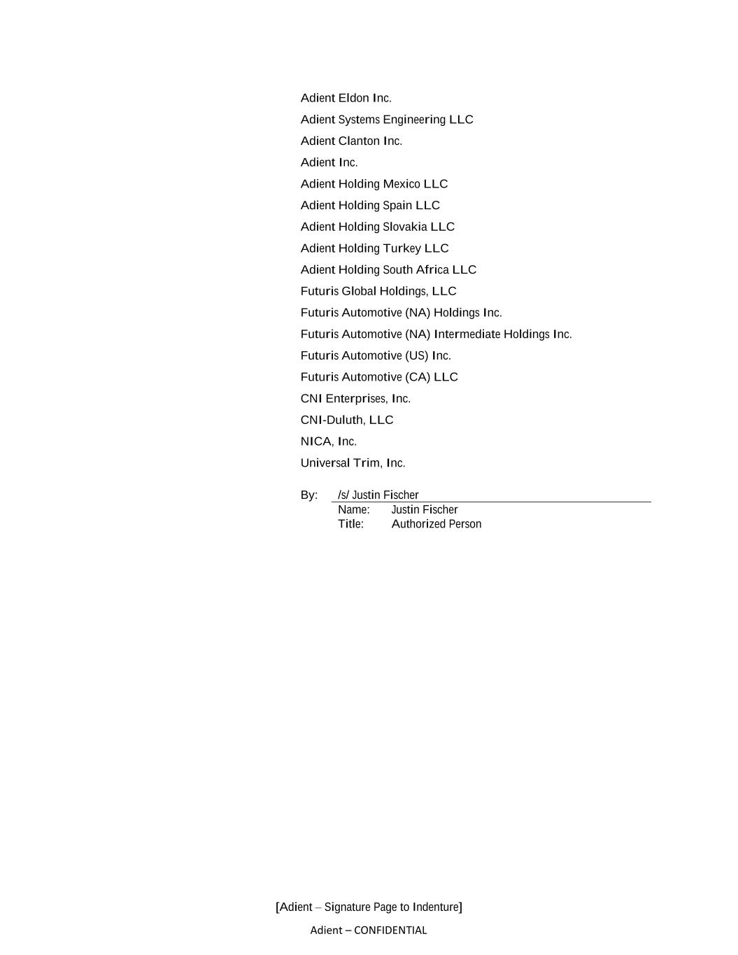 [Adient – Signature Page to Indenture] Adient – CONFIDENTIAL Adient Eldon Inc. Adient Systems Engineering LLC Adient Clanton Inc. Adient Inc. Adient Holding Mexico LLC Adient Holding Spain LLC Adient Holding Slovakia LLC Adient Holding Turkey LLC Adient Holding South Africa LLC Futuris Global Holdings, LLC Futuris Automotive (NA) Holdings Inc. Futuris Automotive (NA) Intermediate Holdings Inc. Futuris Automotive (US) Inc. Futuris Automotive (CA) LLC CNI Enterprises, Inc. CNI-Duluth, LLC NICA, Inc. Universal Trim, Inc. By: /s/ Justin Fischer Name: Justin Fischer Title: Authorized Person