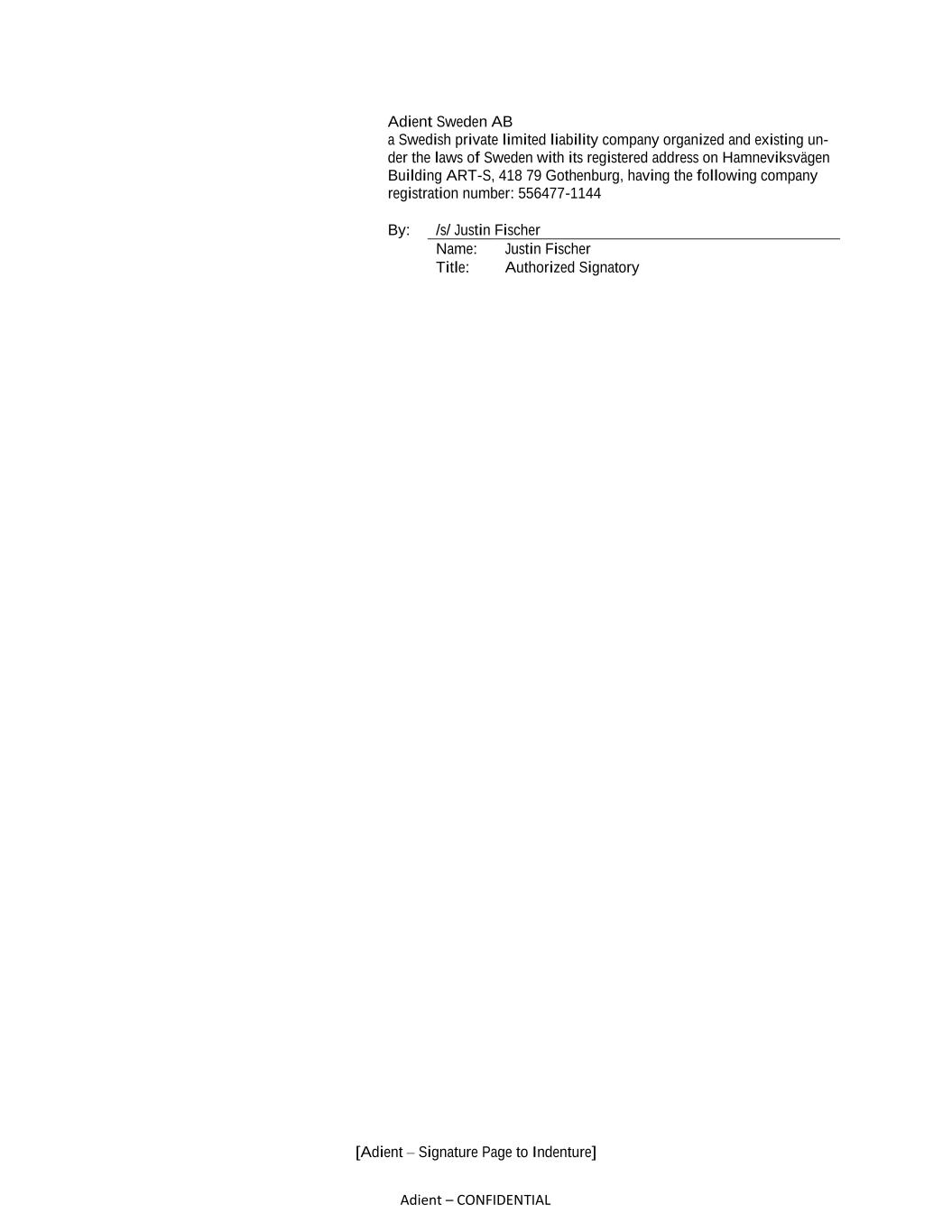 [Adient – Signature Page to Indenture] Adient – CONFIDENTIAL Adient Sweden AB a Swedish private limited liability company organized and existing un- der the laws of Sweden with its registered address on Hamneviksvägen Building ART-S, 418 79 Gothenburg, having the following company registration number: 556477-1144 By: /s/ Justin Fischer Name: Justin Fischer Title: Authorized Signatory