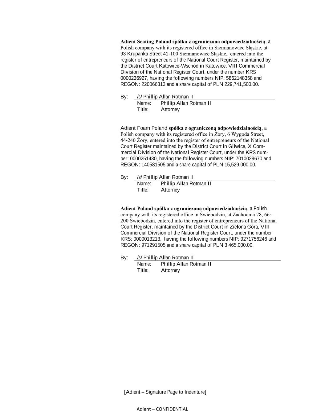 [Adient – Signature Page to Indenture] Adient – CONFIDENTIAL Adient Seating Poland spółka z ograniczoną odpowiedzialnością, a Polish company with its registered office in Siemianowice Śląskie, at 93 Krupanka Street 41-100 Siemianowice Śląskie, entered into the register of entrepreneurs of the National Court Register, maintained by the District Court Katowice-Wschód in Katowice, VIII Commercial Division of the National Register Court, under the number KRS 0000236927, having the following numbers NIP: 5862148358 and REGON: 220066313 and a share capital of PLN 229,741,500.00. By: /s/ Phillip Allan Rotman II Name: Phillip Allan Rotman II Title: Attorney Adient Foam Poland spółka z ograniczoną odpowiedzialnością, a Polish company with its registered office in Żory, 6 Wygoda Street, 44-240 Żory, entered into the register of entrepreneurs of the National Court Register maintained by the District Court in Gliwice, X Com- mercial Division of the National Register Court, under the KRS num- ber: 0000251430, having the following numbers NIP: 7010029670 and REGON: 140581505 and a share capital of PLN 15,529,000.00. By: /s/ Phillip Allan Rotman II Name: Phillip Allan Rotman II Title: Attorney Adient Poland spółka z ograniczoną odpowiedzialnością, a Polish company with its registered office in Świebodzin, at Zachodnia 78, 66- 200 Świebodzin, entered into the register of entrepreneurs of the National Court Register, maintained by the District Court in Zielona Góra, VIII Commercial Division of the National Register Court, under the number KRS: 0000013213, having the following numbers NIP: 9271756246 and REGON: 971291505 and a share capital of PLN 3,465,000.00. By: /s/ Phillip Allan Rotman II Name: Phillip Allan Rotman II Title: Attorney