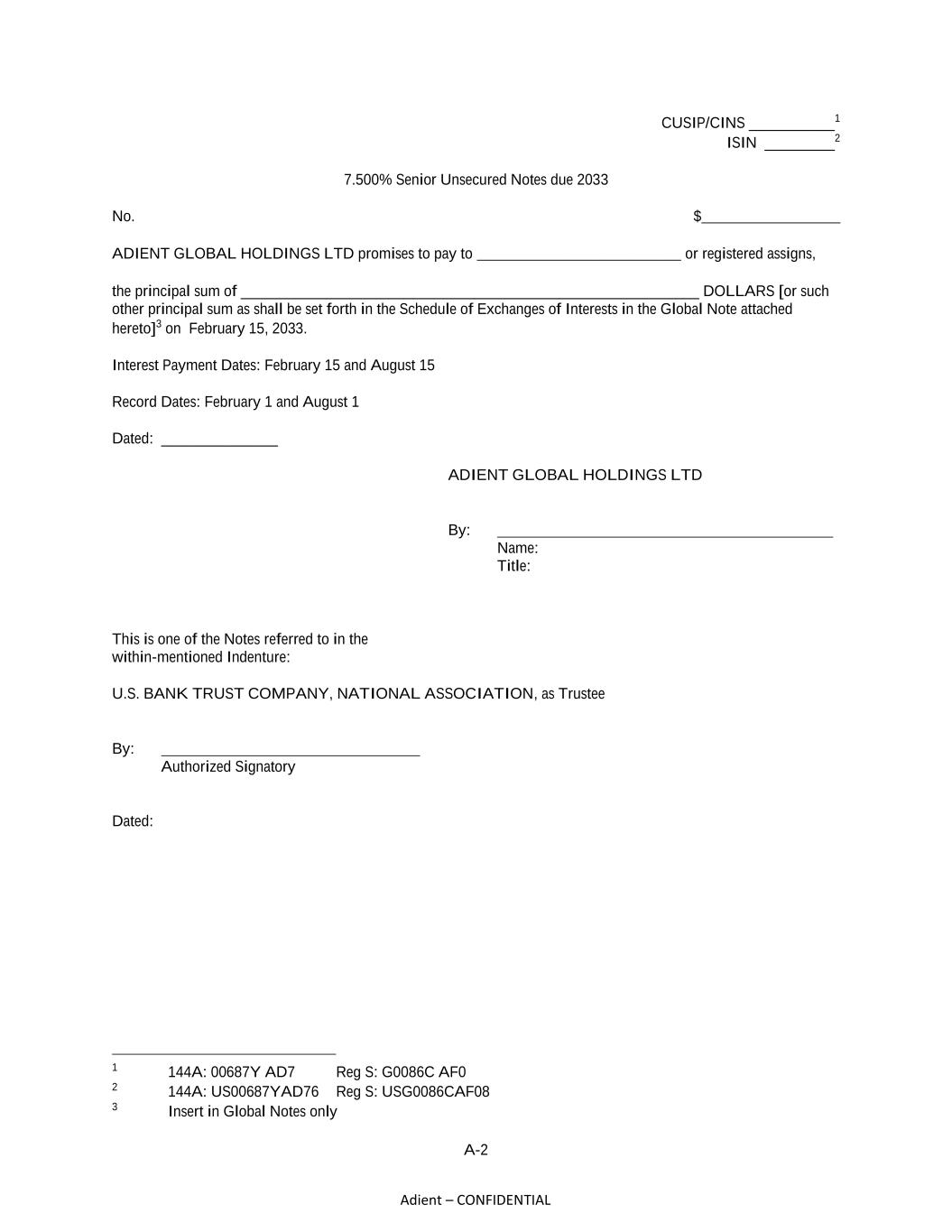 A-2 Adient – CONFIDENTIAL CUSIP/CINS ___________1 ISIN _________2 7.500% Senior Unsecured Notes due 2033 No. $_________________ ADIENT GLOBAL HOLDINGS LTD promises to pay to _________________________ or registered assigns, the principal sum of ___________________________________________________________ DOLLARS [or such other principal sum as shall be set forth in the Schedule of Exchanges of Interests in the Global Note attached hereto]3 on February 15, 2033. Interest Payment Dates: February 15 and August 15 Record Dates: February 1 and August 1 Dated: _______________ ADIENT GLOBAL HOLDINGS LTD By: Name: Title: This is one of the Notes referred to in the within-mentioned Indenture: U.S. BANK TRUST COMPANY, NATIONAL ASSOCIATION, as Trustee By: Authorized Signatory Dated: 1 144A: 00687Y AD7 Reg S: G0086C AF0 2 144A: US00687YAD76 Reg S: USG0086CAF08 3 Insert in Global Notes only