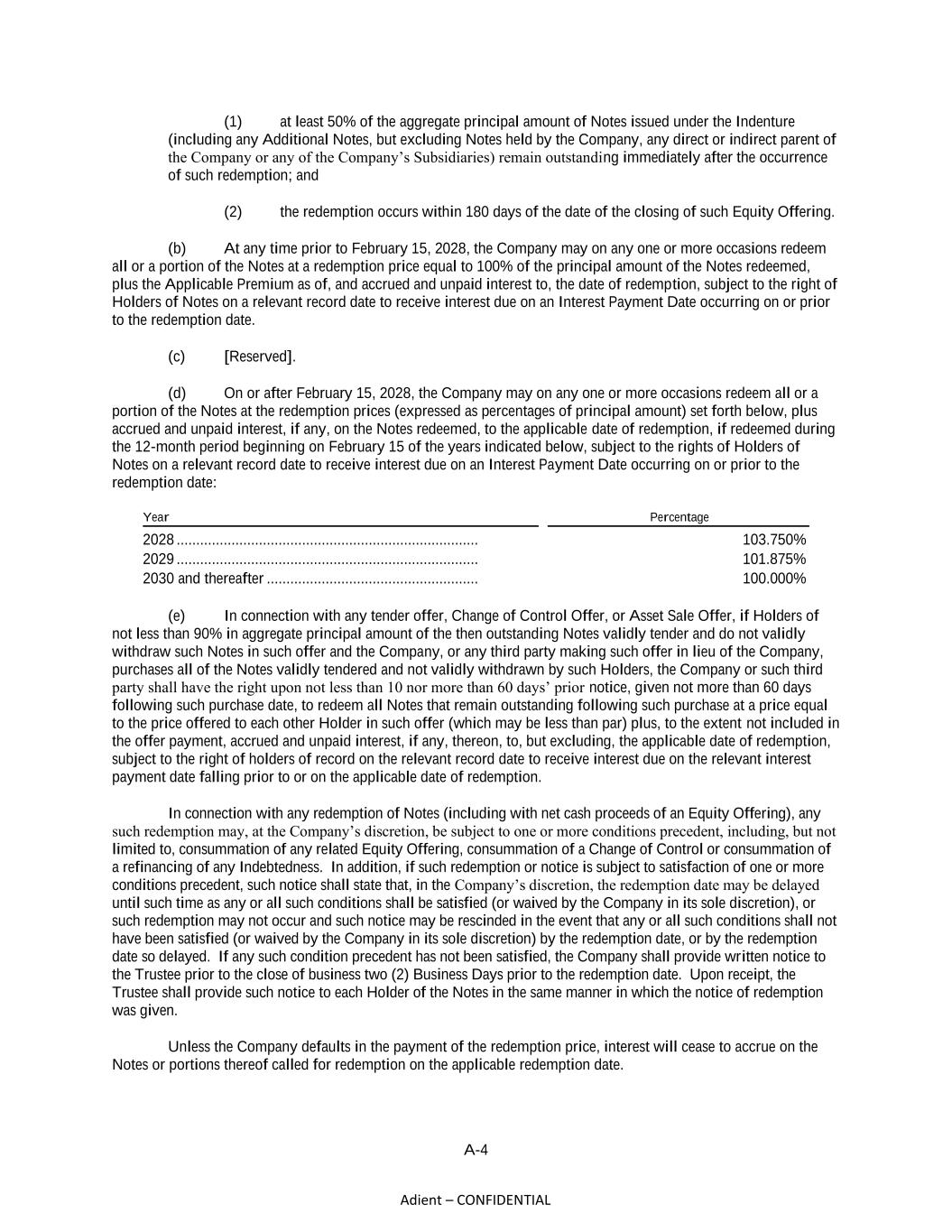 A-4 Adient – CONFIDENTIAL (1) at least 50% of the aggregate principal amount of Notes issued under the Indenture (including any Additional Notes, but excluding Notes held by the Company, any direct or indirect parent of the Company or any of the Company’s Subsidiaries) remain outstanding immediately after the occurrence of such redemption; and (2) the redemption occurs within 180 days of the date of the closing of such Equity Offering. (b) At any time prior to February 15, 2028, the Company may on any one or more occasions redeem all or a portion of the Notes at a redemption price equal to 100% of the principal amount of the Notes redeemed, plus the Applicable Premium as of, and accrued and unpaid interest to, the date of redemption, subject to the right of Holders of Notes on a relevant record date to receive interest due on an Interest Payment Date occurring on or prior to the redemption date. (c) [Reserved]. (d) On or after February 15, 2028, the Company may on any one or more occasions redeem all or a portion of the Notes at the redemption prices (expressed as percentages of principal amount) set forth below, plus accrued and unpaid interest, if any, on the Notes redeemed, to the applicable date of redemption, if redeemed during the 12-month period beginning on February 15 of the years indicated below, subject to the rights of Holders of Notes on a relevant record date to receive interest due on an Interest Payment Date occurring on or prior to the redemption date: Year Percentage 2028 ............................................................................. 103.750% 2029 ............................................................................. 101.875% 2030 and thereafter ...................................................... 100.000% (e) In connection with any tender offer, Change of Control Offer, or Asset Sale Offer, if Holders of not less than 90% in aggregate principal amount of the then outstanding Notes validly tender and do not validly withdraw such Notes in such offer and the Company, or any third party making such offer in lieu of the Company, purchases all of the Notes validly tendered and not validly withdrawn by such Holders, the Company or such third party shall have the right upon not less than 10 nor more than 60 days’ prior notice, given not more than 60 days following such purchase date, to redeem all Notes that remain outstanding following such purchase at a price equal to the price offered to each other Holder in such offer (which may be less than par) plus, to the extent not included in the offer payment, accrued and unpaid interest, if any, thereon, to, but excluding, the applicable date of redemption, subject to the right of holders of record on the relevant record date to receive interest due on the relevant interest payment date falling prior to or on the applicable date of redemption. In connection with any redemption of Notes (including with net cash proceeds of an Equity Offering), any such redemption may, at the Company’s discretion, be subject to one or more conditions precedent, including, but not limited to, consummation of any related Equity Offering, consummation of a Change of Control or consummation of a refinancing of any Indebtedness. In addition, if such redemption or notice is subject to satisfaction of one or more conditions precedent, such notice shall state that, in the Company’s discretion, the redemption date may be delayed until such time as any or all such conditions shall be satisfied (or waived by the Company in its sole discretion), or such redemption may not occur and such notice may be rescinded in the event that any or all such conditions shall not have been satisfied (or waived by the Company in its sole discretion) by the redemption date, or by the redemption date so delayed. If any such condition precedent has not been satisfied, the Company shall provide written notice to the Trustee prior to the close of business two (2) Business Days prior to the redemption date. Upon receipt, the Trustee shall provide such notice to each Holder of the Notes in the same manner in which the notice of redemption was given. Unless the Company defaults in the payment of the redemption price, interest will cease to accrue on the Notes or portions thereof called for redemption on the applicable redemption date.