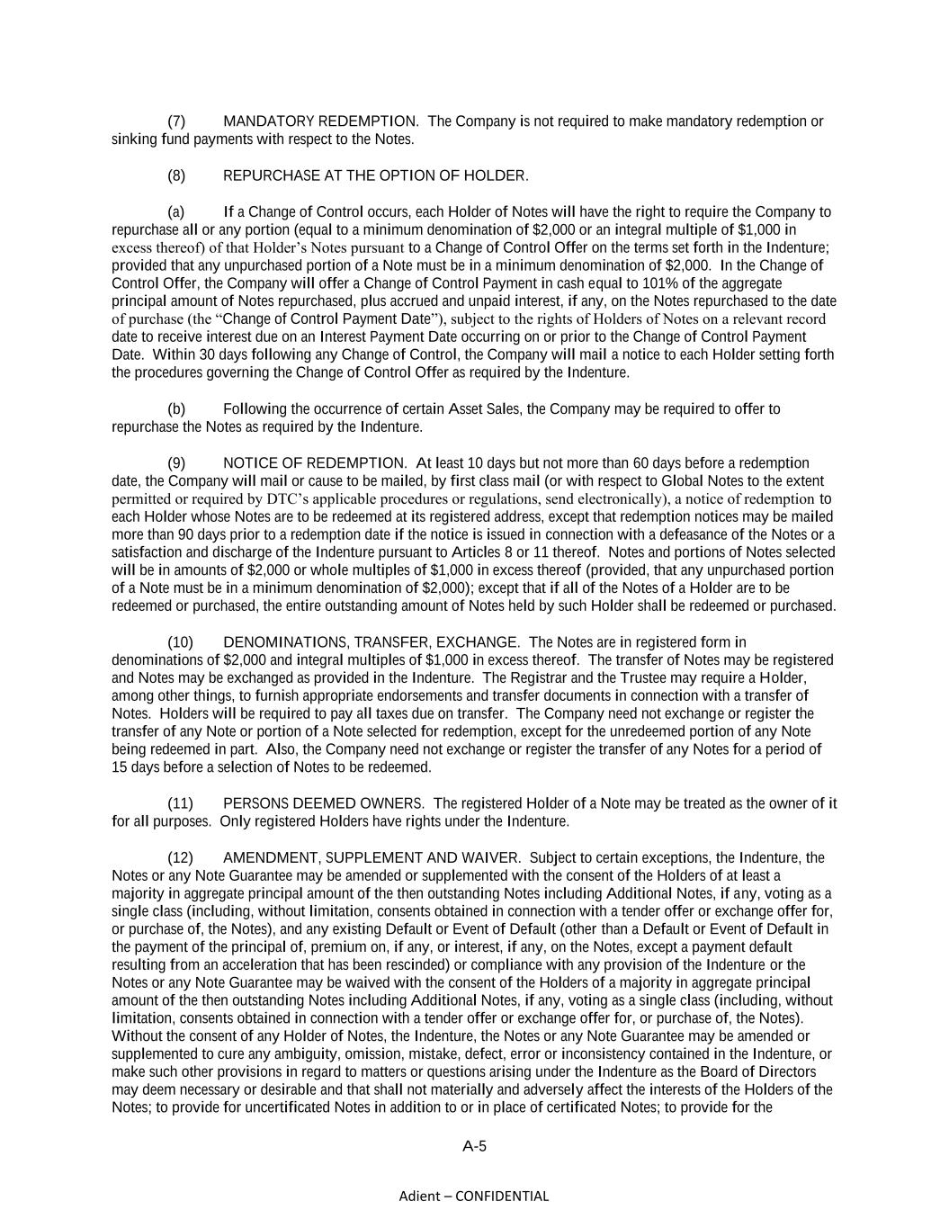 A-5 Adient – CONFIDENTIAL (7) MANDATORY REDEMPTION. The Company is not required to make mandatory redemption or sinking fund payments with respect to the Notes. (8) REPURCHASE AT THE OPTION OF HOLDER. (a) If a Change of Control occurs, each Holder of Notes will have the right to require the Company to repurchase all or any portion (equal to a minimum denomination of $2,000 or an integral multiple of $1,000 in excess thereof) of that Holder’s Notes pursuant to a Change of Control Offer on the terms set forth in the Indenture; provided that any unpurchased portion of a Note must be in a minimum denomination of $2,000. In the Change of Control Offer, the Company will offer a Change of Control Payment in cash equal to 101% of the aggregate principal amount of Notes repurchased, plus accrued and unpaid interest, if any, on the Notes repurchased to the date of purchase (the “Change of Control Payment Date”), subject to the rights of Holders of Notes on a relevant record date to receive interest due on an Interest Payment Date occurring on or prior to the Change of Control Payment Date. Within 30 days following any Change of Control, the Company will mail a notice to each Holder setting forth the procedures governing the Change of Control Offer as required by the Indenture. (b) Following the occurrence of certain Asset Sales, the Company may be required to offer to repurchase the Notes as required by the Indenture. (9) NOTICE OF REDEMPTION. At least 10 days but not more than 60 days before a redemption date, the Company will mail or cause to be mailed, by first class mail (or with respect to Global Notes to the extent permitted or required by DTC’s applicable procedures or regulations, send electronically), a notice of redemption to each Holder whose Notes are to be redeemed at its registered address, except that redemption notices may be mailed more than 90 days prior to a redemption date if the notice is issued in connection with a defeasance of the Notes or a satisfaction and discharge of the Indenture pursuant to Articles 8 or 11 thereof. Notes and portions of Notes selected will be in amounts of $2,000 or whole multiples of $1,000 in excess thereof (provided, that any unpurchased portion of a Note must be in a minimum denomination of $2,000); except that if all of the Notes of a Holder are to be redeemed or purchased, the entire outstanding amount of Notes held by such Holder shall be redeemed or purchased. (10) DENOMINATIONS, TRANSFER, EXCHANGE. The Notes are in registered form in denominations of $2,000 and integral multiples of $1,000 in excess thereof. The transfer of Notes may be registered and Notes may be exchanged as provided in the Indenture. The Registrar and the Trustee may require a Holder, among other things, to furnish appropriate endorsements and transfer documents in connection with a transfer of Notes. Holders will be required to pay all taxes due on transfer. The Company need not exchange or register the transfer of any Note or portion of a Note selected for redemption, except for the unredeemed portion of any Note being redeemed in part. Also, the Company need not exchange or register the transfer of any Notes for a period of 15 days before a selection of Notes to be redeemed. (11) PERSONS DEEMED OWNERS. The registered Holder of a Note may be treated as the owner of it for all purposes. Only registered Holders have rights under the Indenture. (12) AMENDMENT, SUPPLEMENT AND WAIVER. Subject to certain exceptions, the Indenture, the Notes or any Note Guarantee may be amended or supplemented with the consent of the Holders of at least a majority in aggregate principal amount of the then outstanding Notes including Additional Notes, if any, voting as a single class (including, without limitation, consents obtained in connection with a tender offer or exchange offer for, or purchase of, the Notes), and any existing Default or Event of Default (other than a Default or Event of Default in the payment of the principal of, premium on, if any, or interest, if any, on the Notes, except a payment default resulting from an acceleration that has been rescinded) or compliance with any provision of the Indenture or the Notes or any Note Guarantee may be waived with the consent of the Holders of a majority in aggregate principal amount of the then outstanding Notes including Additional Notes, if any, voting as a single class (including, without limitation, consents obtained in connection with a tender offer or exchange offer for, or purchase of, the Notes). Without the consent of any Holder of Notes, the Indenture, the Notes or any Note Guarantee may be amended or supplemented to cure any ambiguity, omission, mistake, defect, error or inconsistency contained in the Indenture, or make such other provisions in regard to matters or questions arising under the Indenture as the Board of Directors may deem necessary or desirable and that shall not materially and adversely affect the interests of the Holders of the Notes; to provide for uncertificated Notes in addition to or in place of certificated Notes; to provide for the