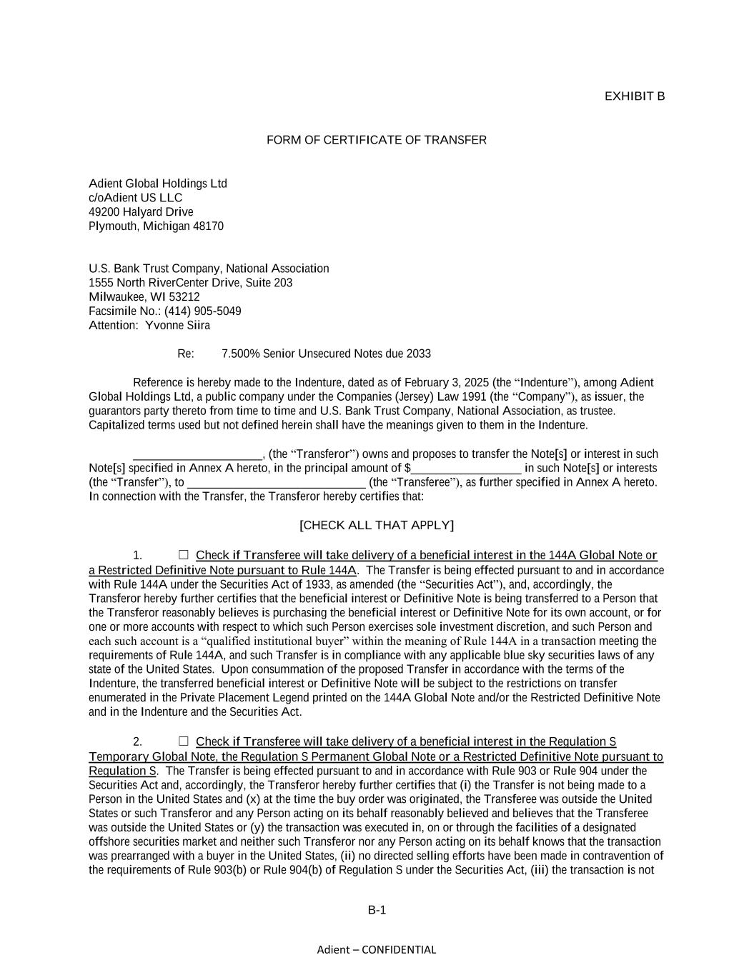 B-1 Adient – CONFIDENTIAL EXHIBIT B FORM OF CERTIFICATE OF TRANSFER Adient Global Holdings Ltd c/oAdient US LLC 49200 Halyard Drive Plymouth, Michigan 48170 U.S. Bank Trust Company, National Association 1555 North RiverCenter Drive, Suite 203 Milwaukee, WI 53212 Facsimile No.: (414) 905-5049 Attention: Yvonne Siira Re: 7.500% Senior Unsecured Notes due 2033 Reference is hereby made to the Indenture, dated as of February 3, 2025 (the “Indenture”), among Adient Global Holdings Ltd, a public company under the Companies (Jersey) Law 1991 (the “Company”), as issuer, the guarantors party thereto from time to time and U.S. Bank Trust Company, National Association, as trustee. Capitalized terms used but not defined herein shall have the meanings given to them in the Indenture. _____________________, (the “Transferor”) owns and proposes to transfer the Note[s] or interest in such Note[s] specified in Annex A hereto, in the principal amount of $__________________ in such Note[s] or interests (the “Transfer”), to _____________________________ (the “Transferee”), as further specified in Annex A hereto. In connection with the Transfer, the Transferor hereby certifies that: [CHECK ALL THAT APPLY] 1. ☐ Check if Transferee will take delivery of a beneficial interest in the 144A Global Note or a Restricted Definitive Note pursuant to Rule 144A. The Transfer is being effected pursuant to and in accordance with Rule 144A under the Securities Act of 1933, as amended (the “Securities Act”), and, accordingly, the Transferor hereby further certifies that the beneficial interest or Definitive Note is being transferred to a Person that the Transferor reasonably believes is purchasing the beneficial interest or Definitive Note for its own account, or for one or more accounts with respect to which such Person exercises sole investment discretion, and such Person and each such account is a “qualified institutional buyer” within the meaning of Rule 144A in a transaction meeting the requirements of Rule 144A, and such Transfer is in compliance with any applicable blue sky securities laws of any state of the United States. Upon consummation of the proposed Transfer in accordance with the terms of the Indenture, the transferred beneficial interest or Definitive Note will be subject to the restrictions on transfer enumerated in the Private Placement Legend printed on the 144A Global Note and/or the Restricted Definitive Note and in the Indenture and the Securities Act. 2. ☐ Check if Transferee will take delivery of a beneficial interest in the Regulation S Temporary Global Note, the Regulation S Permanent Global Note or a Restricted Definitive Note pursuant to Regulation S. The Transfer is being effected pursuant to and in accordance with Rule 903 or Rule 904 under the Securities Act and, accordingly, the Transferor hereby further certifies that (i) the Transfer is not being made to a Person in the United States and (x) at the time the buy order was originated, the Transferee was outside the United States or such Transferor and any Person acting on its behalf reasonably believed and believes that the Transferee was outside the United States or (y) the transaction was executed in, on or through the facilities of a designated offshore securities market and neither such Transferor nor any Person acting on its behalf knows that the transaction was prearranged with a buyer in the United States, (ii) no directed selling efforts have been made in contravention of the requirements of Rule 903(b) or Rule 904(b) of Regulation S under the Securities Act, (iii) the transaction is not